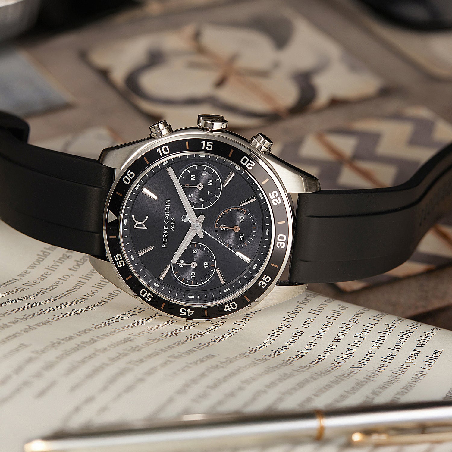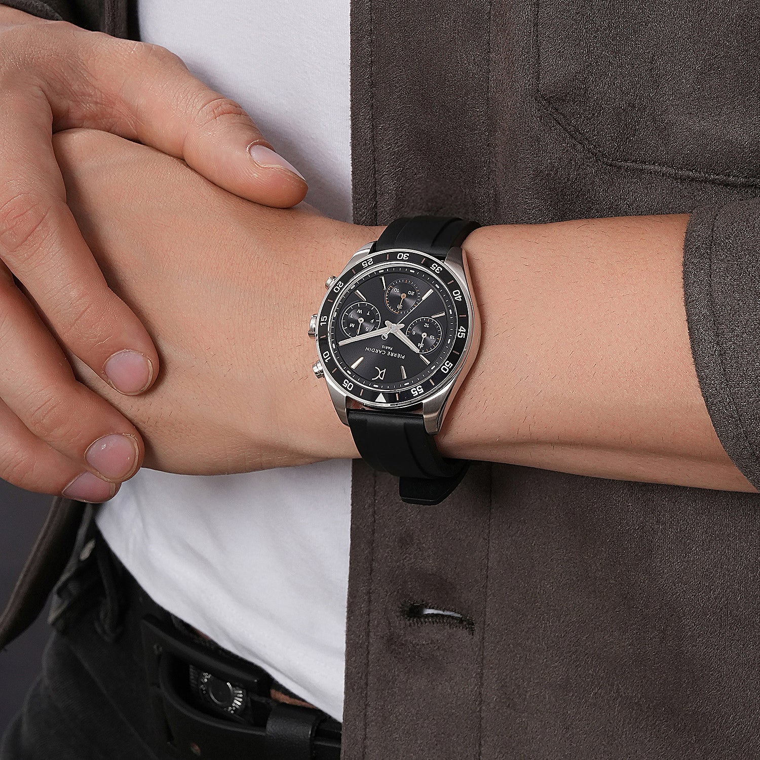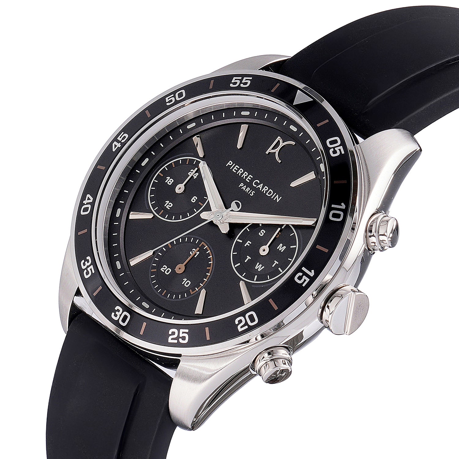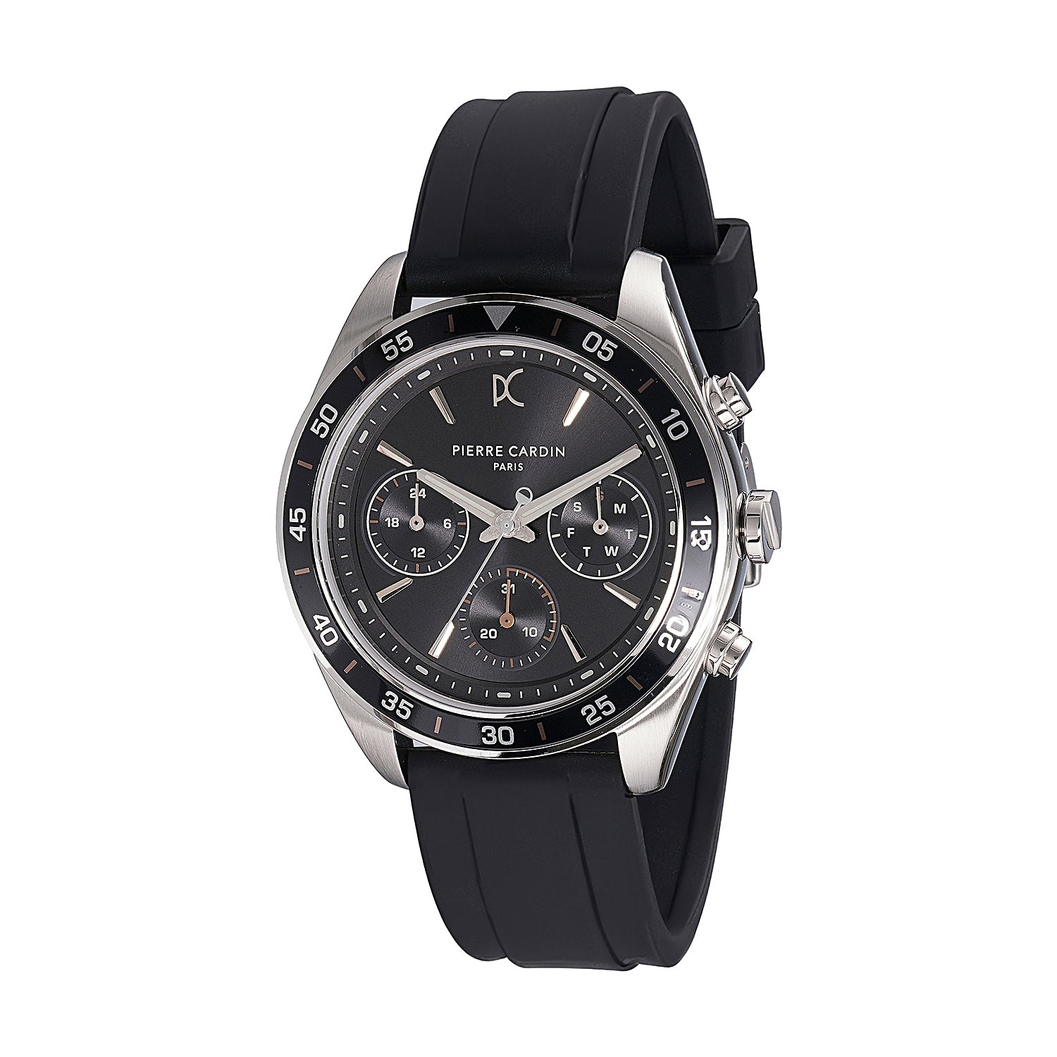 Nation Cristal Men’s 42mm Multifunction Watch - Silver Case, Black Dial, Black Bezel with Black Silicone Strap