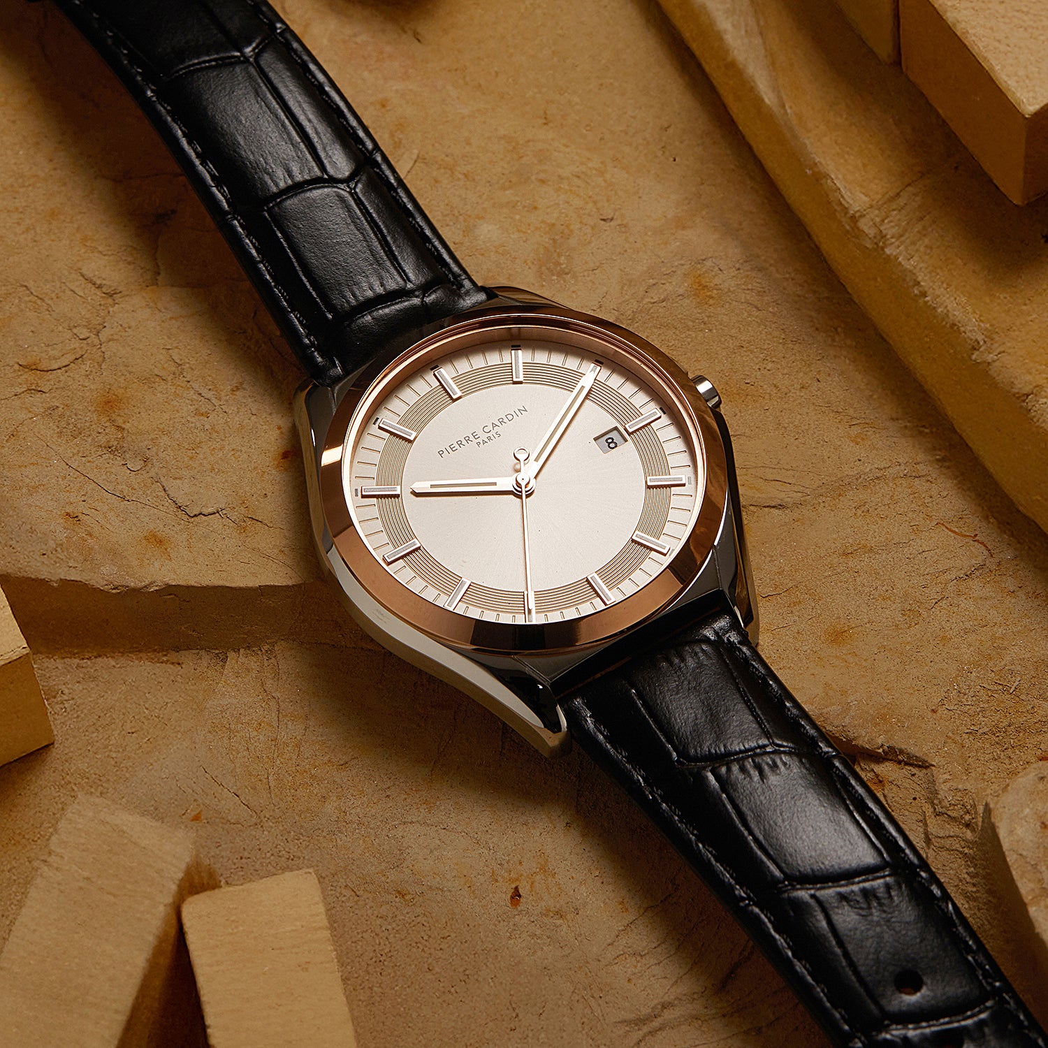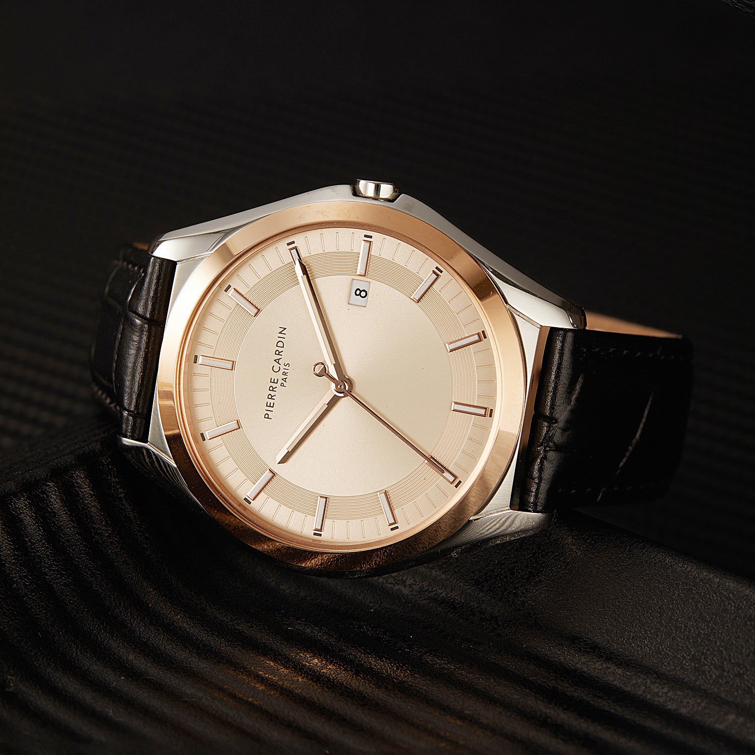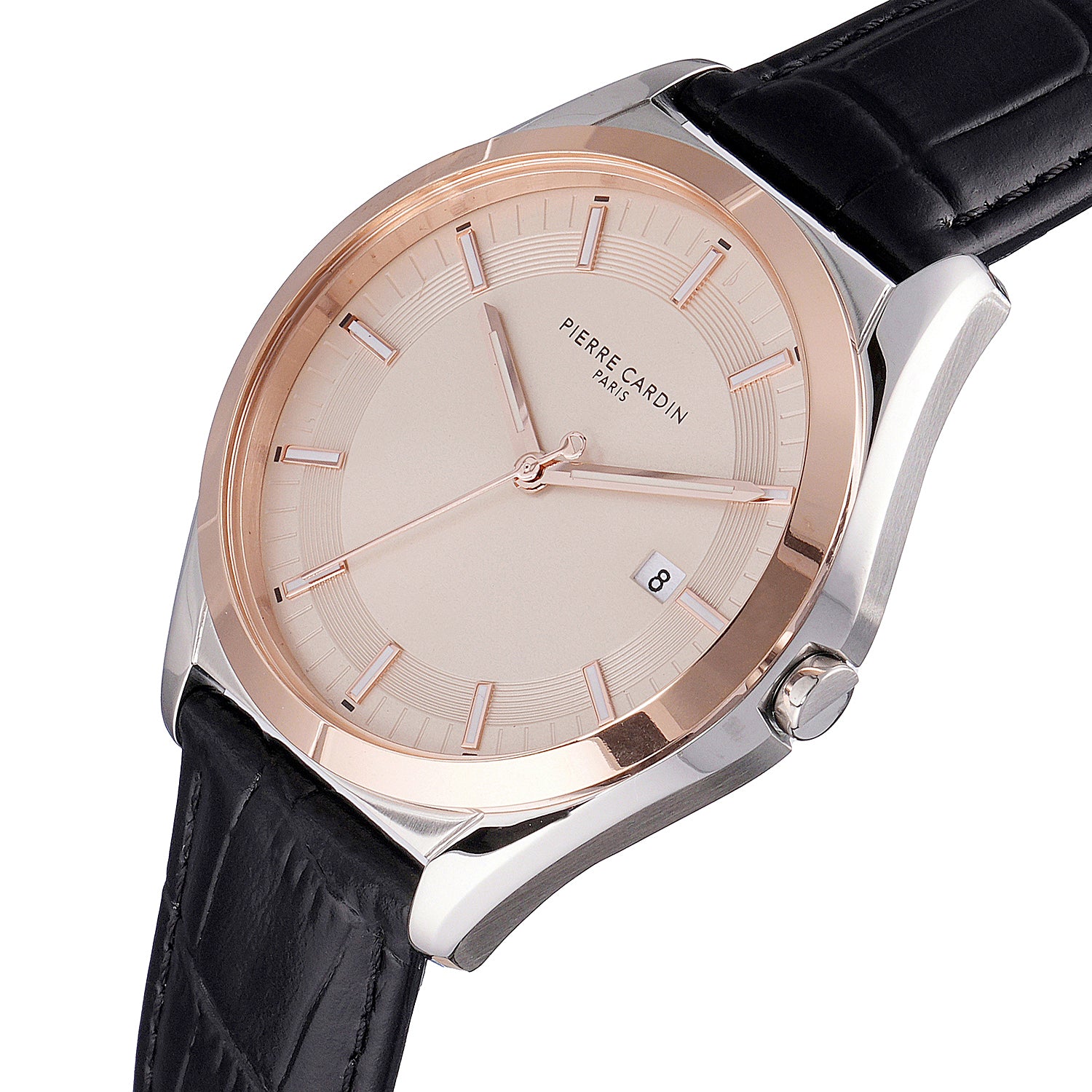 The Vaugirard Aréne men’s watch by Pierre Cardin combines classic elegance with a unique touch of color, featuring a refined 42mm two-tone case in rose gold and silver, paired with a sophisticated salmon dial. Completed with a premium black leather strap, this timepiece is designed for the modern gentleman who values timeless style and quality craftsmanship. Perfect for any occasion, the Vaugirard Aréne watch reflects Pierre Cardin’s legacy of sophistication and attention to detail, adding a distinct flair to your collection.