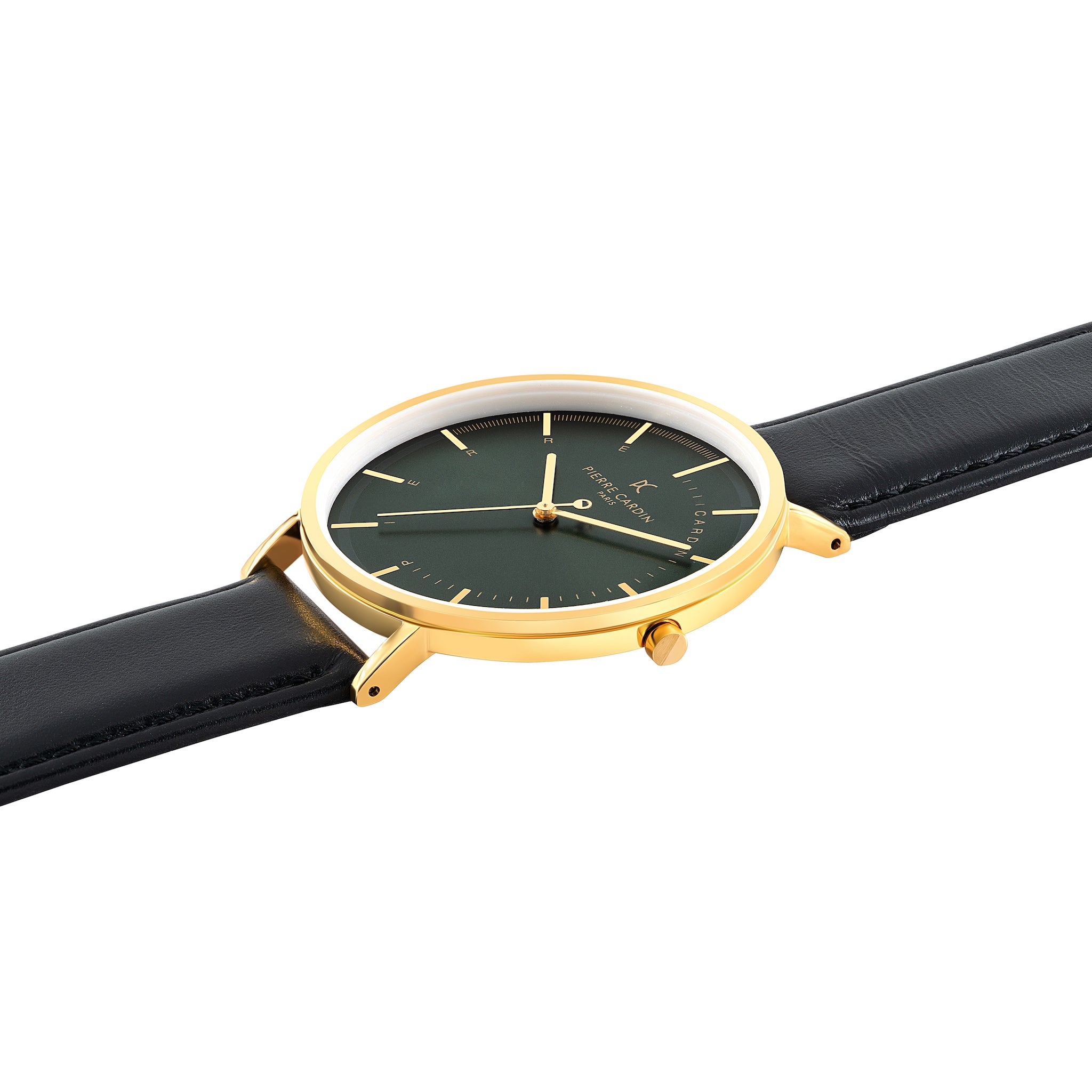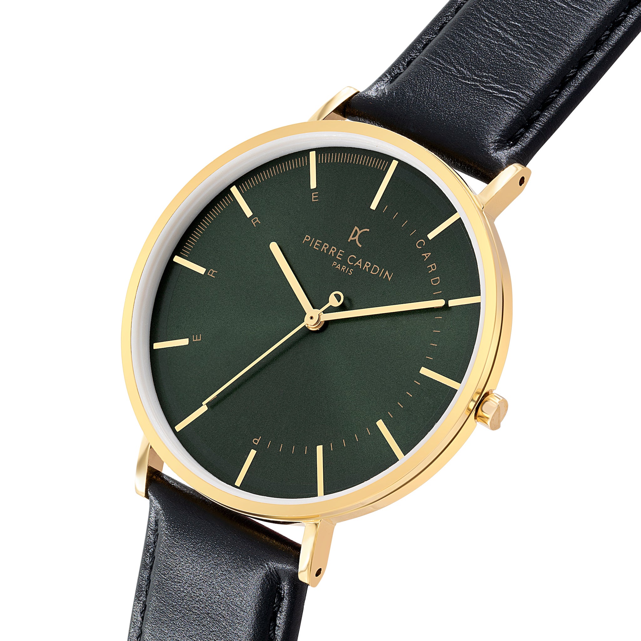 The Bonne Nouvelle leather watch for men is a statement piece that stays close to Pierre Cardin’s iconic design inspired by the cosmopolitan style of the Bonne Nouvelle district. The dial features minimal gold hands, The polished Gold watch case offers a touch of contrast to complement a classic black leather strap, a fine addition to all your outfits night or day.
