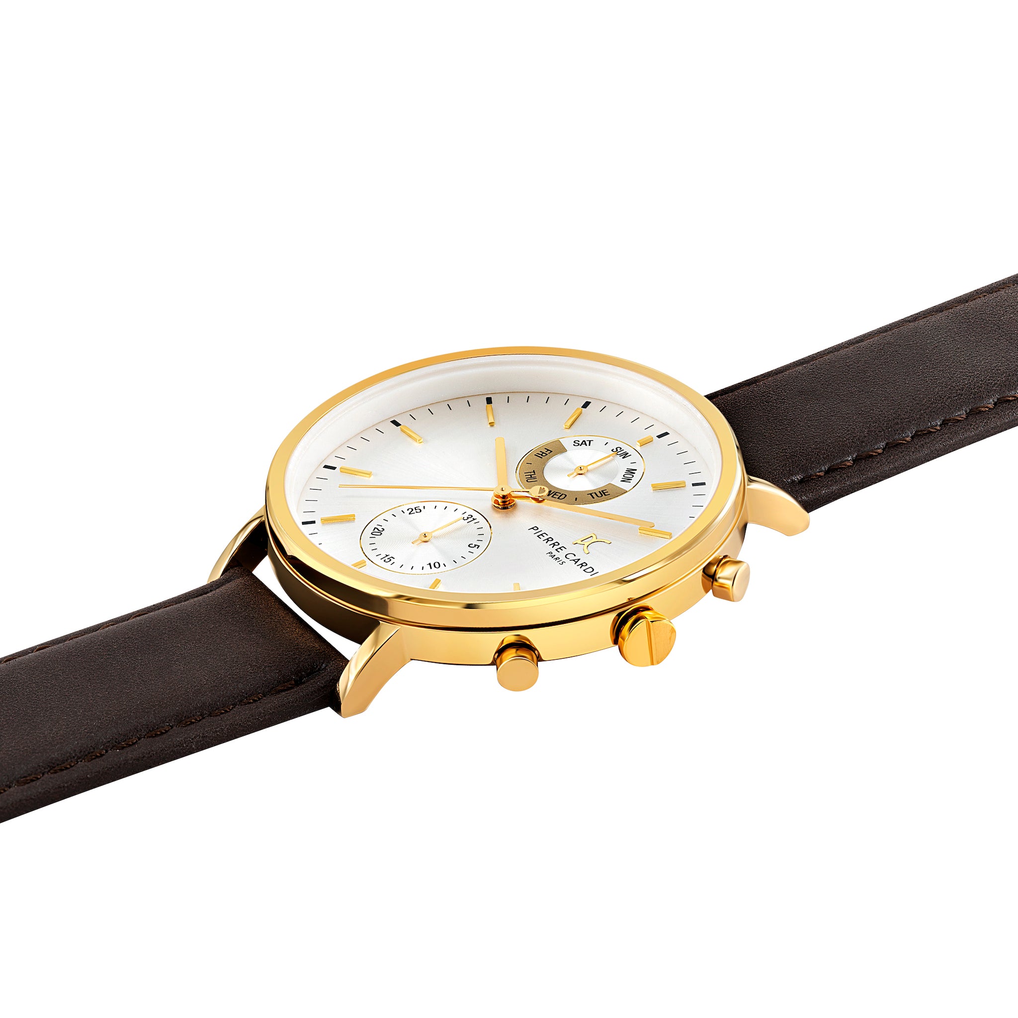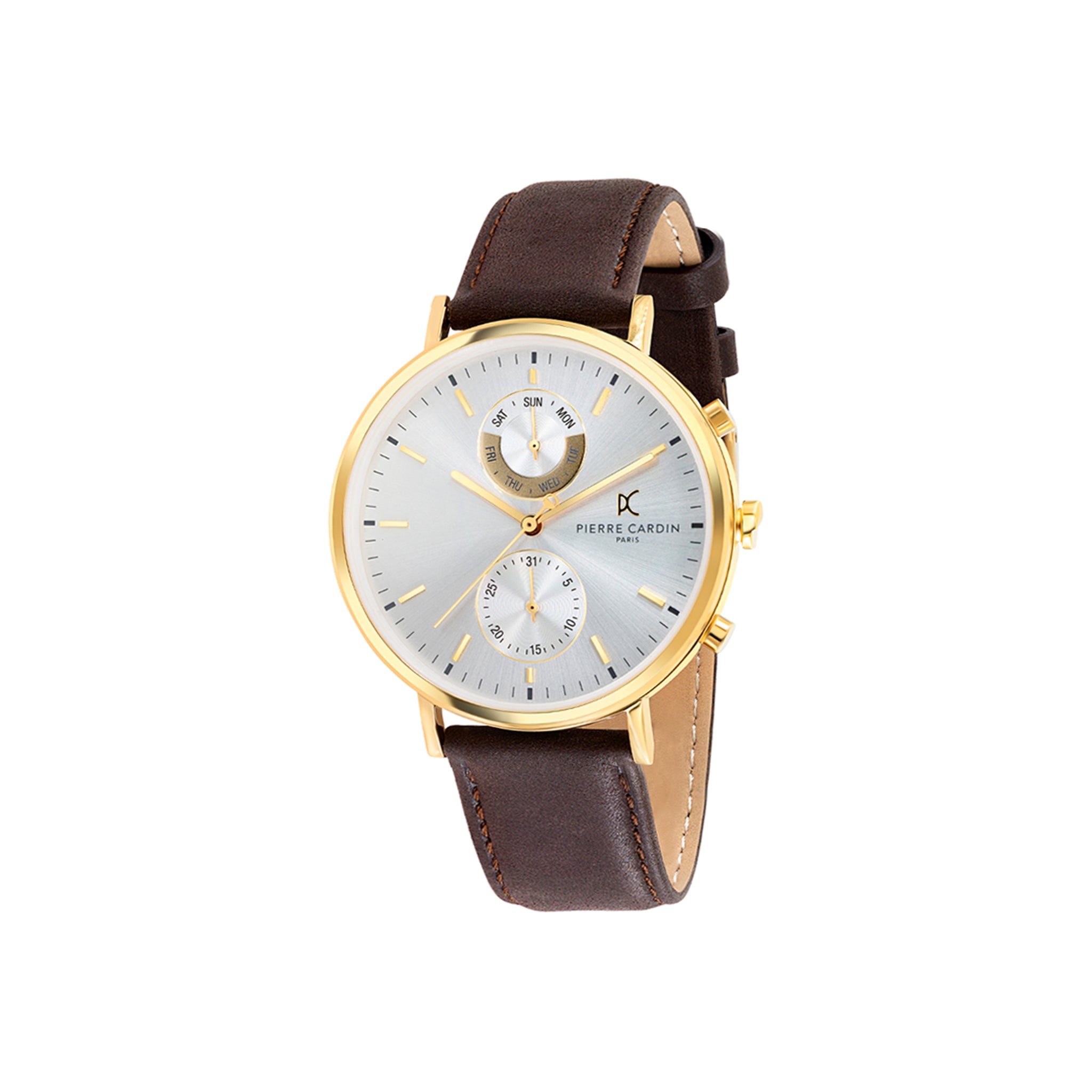 The Bonne Nouvelle leather watch for men is a statement piece that stays close to Pierre Cardin’s iconic design inspired by the cosmopolitan style of the Bonne Nouvelle district. The dial features minimal gold hands, The polished Gold watch case offers a touch of contrast to complement a classic brown leather strap, a fine addition to all your outfits night or day.