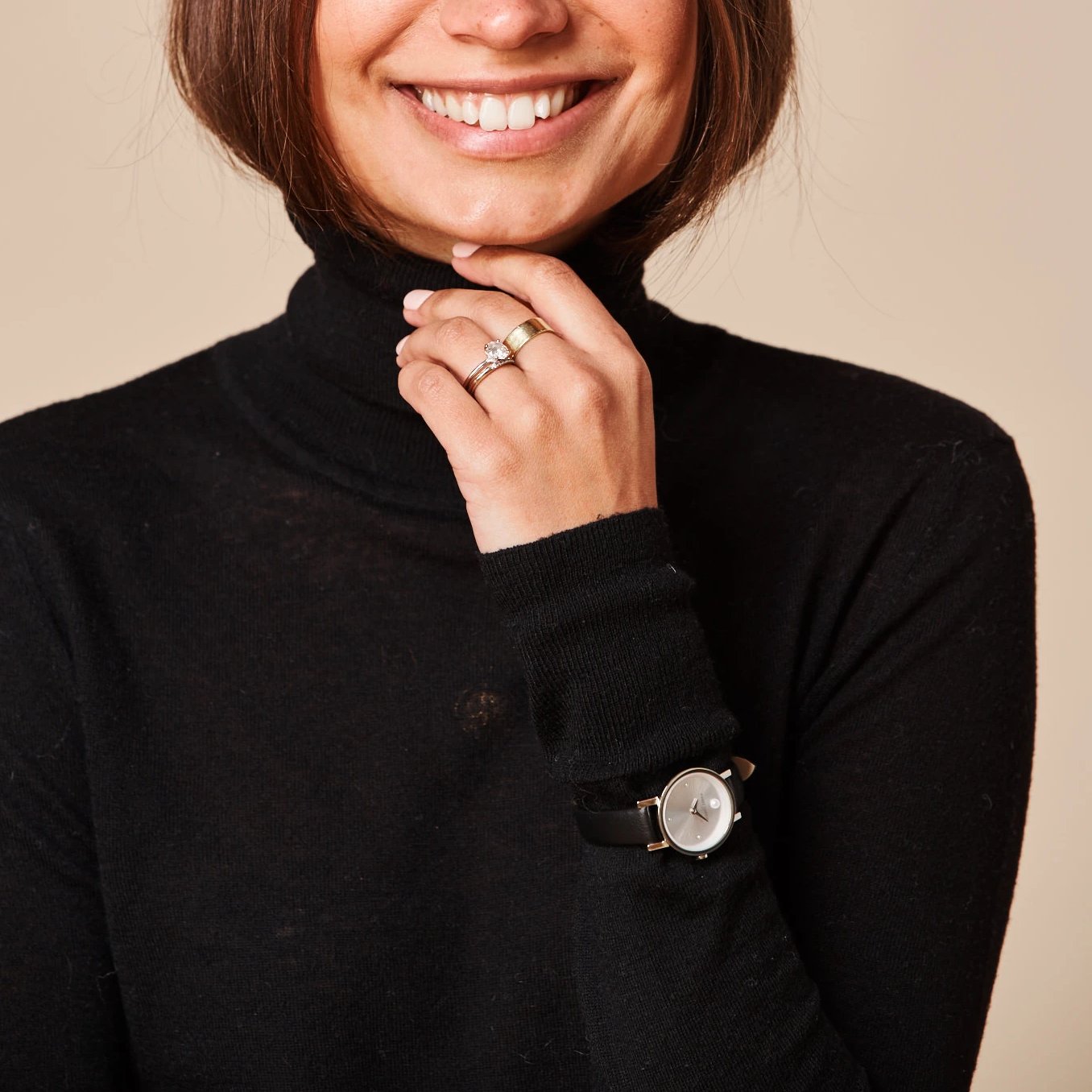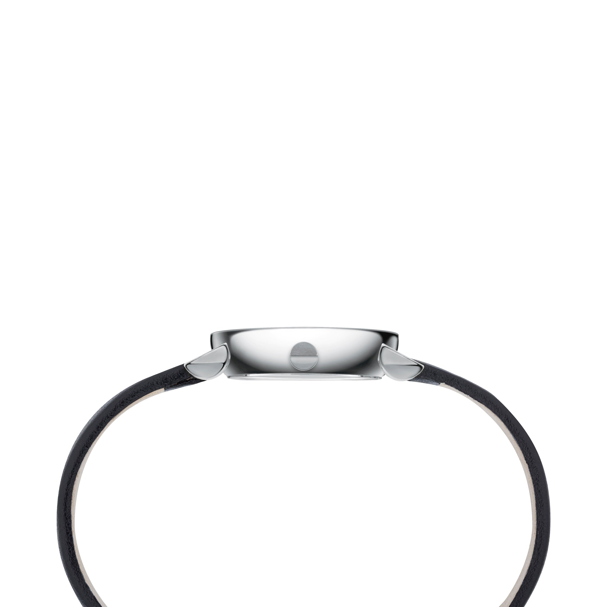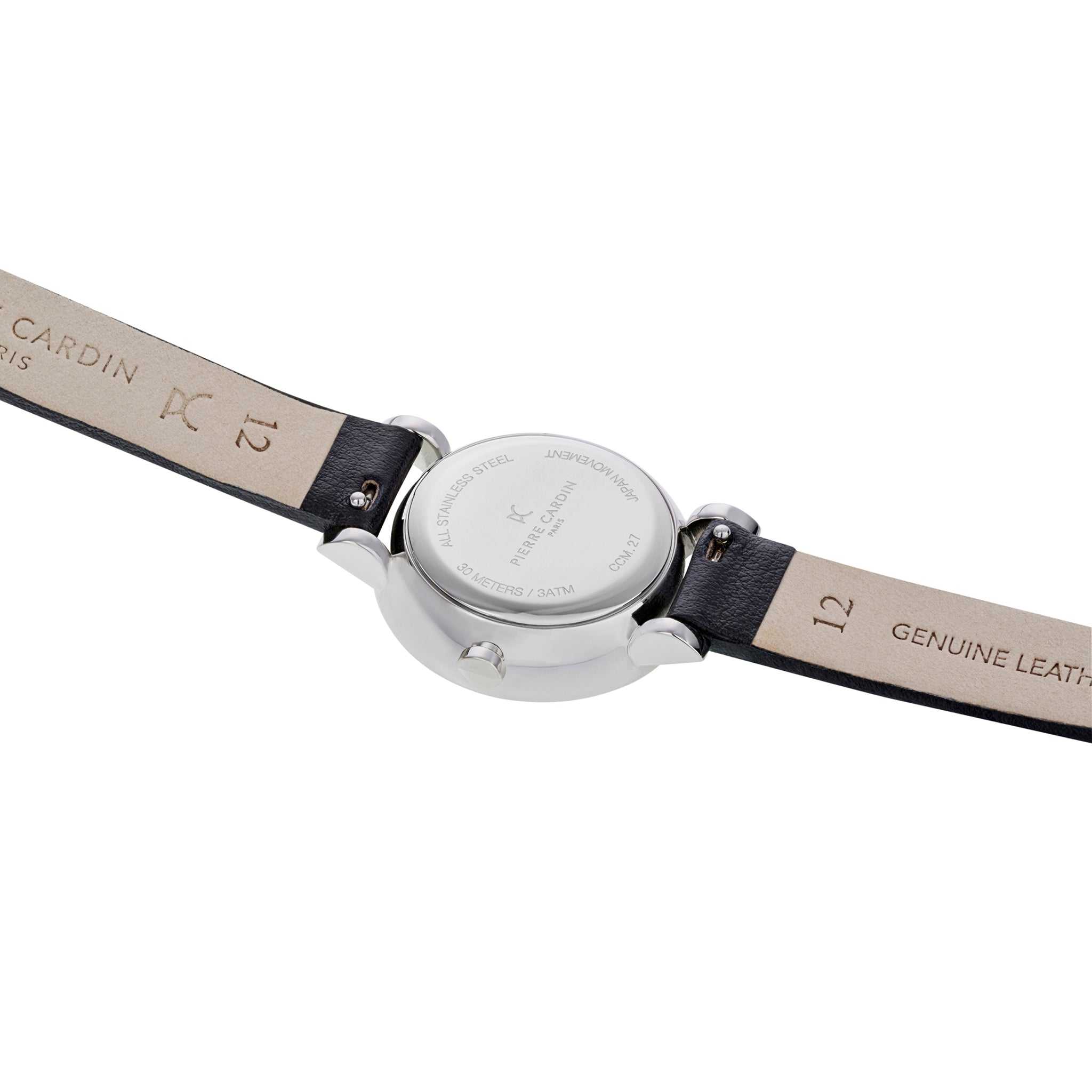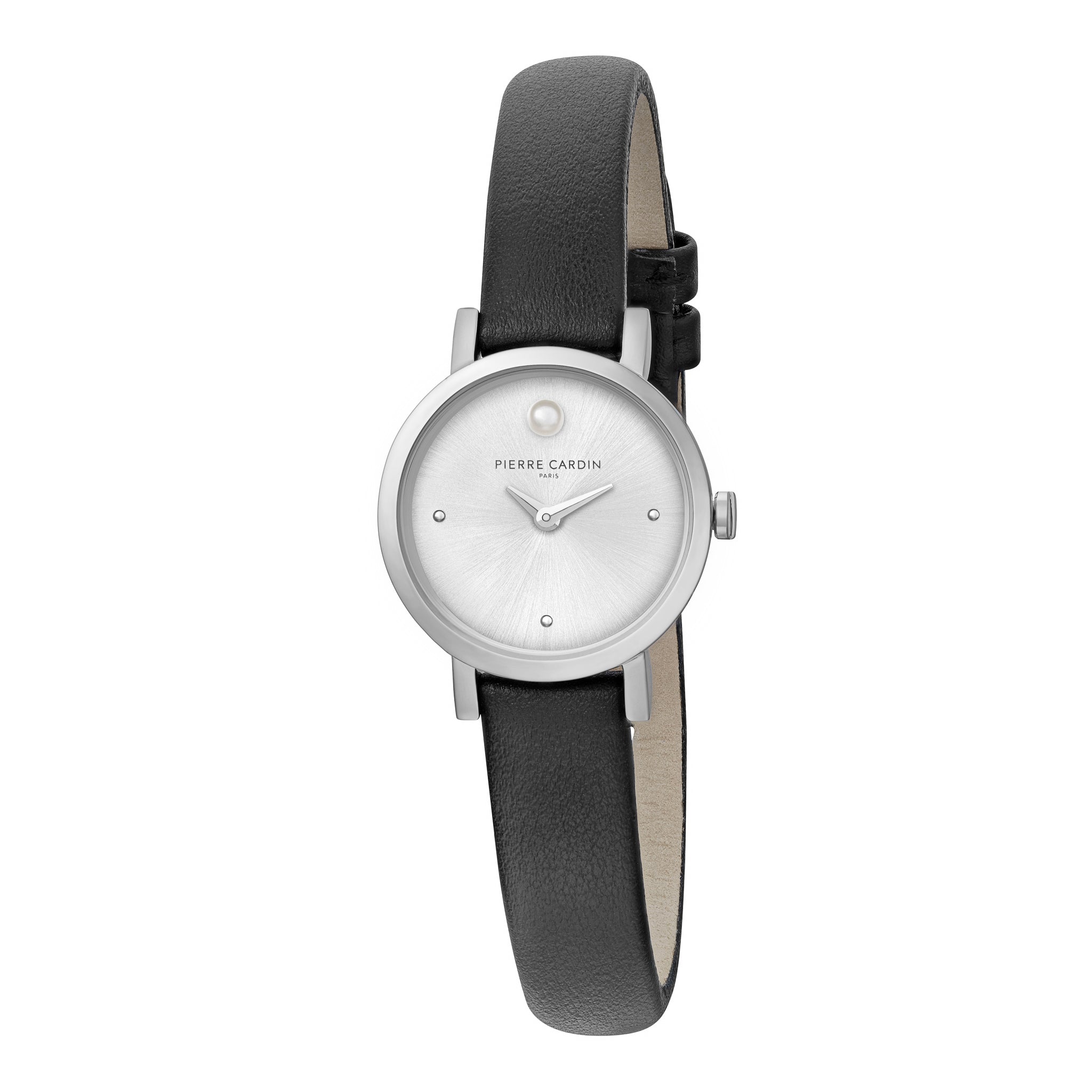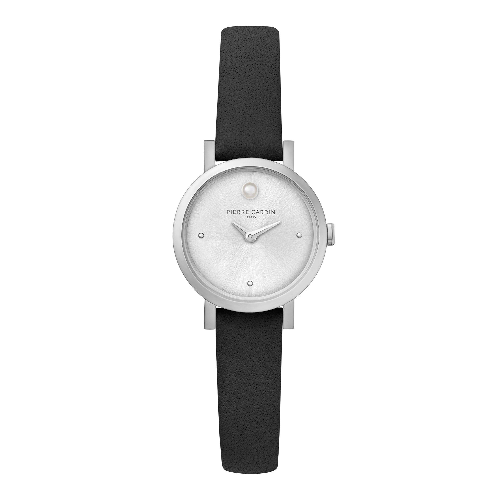 The Canal St Martin Pearls Black Leather Watch is a sophisticated and timeless update to Pierre Cardin's iconic style. Infused with the trendy and upbeat spirit of the Canal St. Martin district, this cool women’s timepiece features a black genuine leather strap, a striking polished silver tone case and a beautiful silver tone sunray dial where a pearl is marking the 12th index.