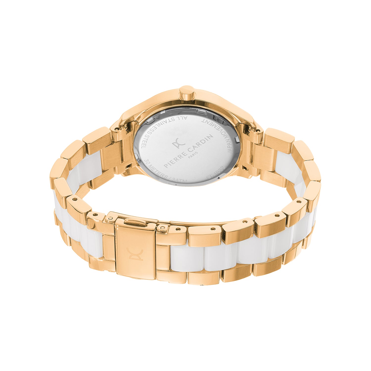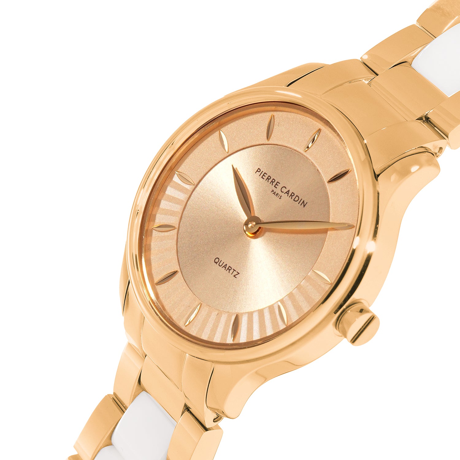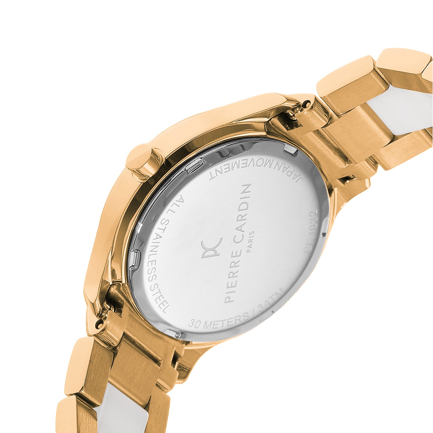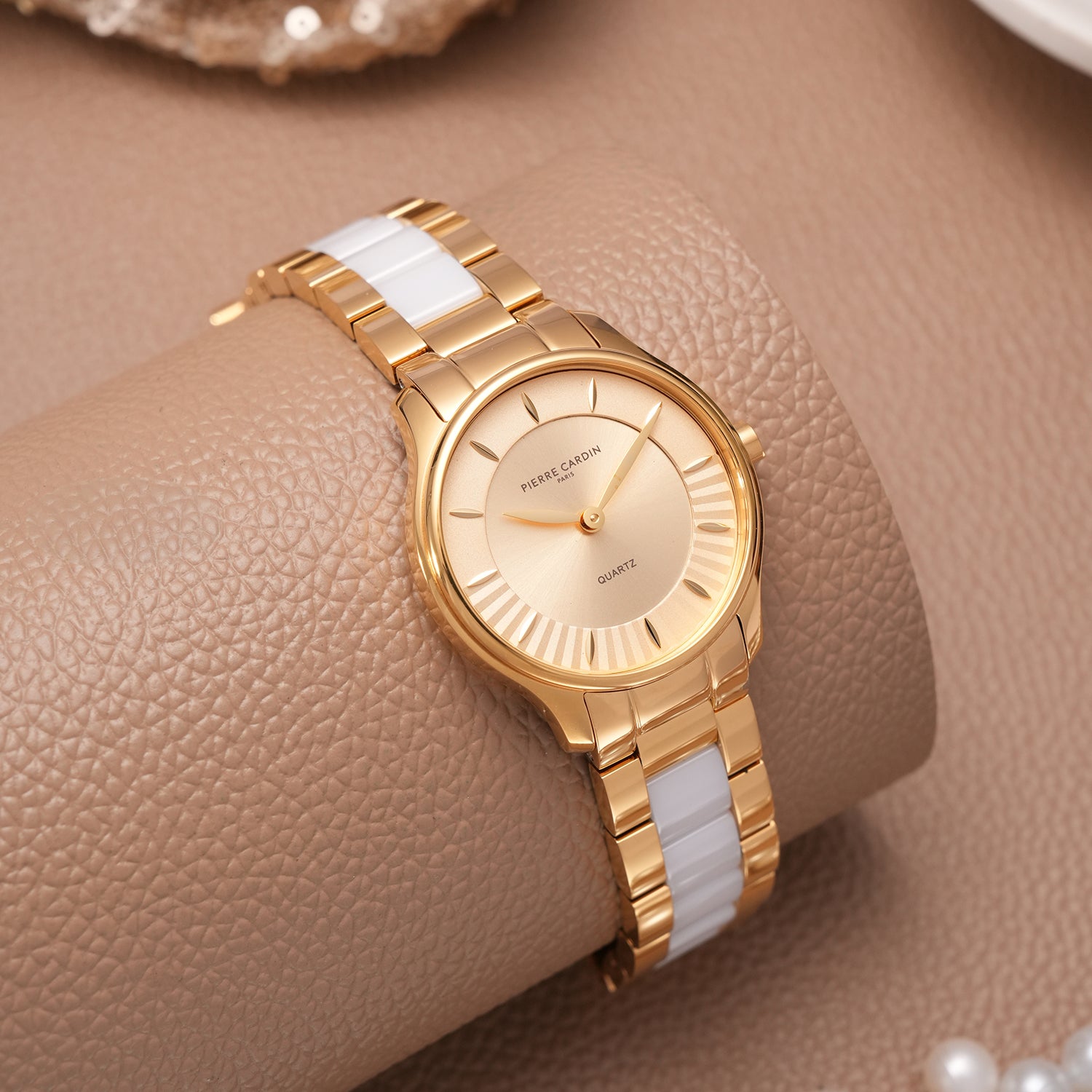 Élitaire Céramique Lady 32mm - Gold with Gold Metal Strap with White Ceramic Links offers a distinct design identity and refined detailing tailored for its signature look. This 32mm timepiece features a Gold dial powered by a Quartz movement from Japan. Encased in Gold with a Gold Metal Strap with White Ceramic Links, it blends durability with refined elegance. Perfect for those who appreciate craftsmanship and everyday versatility, this watch is a modern statement piece that balances functionality and timeless appeal.