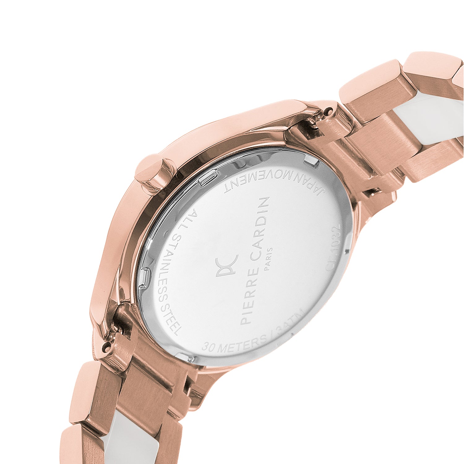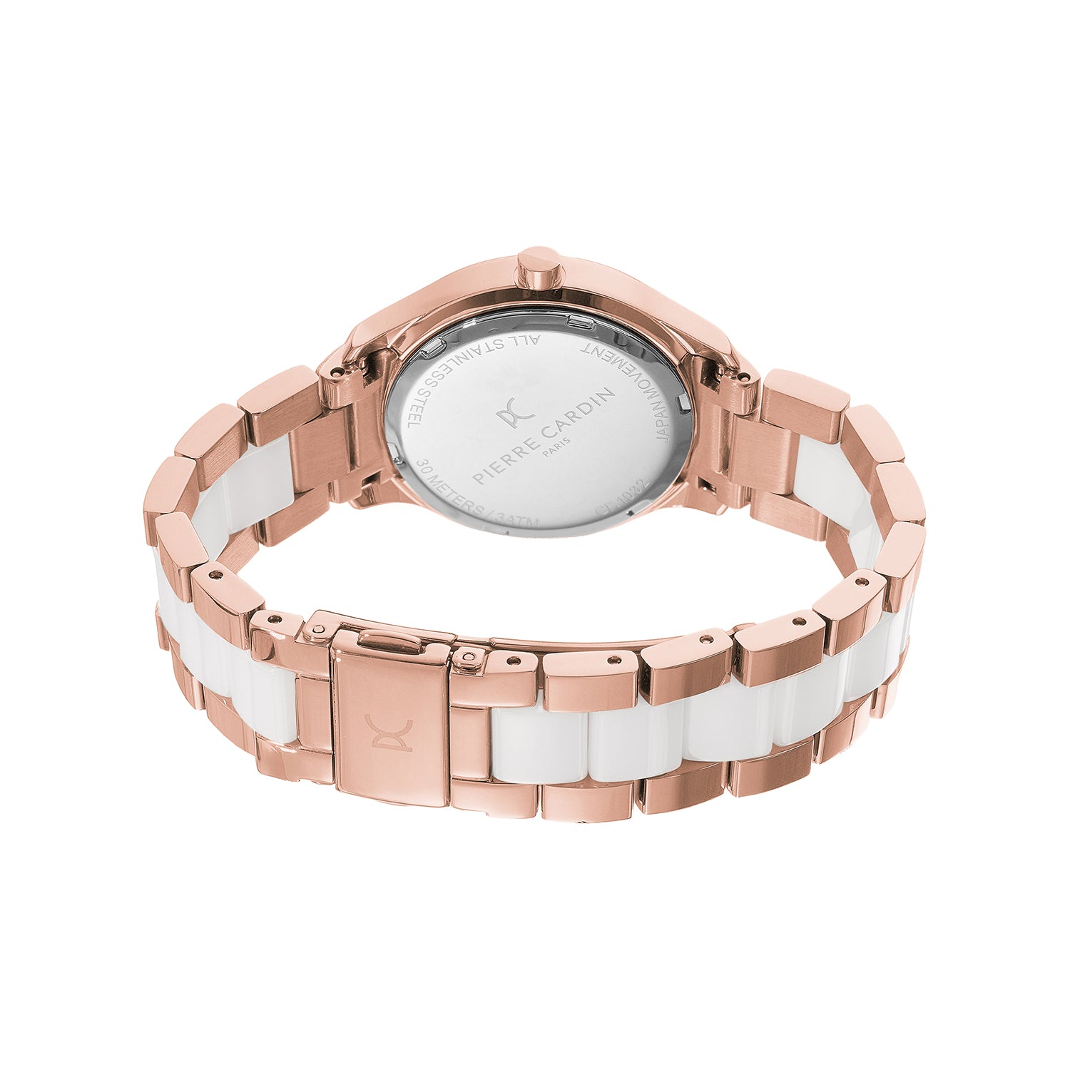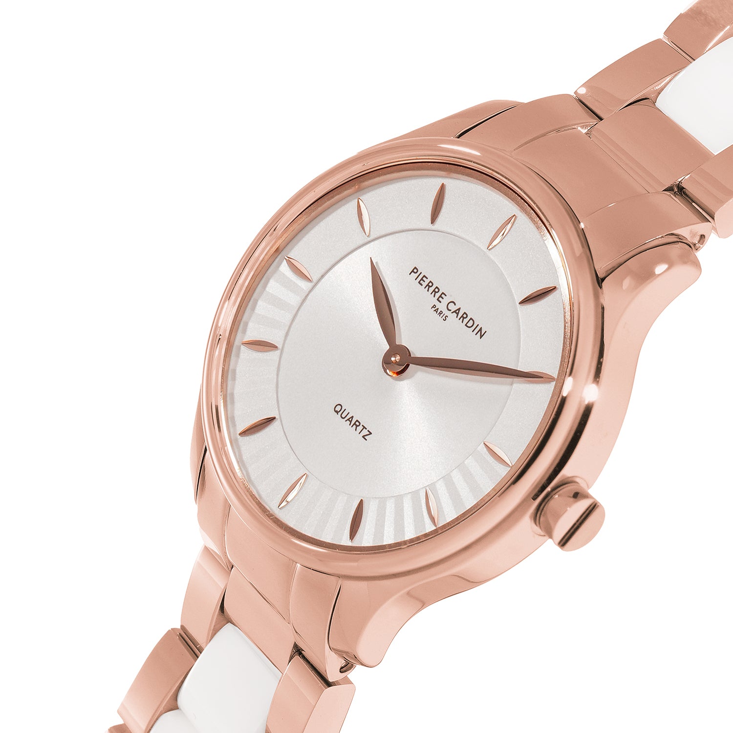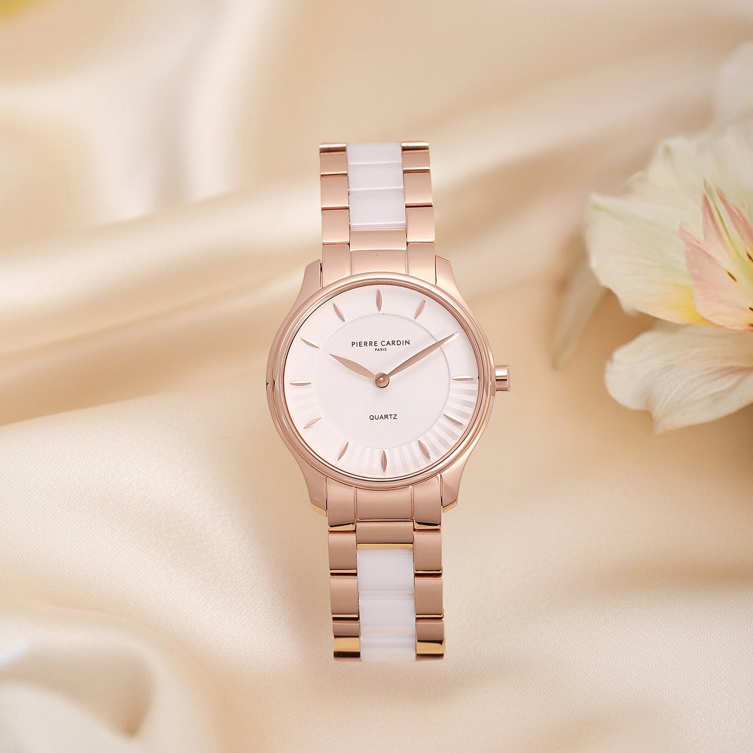 Élitaire Céramique Lady 32mm - Rose Gold with Rose Gold Metal Strap with White Ceramic Links offers a distinct design identity and refined detailing tailored for its signature look. This 32mm timepiece features a Silver white dial powered by a Quartz movement from Japan. Encased in Rose Gold with a Rose Gold Metal Strap with White Ceramic Links, it blends durability with refined elegance. Perfect for those who appreciate craftsmanship and everyday versatility, this watch is a modern statement piece that balances functionality and timeless appeal.
