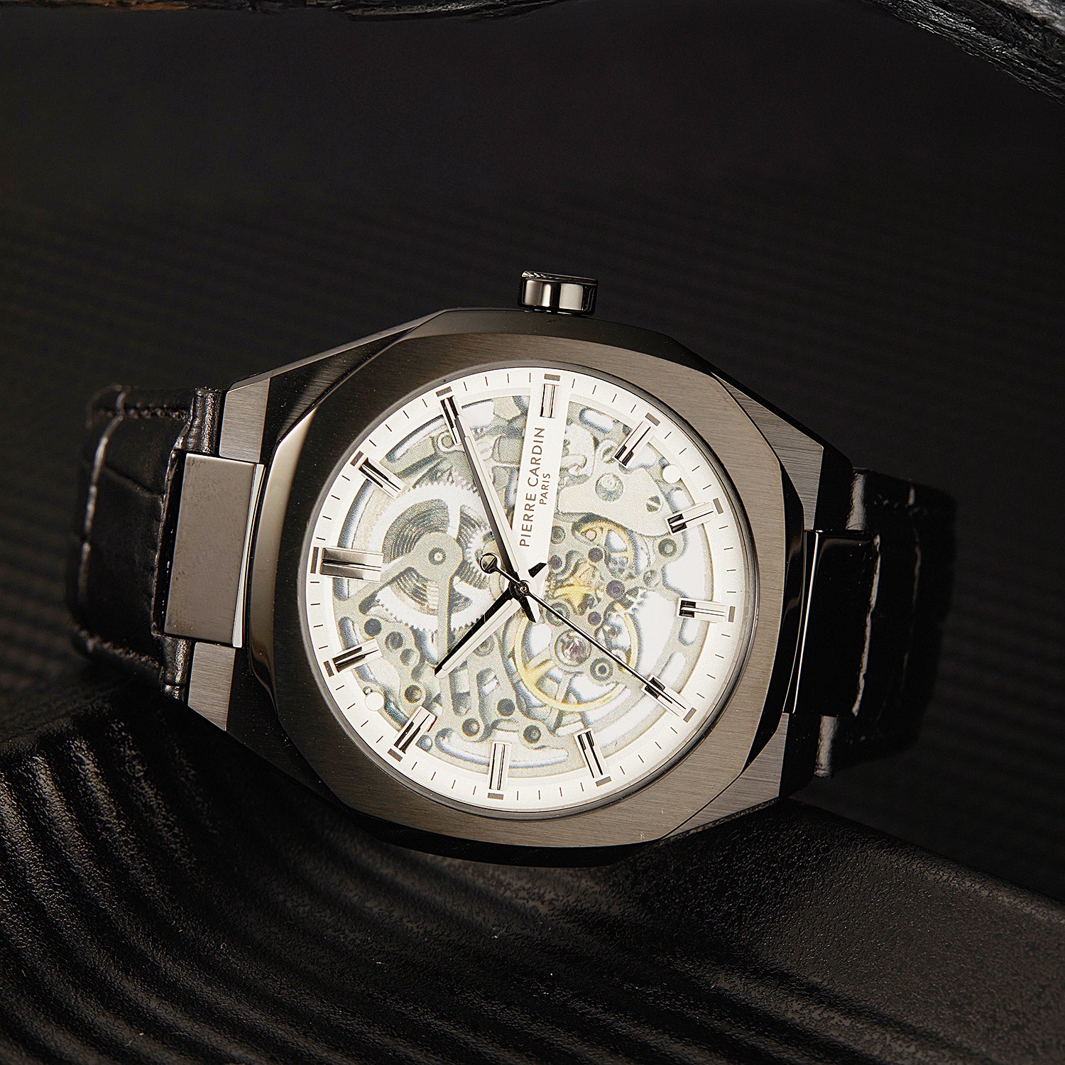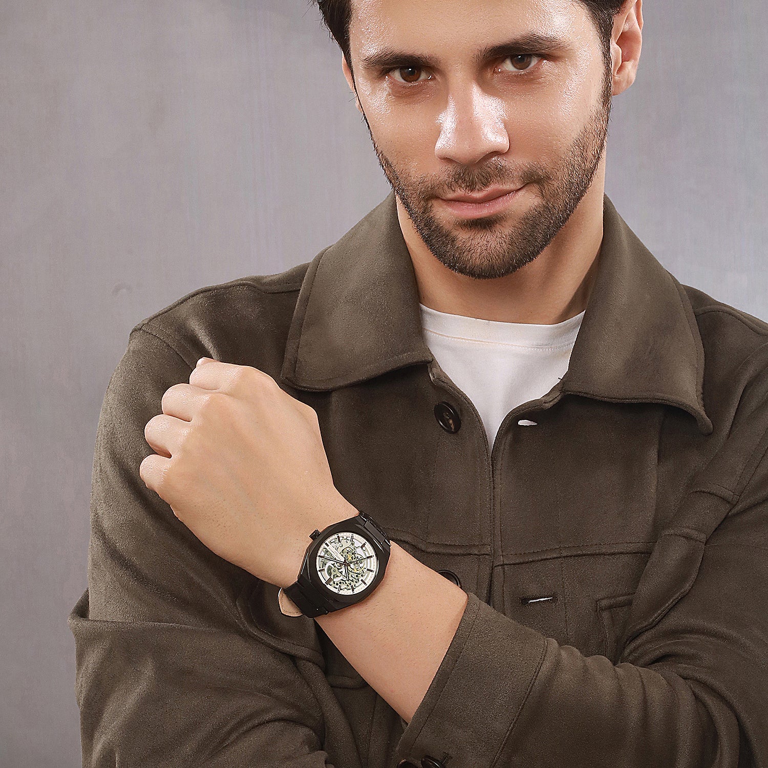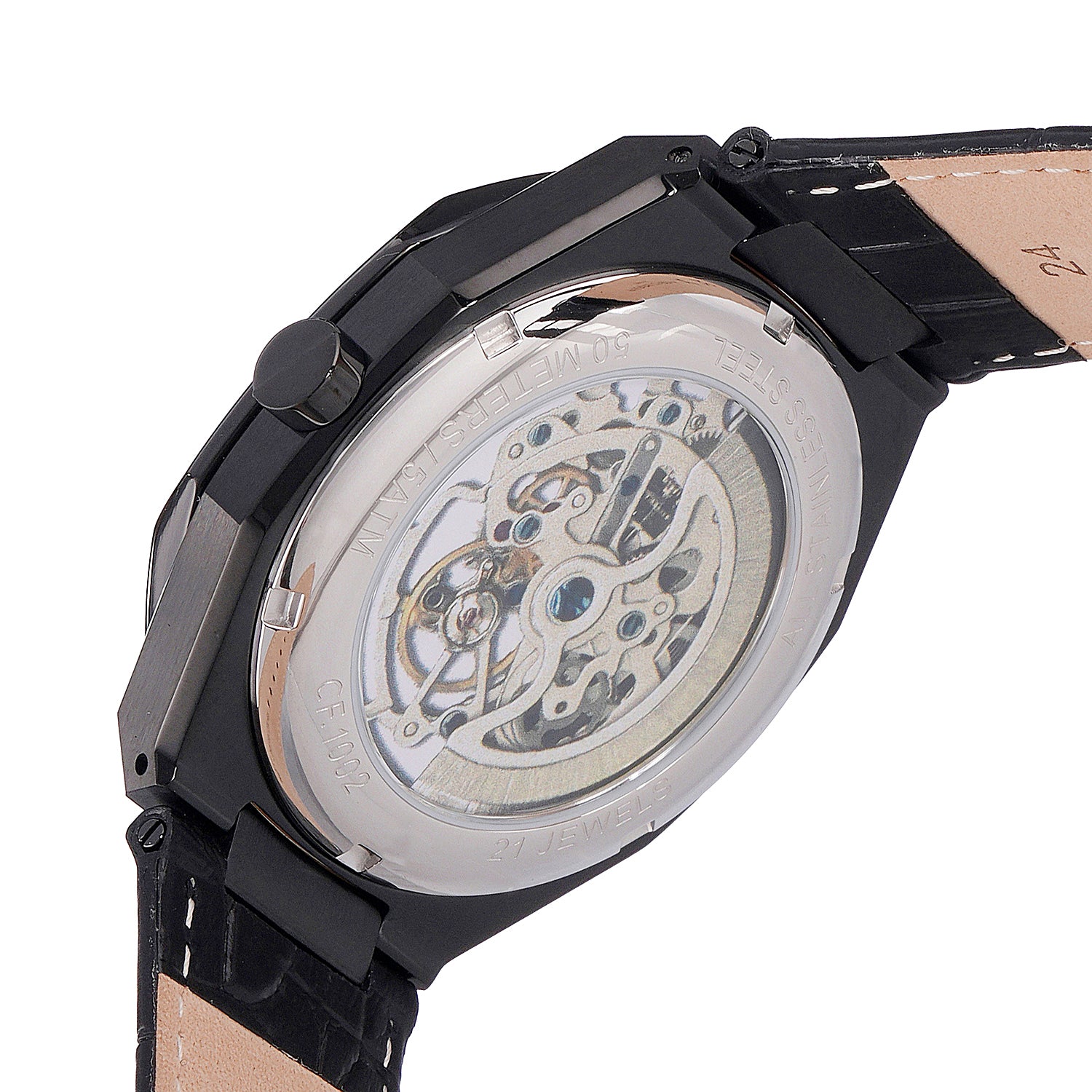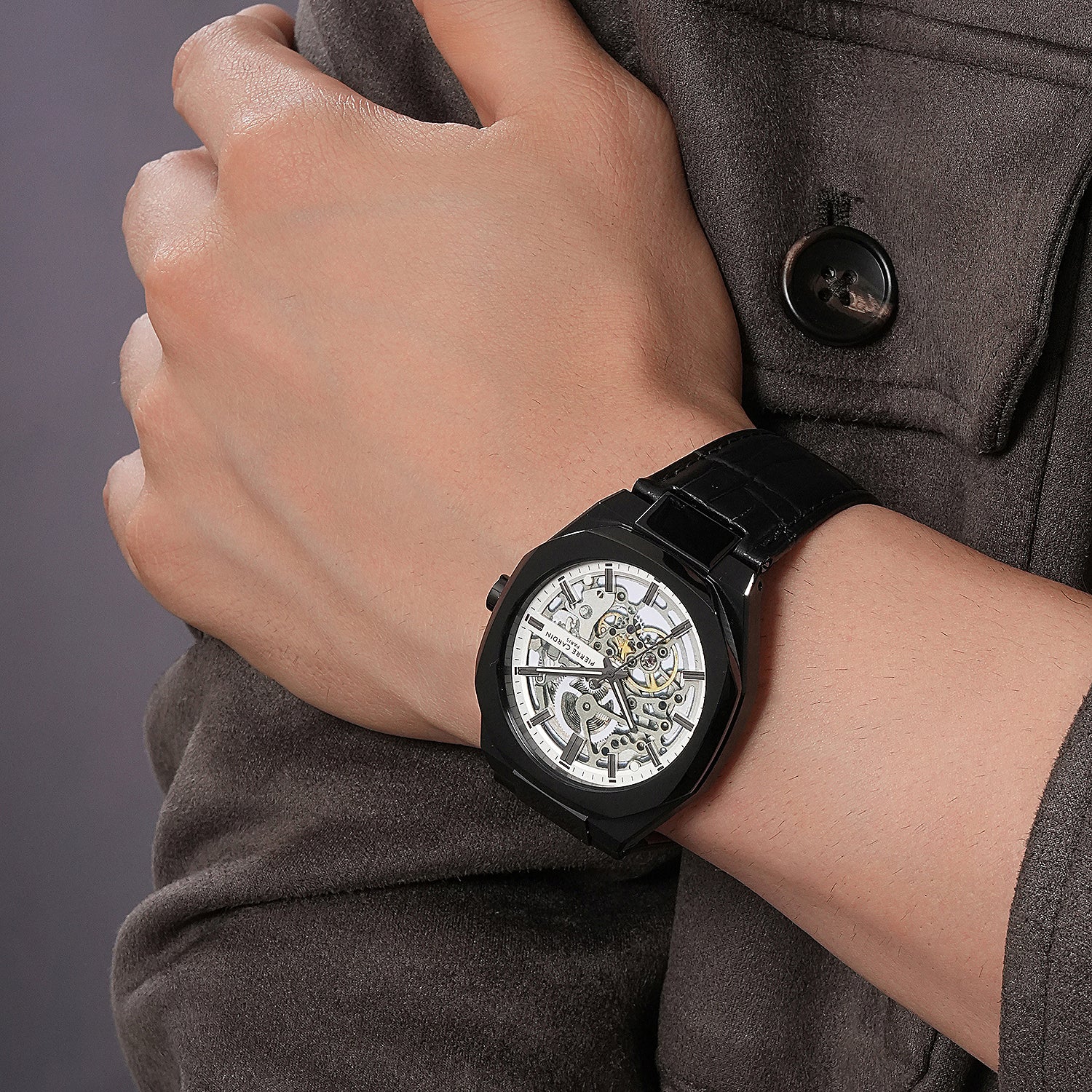 Élysée Automatique Men’s 42mm Skeleton Watch - Black Case with Silver Skeleton Dial and Black Leather Strap