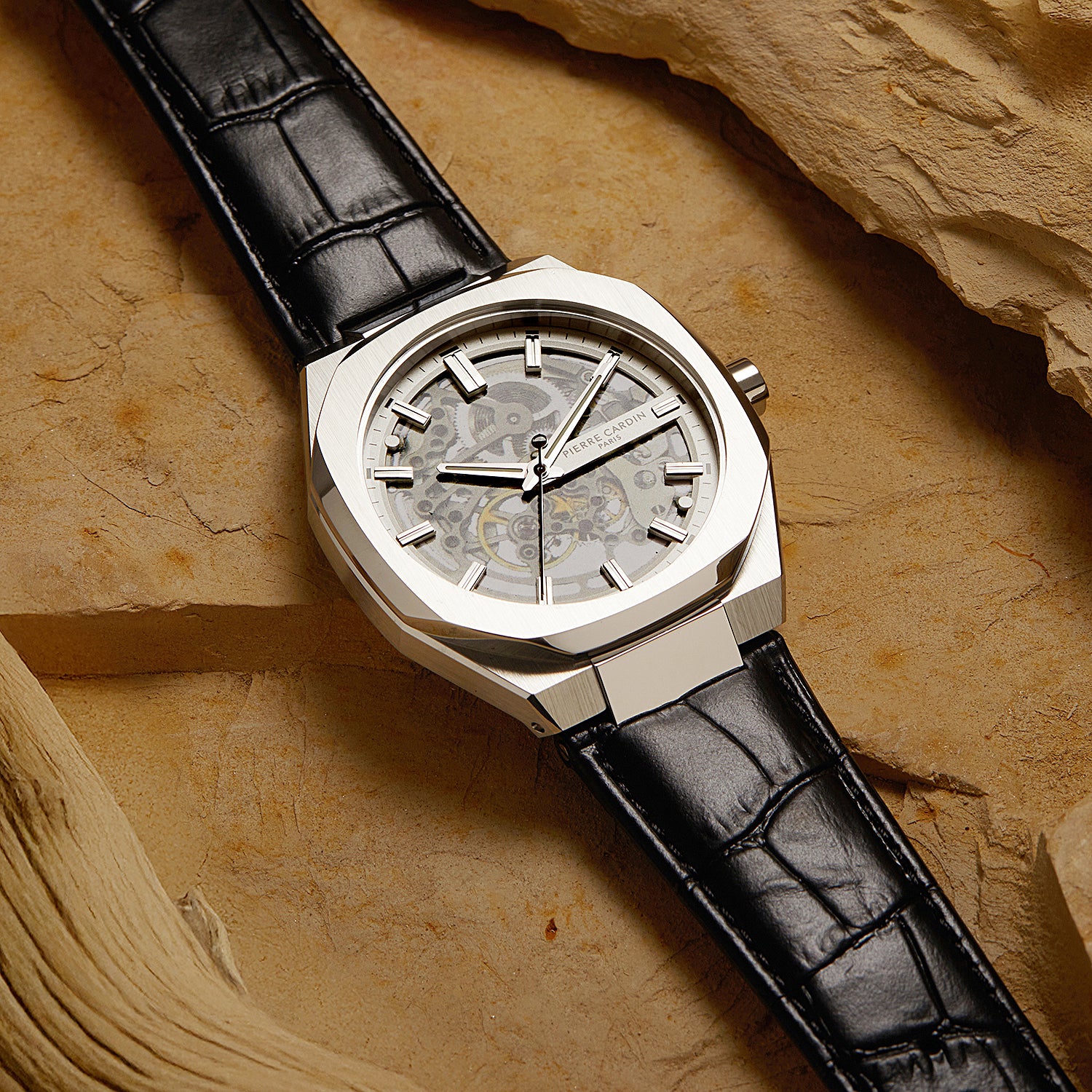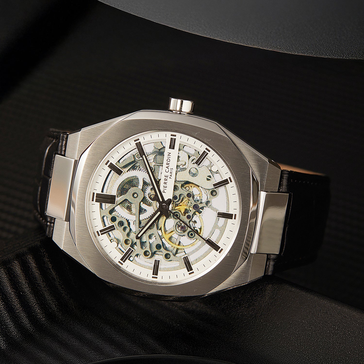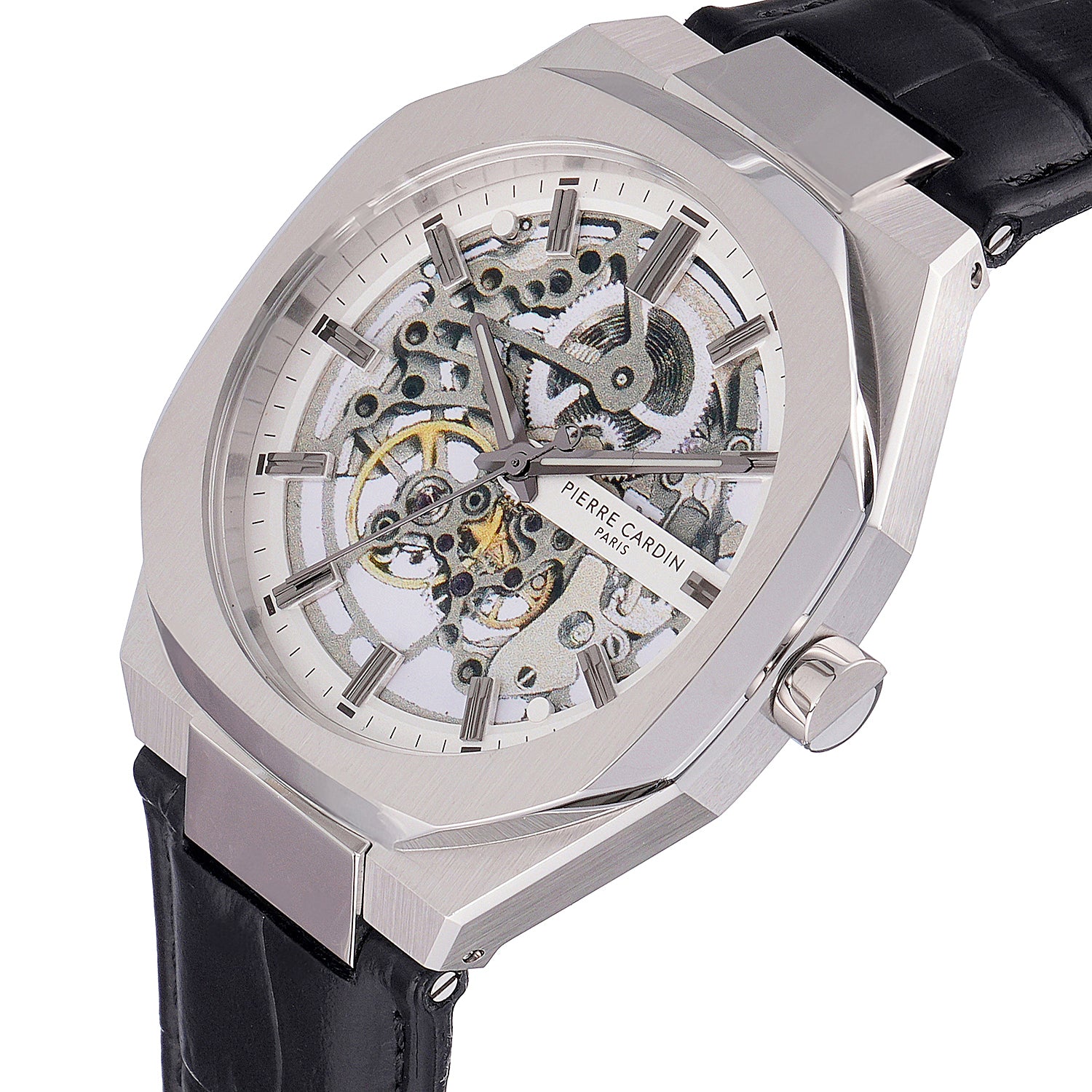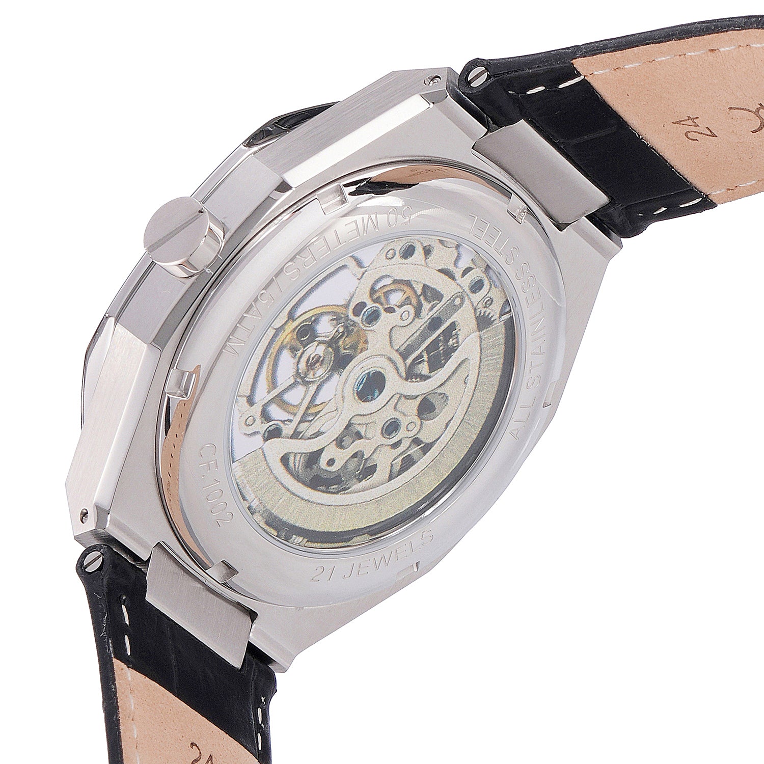 Élysée Automatique Men’s 42mm Skeleton Watch - Silver Case with Silver Skeleton Dial and Black Leather Strap