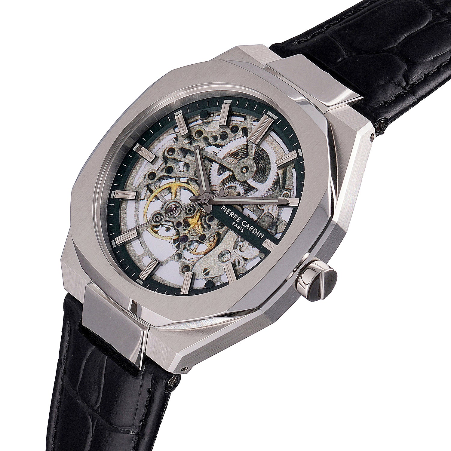 The Élysée Automatique men’s watch offers a refined and contemporary look with its 42mm stainless steel case and vibrant green dial. Showcasing an intricate automatic movement, this timepiece combines functionality with style. Paired with a classic black leather strap, the Élysée Automatique is perfect for the discerning gentleman who values elegance and quality craftsmanship. This watch brings together timeless design and a bold pop of color, making it an ideal choice for any occasion.