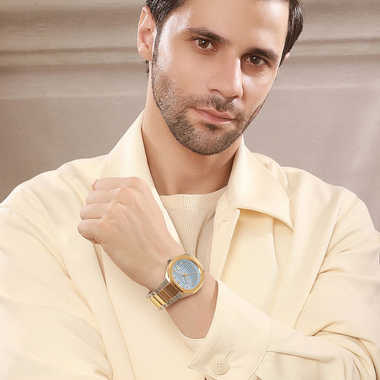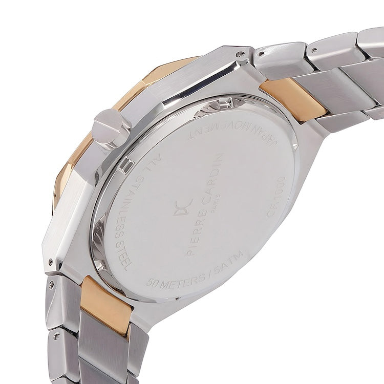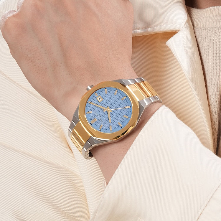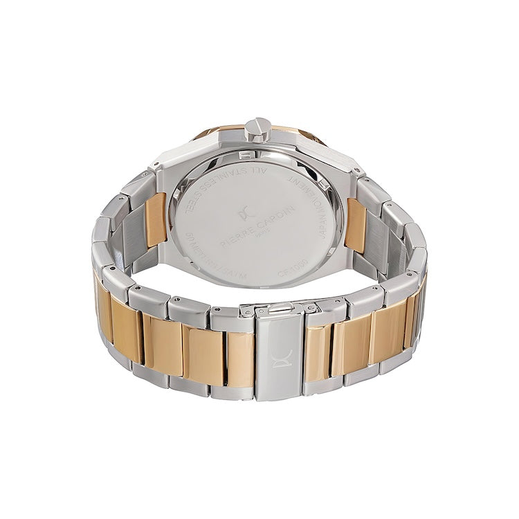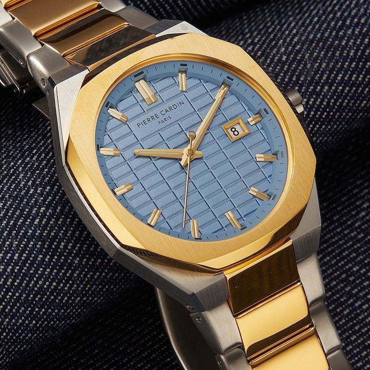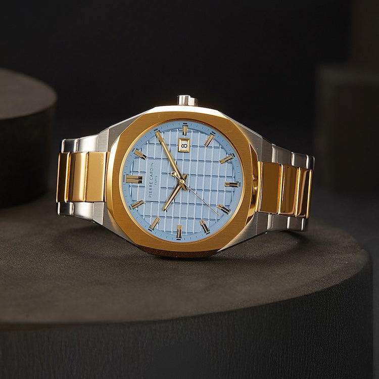 The Pierre Cardin Élysée Checkers Two-Tone Watch is a blend of elegance and modern style, designed to make a lasting impression. Featuring a sophisticated 42mm case in a striking two-tone gold and stainless steel, this timepiece beautifully contrasts with the clear sky-colored checkered dial, adding a unique touch of freshness and refinement. Paired with a polished metal strap, this watch is perfect for both formal occasions and daily wear. Crafted with Pierre Cardin’s signature attention to detail, the Élysée Checkers watch is an exceptional accessory that embodies timeless luxury and Parisian flair.