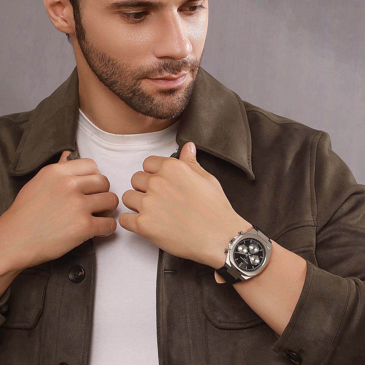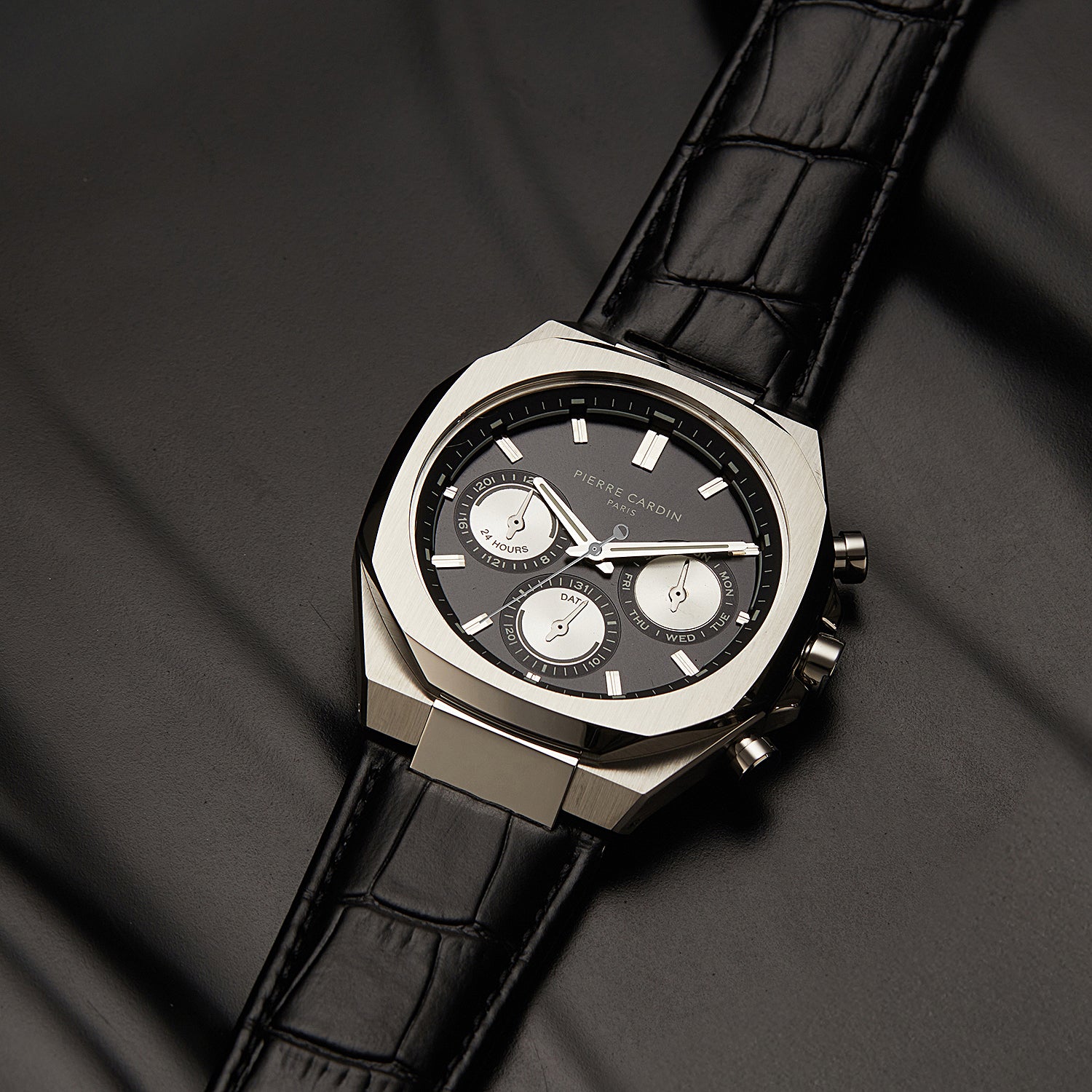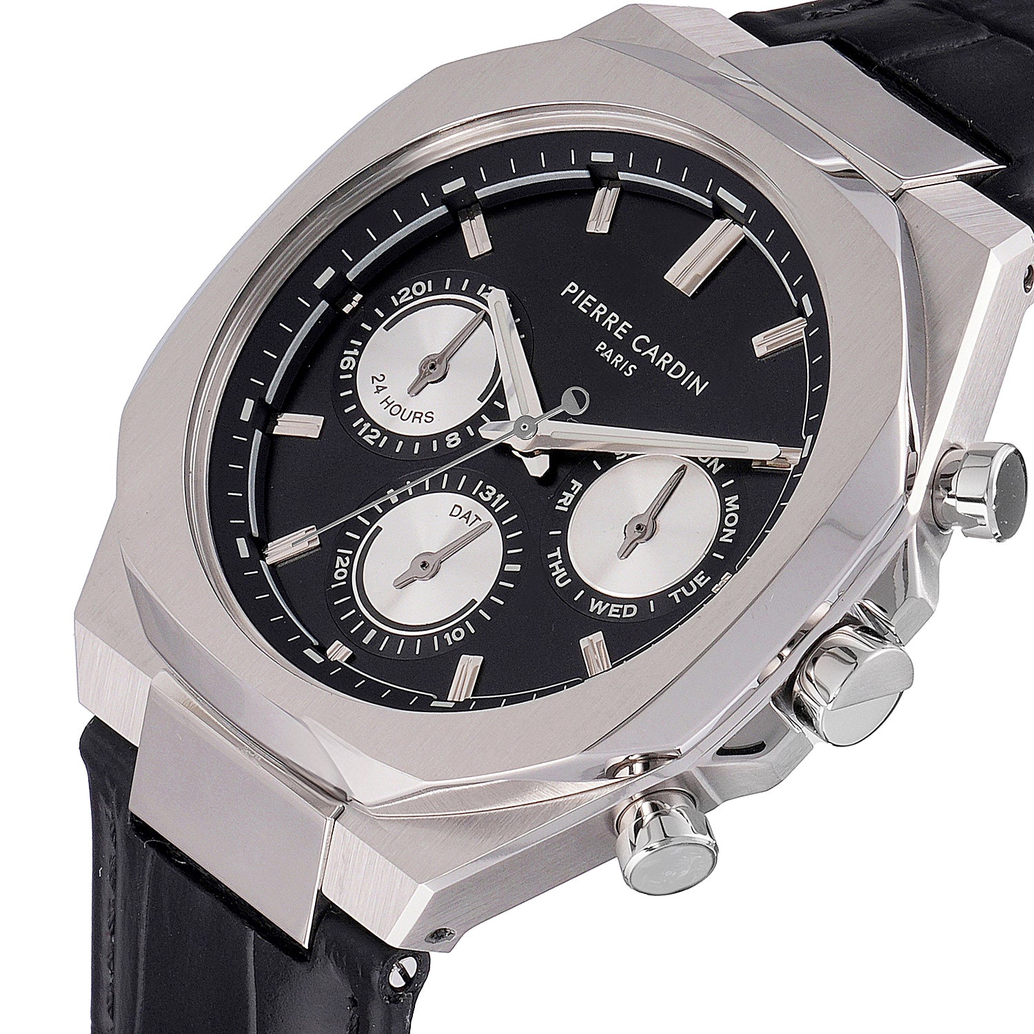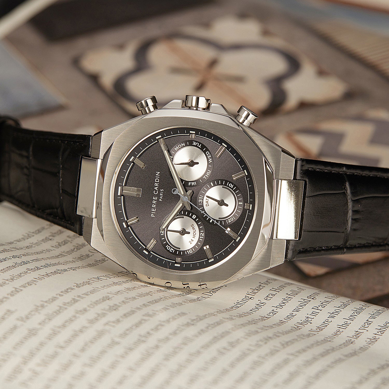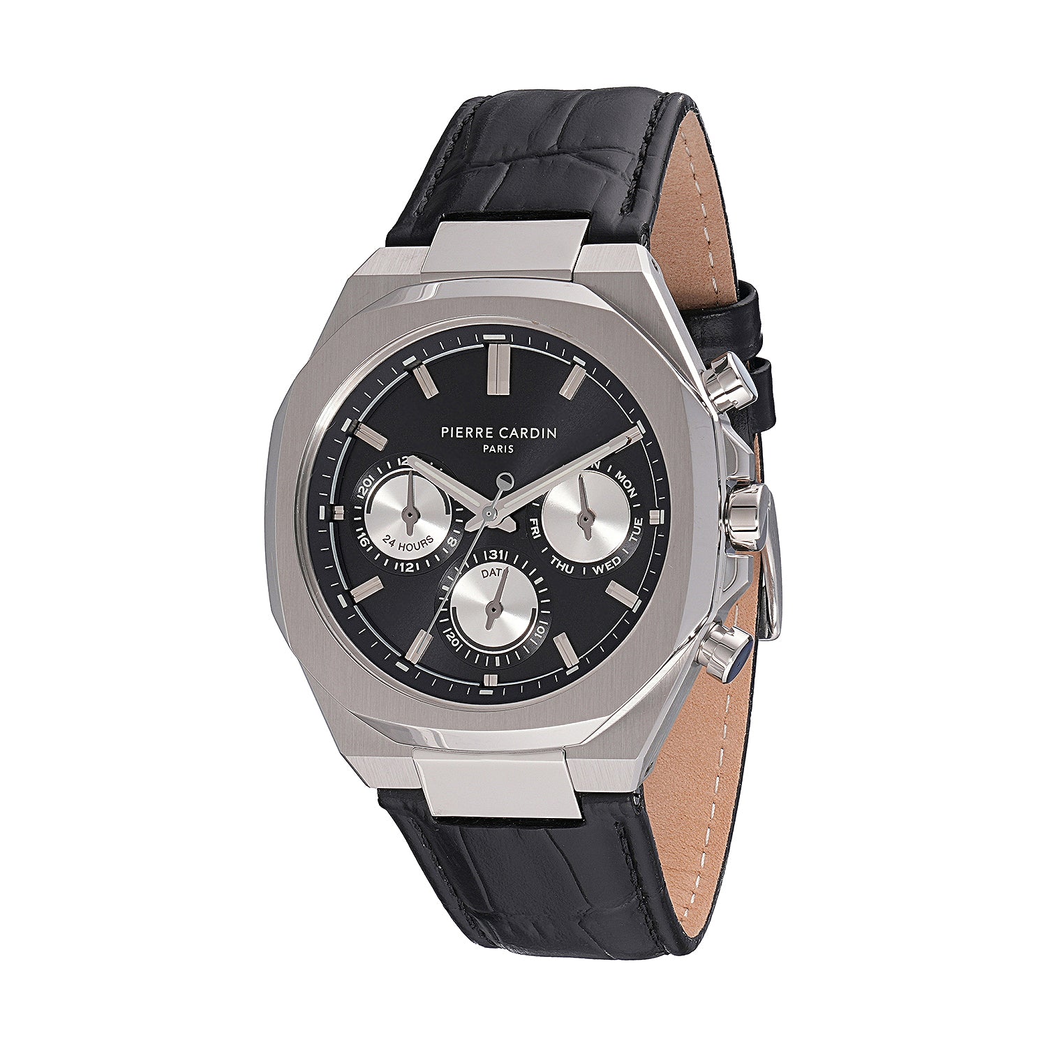 The Élysée Vogue men’s watch combines classic elegance with a contemporary twist, featuring a bold black dial with striking panda eyes that add a unique touch of contrast. Encased in a 42mm silver-tone stainless steel frame and paired with a sleek black leather strap, this timepiece offers multifunction movement for practicality and style. Designed for the modern gentleman, the Élysée Vogue watch is a perfect blend of sophistication and functionality, ideal for any occasion.