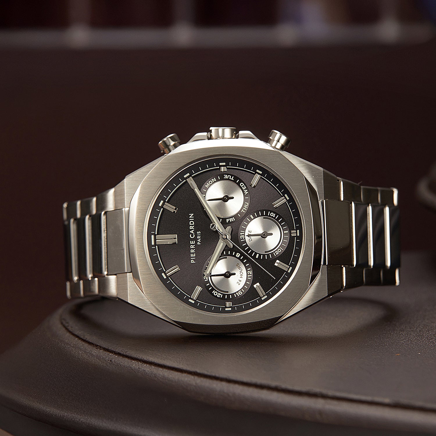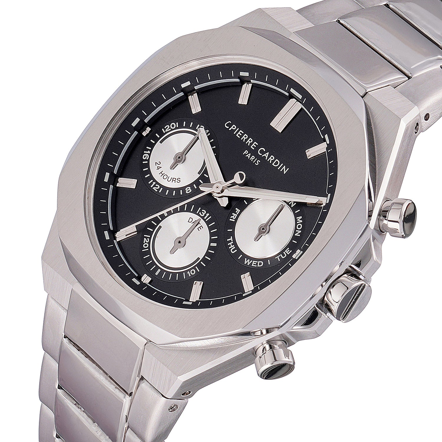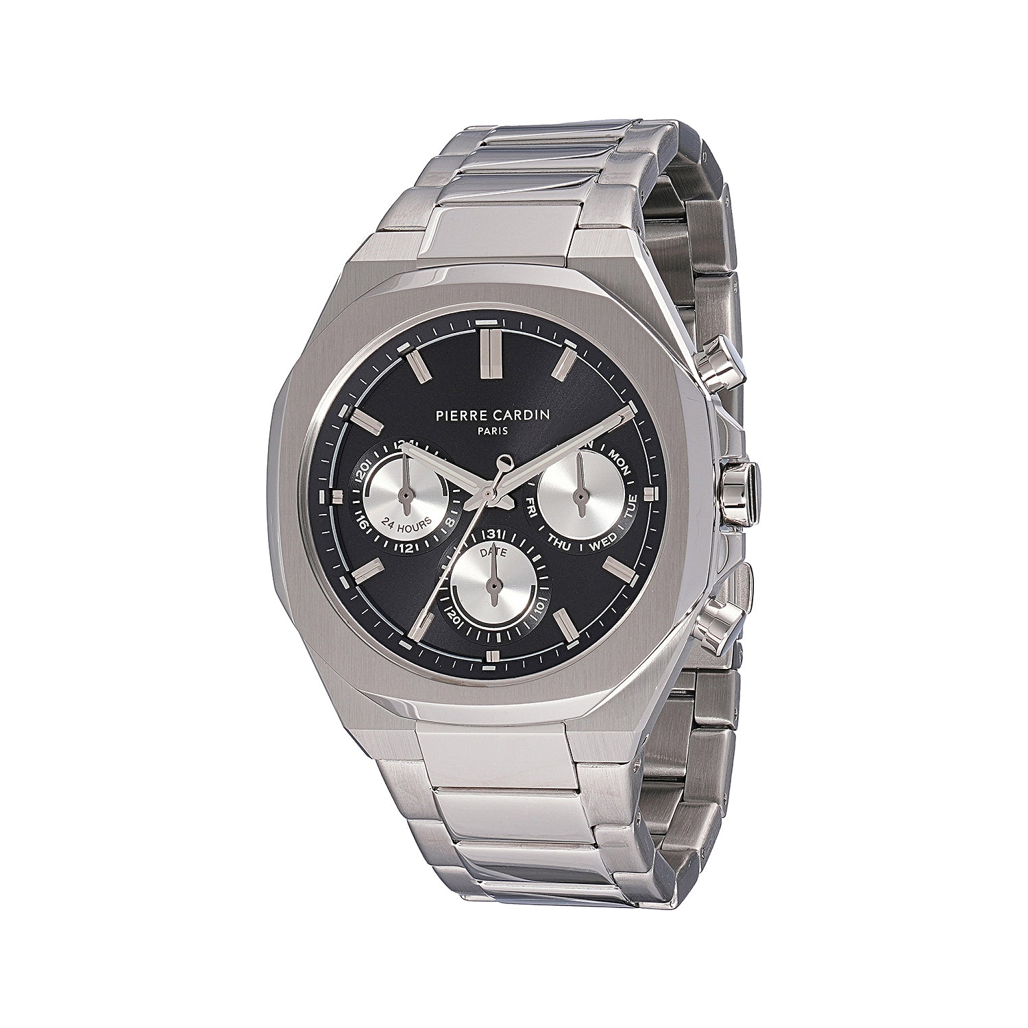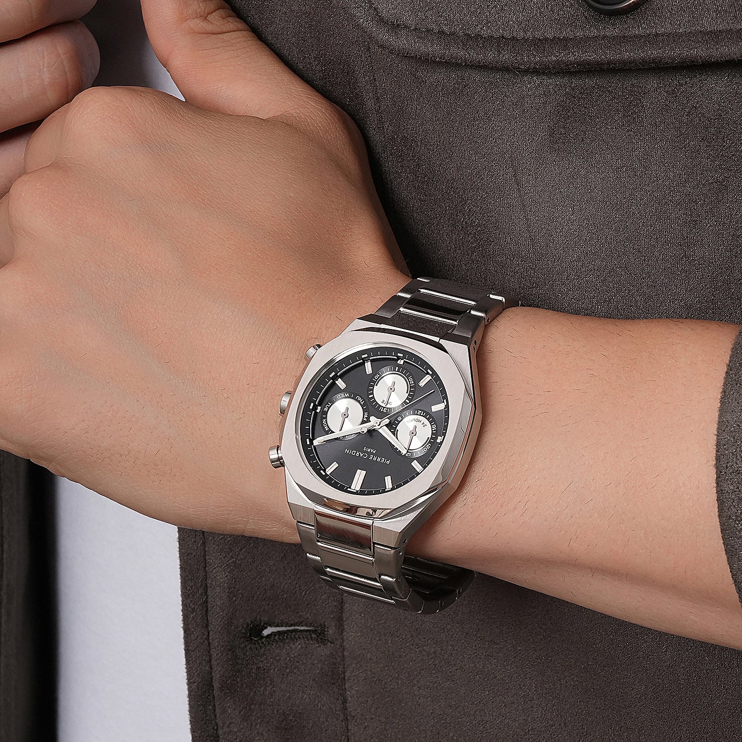 The Élysée Vogue men’s watch brings together timeless sophistication and a unique design element with its 42mm stainless steel case and striking black dial featuring panda eyes. Equipped with multifunction movement, this watch balances style and functionality seamlessly. The polished stainless steel metal strap adds a refined touch, making the Élysée Vogue an ideal choice for the modern man who values elegance and distinctive design. Perfect for any occasion, this timepiece combines quality craftsmanship with a bold, classic look.