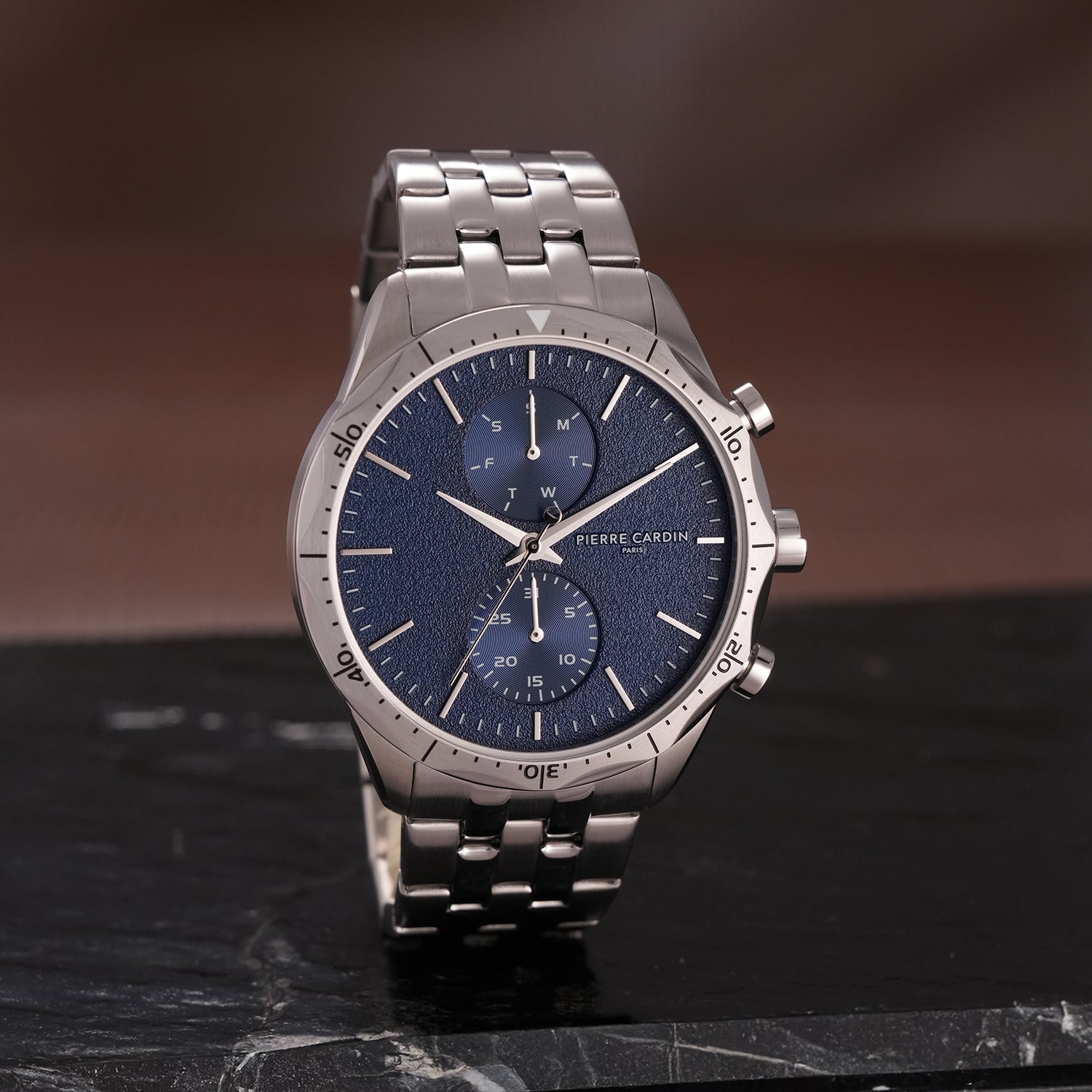 Discover the style and precision of the Heritage RacerTime Men's watch. This 43mm timepiece features a Dark blue  dial powered by a Quartz movement from Japan. Encased in Stainless Steel Silver with a Stainless Steel Silver Strap, it blends durability with refined elegance. Perfect for those who appreciate craftsmanship and everyday versatility, this watch is a modern statement piece that balances functionality and timeless appeal.