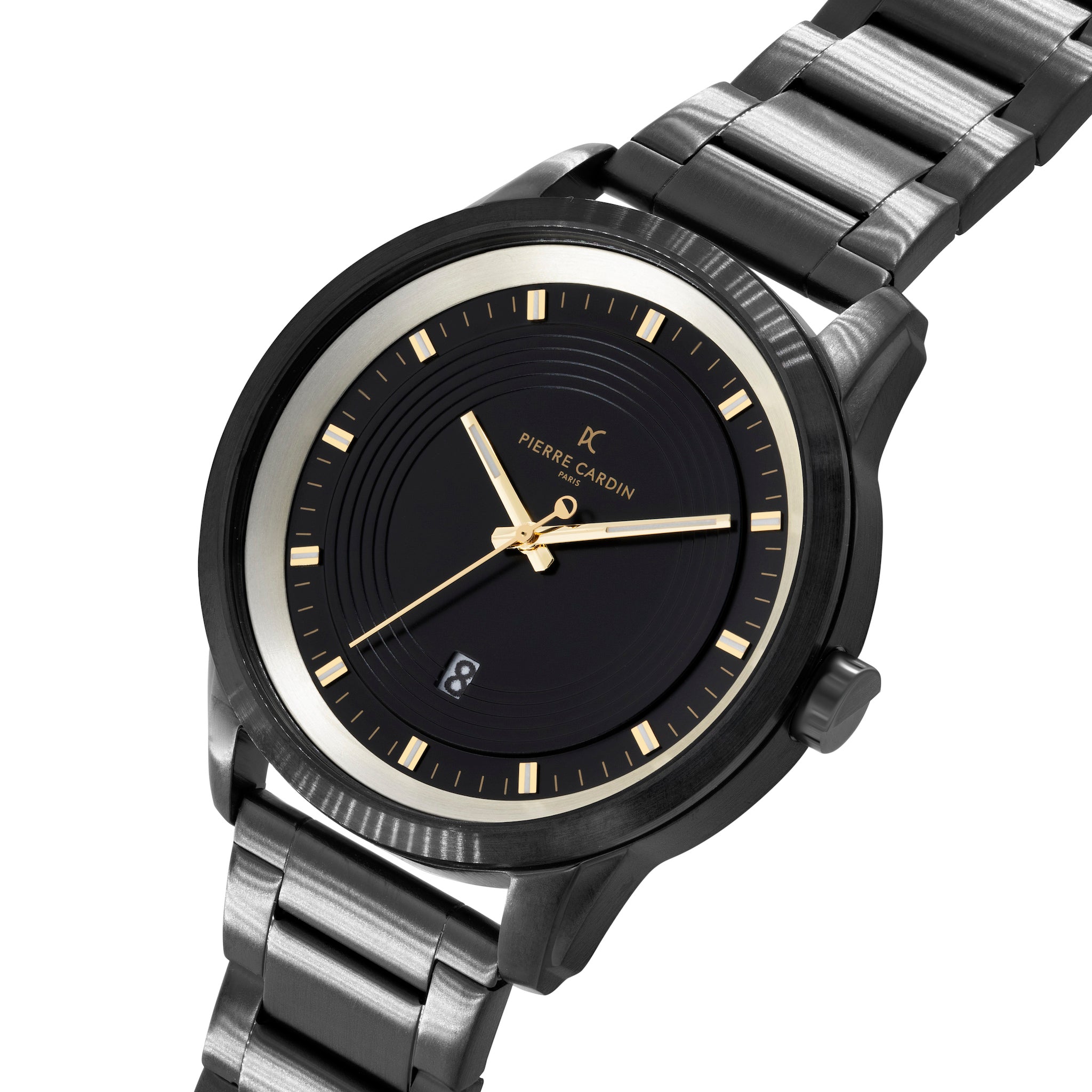 The Pierre Cardin Les Halles watch for men is a sleek and stylish timepiece with a classic design. It features a black case that adds a touch of sophistication to the watch, while the black metal link strap provides a comfortable fit. The gold detailing adds a very contrast look to the watch.