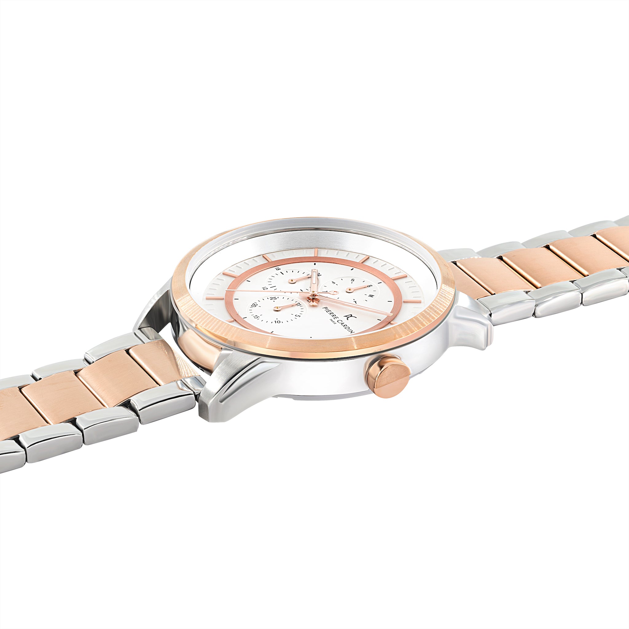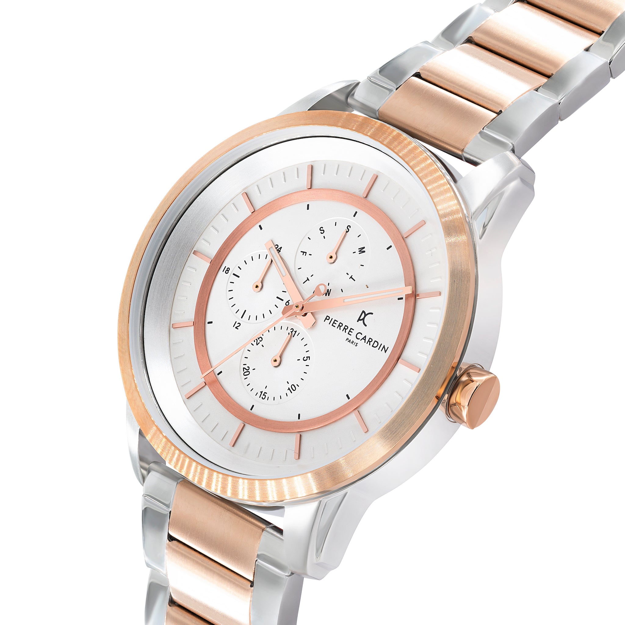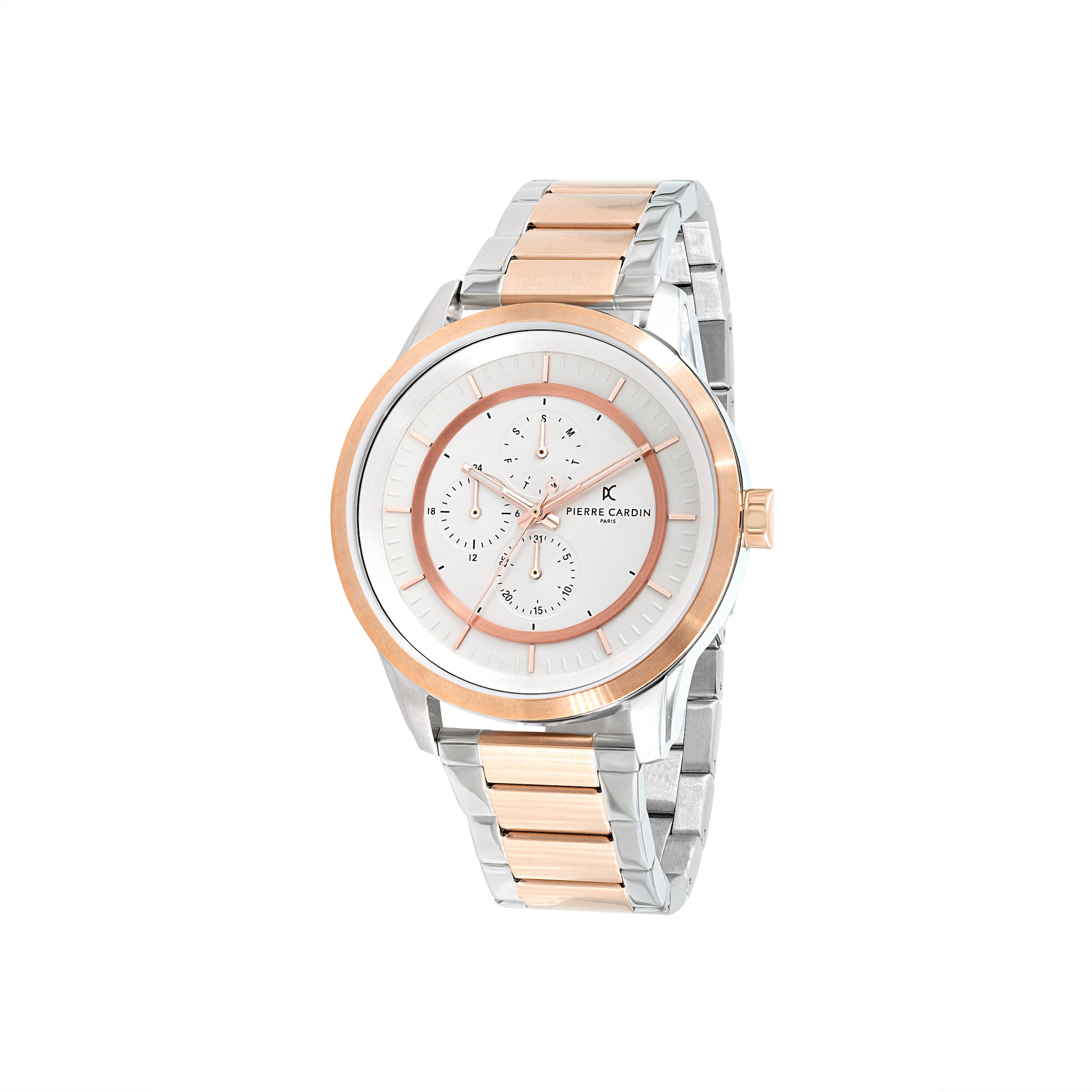 The Pierre Cardin Les Halles multifunction watch for men with a white dial and two-tone rose gold and silver metal link strap is a stylish and elegant timepiece. The white dial provides a classic and timeless look, while the two-tone metal link strap adds a touch of sophistication to the watch. The watch has a durable mineral crystal that protects the watch face from scratches and damage. It is also water-resistant, making it suitable for everyday wear.