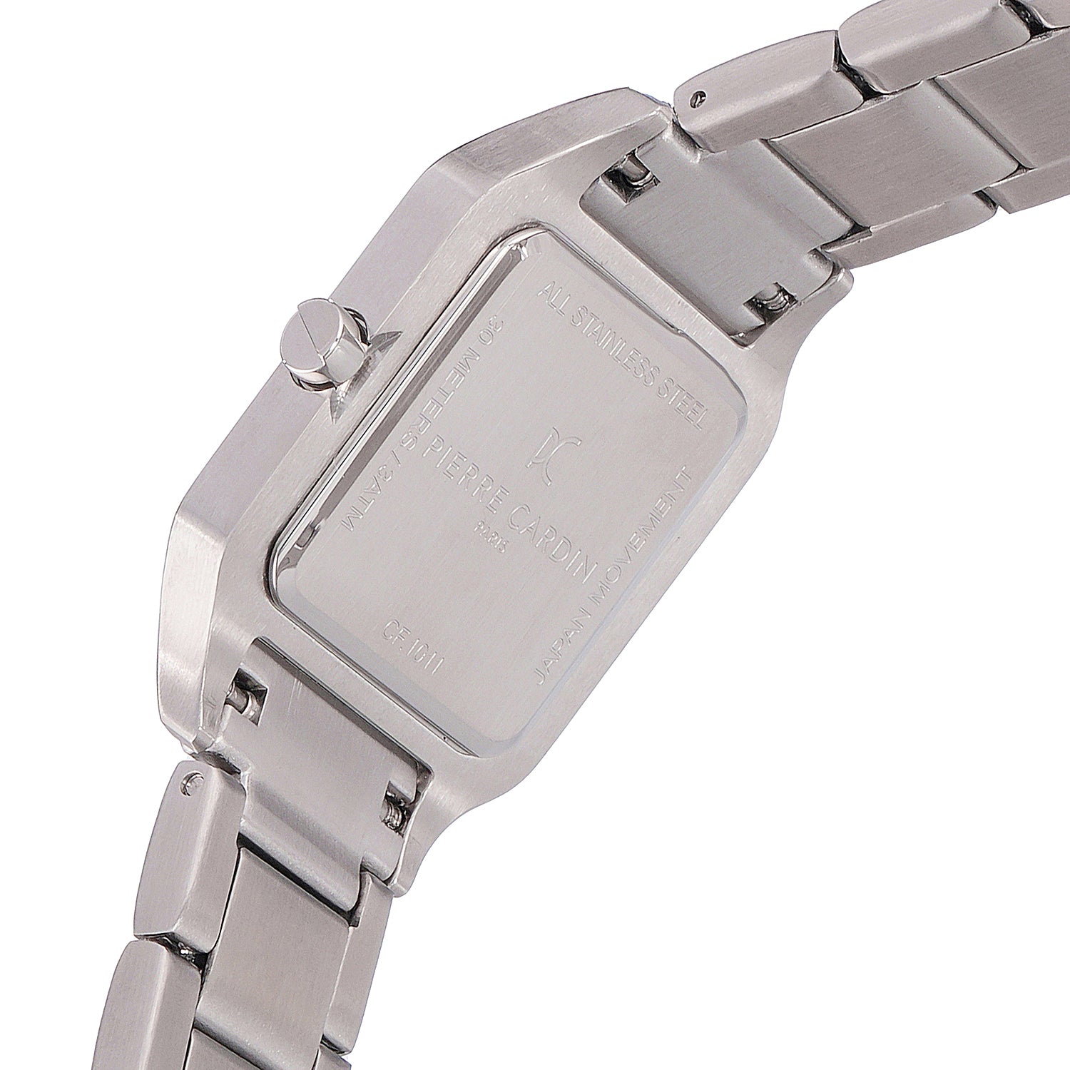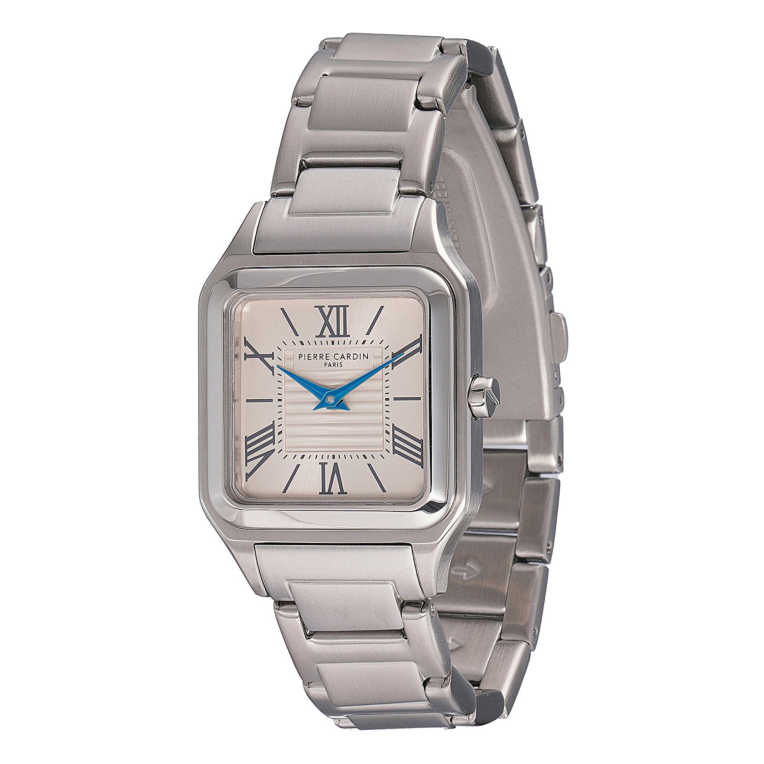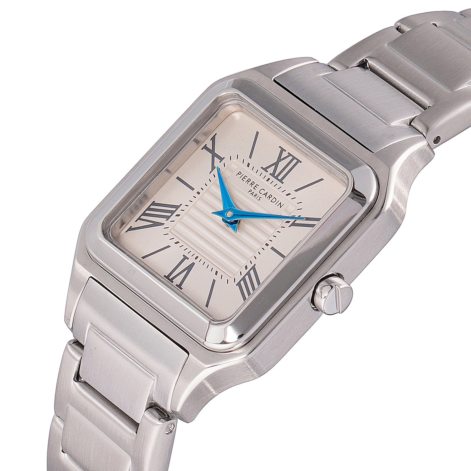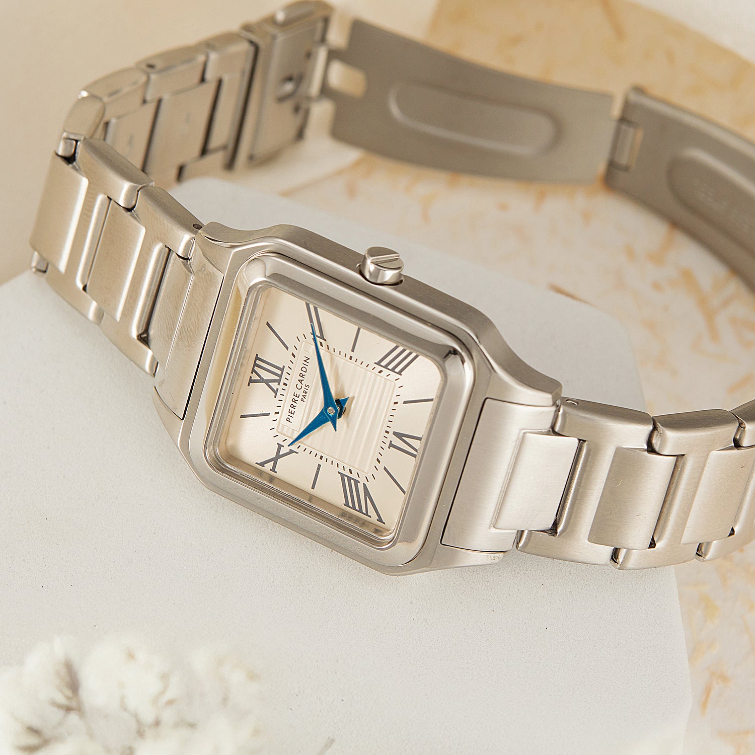The Ménilmontant Carré womens’ watch by Pierre Cardin blends classic elegance with contemporary sophistication. This refined square-shaped timepiece, measuring 38 x 27.5 mm, features a polished stainless steel silver case and a champagne dial adorned with delicate center lines and elegant Roman numerals. Powered by a precise two-hand quartz movement, it is complemented by a sleek silver metal strap, adding a touch of timeless style. Perfect for the modern woman, the Ménilmontant Carré watch is both versatile and graceful, making it an ideal accessory for any occasion. Crafted with impeccable attention to detail, this watch is a true testament to Pierre Cardin’s legacy of Parisian charm and quality craftsmanship.