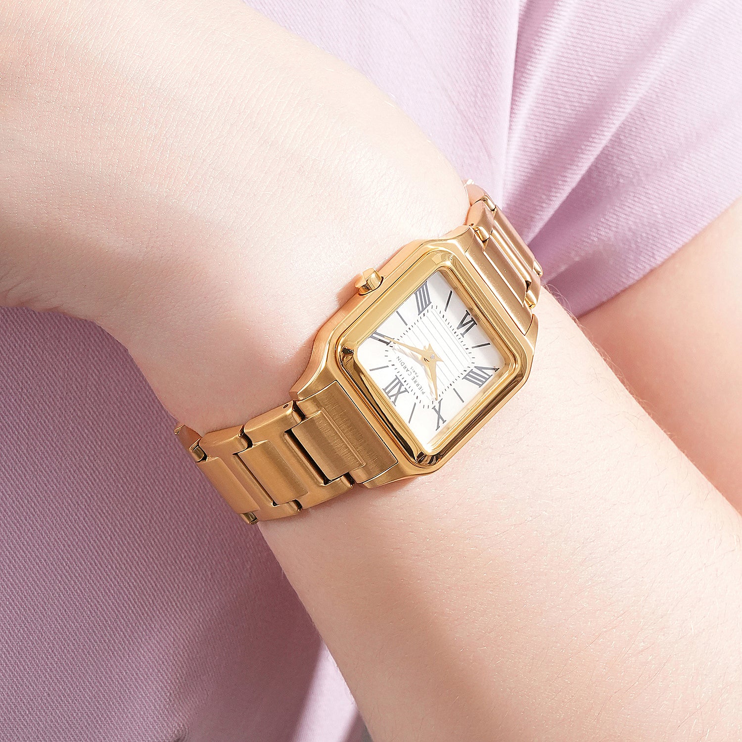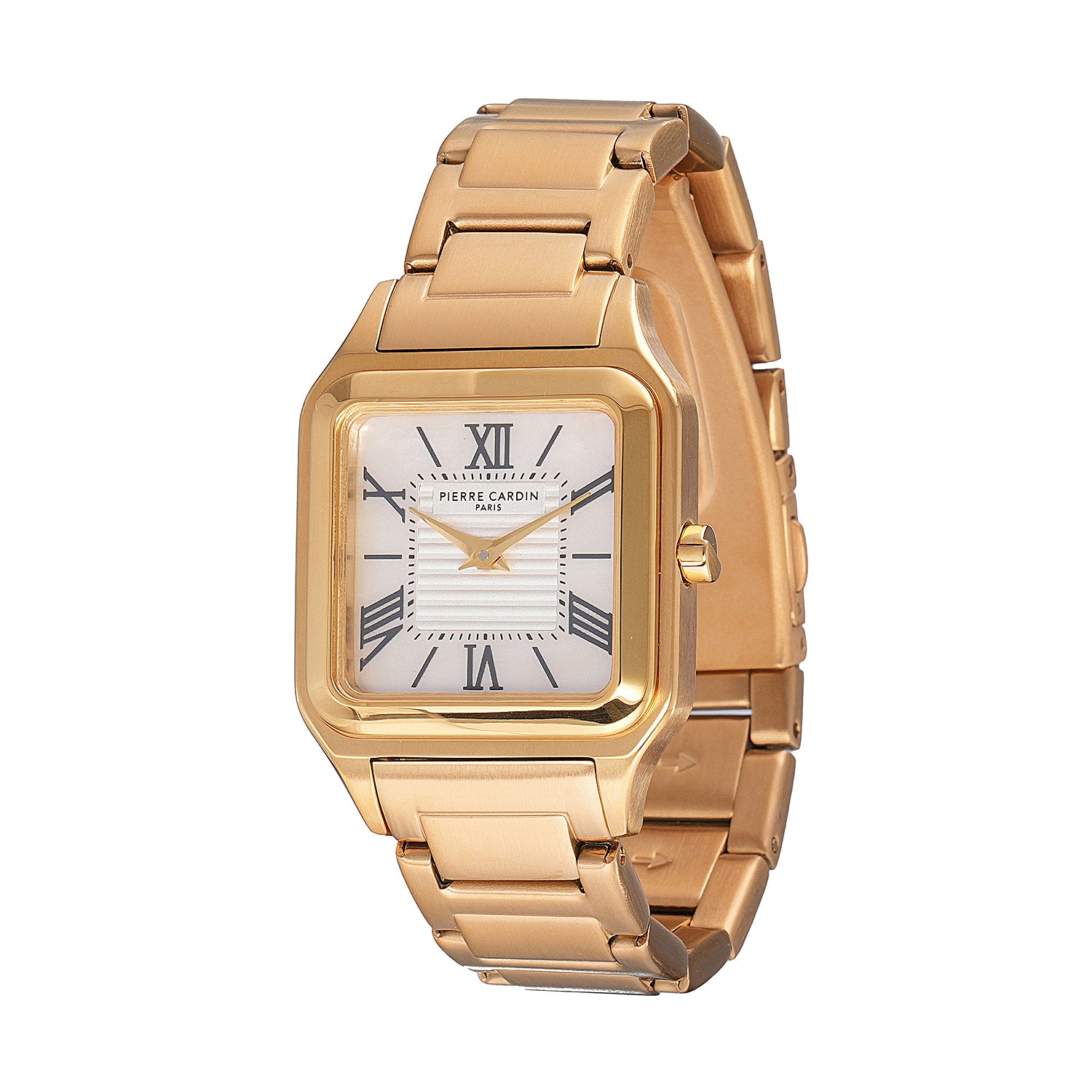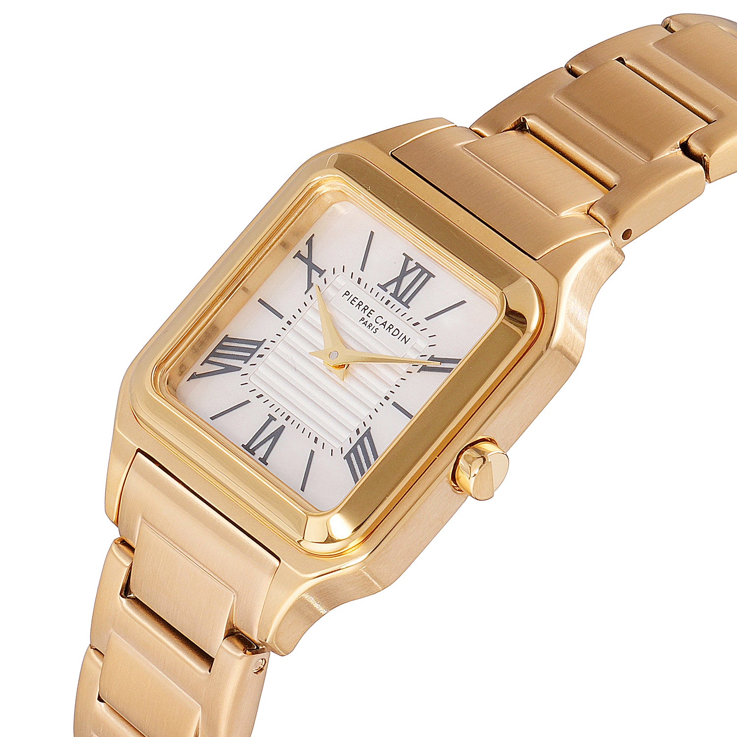 The Ménilmontant Carré women’s watch by Pierre Cardin combines classic sophistication with a contemporary edge. This elegant square-shaped timepiece, measuring 38 x 27.5 mm, features a radiant gold case and a champagne dial highlighted by delicate center lines and refined Roman numerals. Powered by a precise two-hand quartz movement, it is complemented by a luxurious gold metal strap, offering timeless style and versatility. Designed for the modern woman, the Ménilmontant Carré watch is perfect for any occasion, showcasing Pierre Cardin’s dedication to Parisian elegance and exceptional craftsmanship.