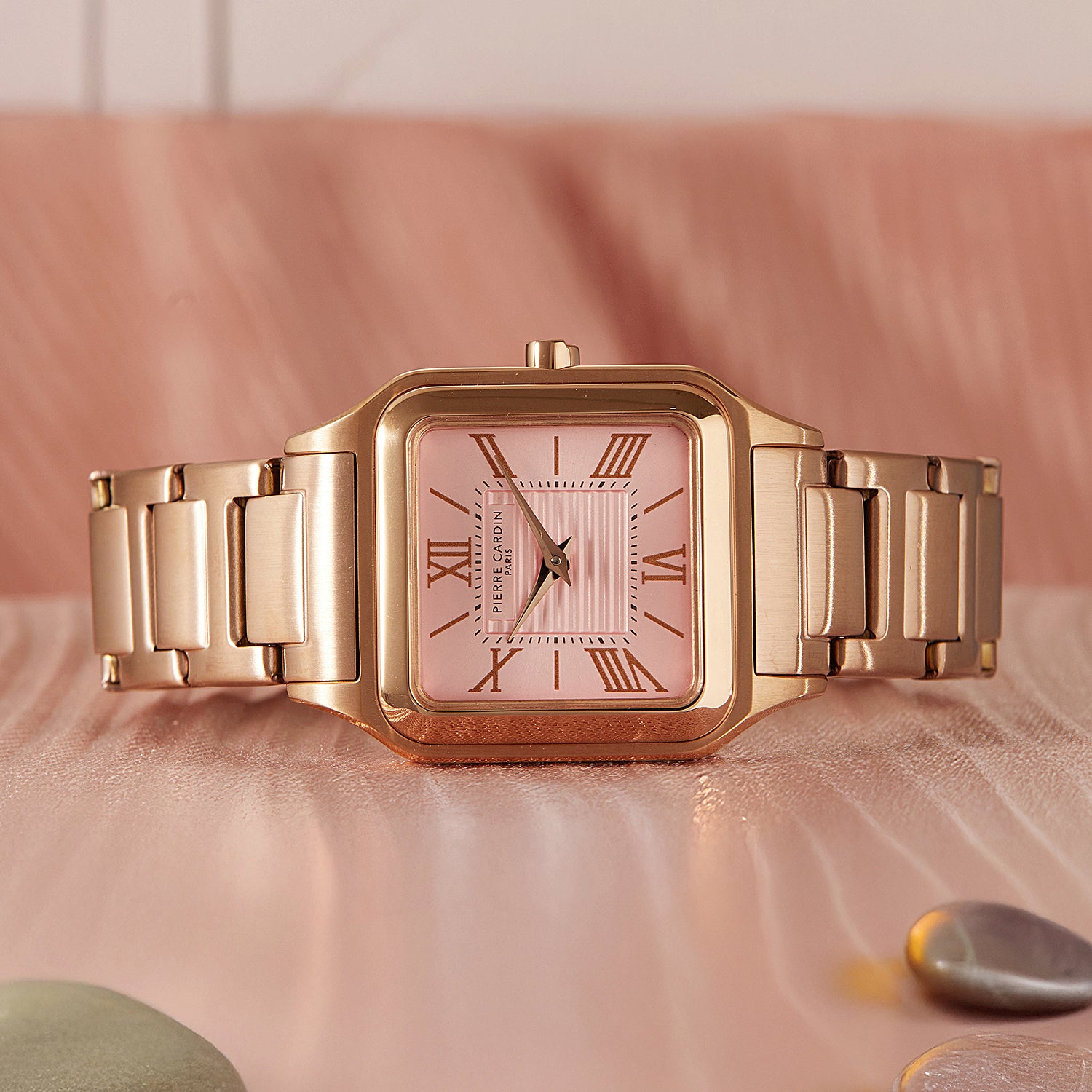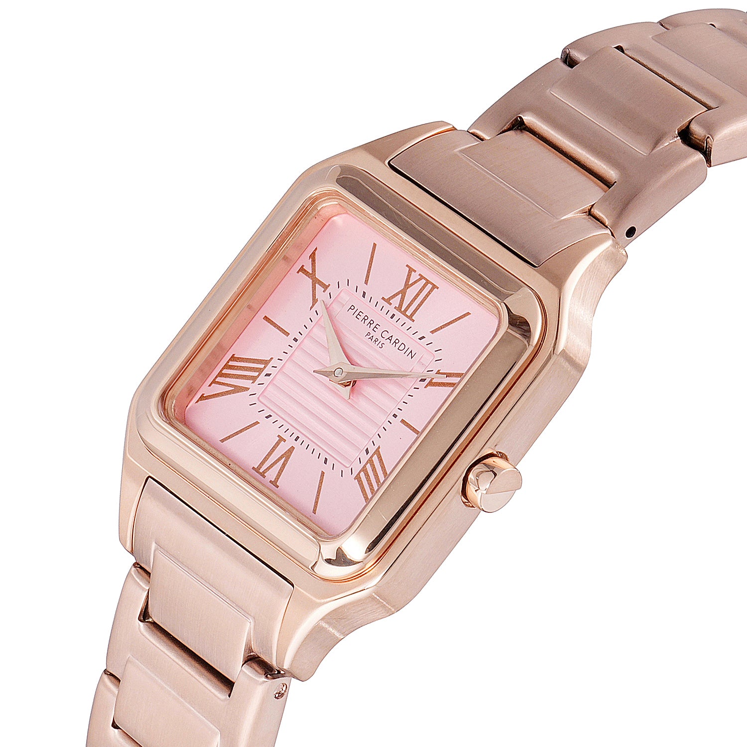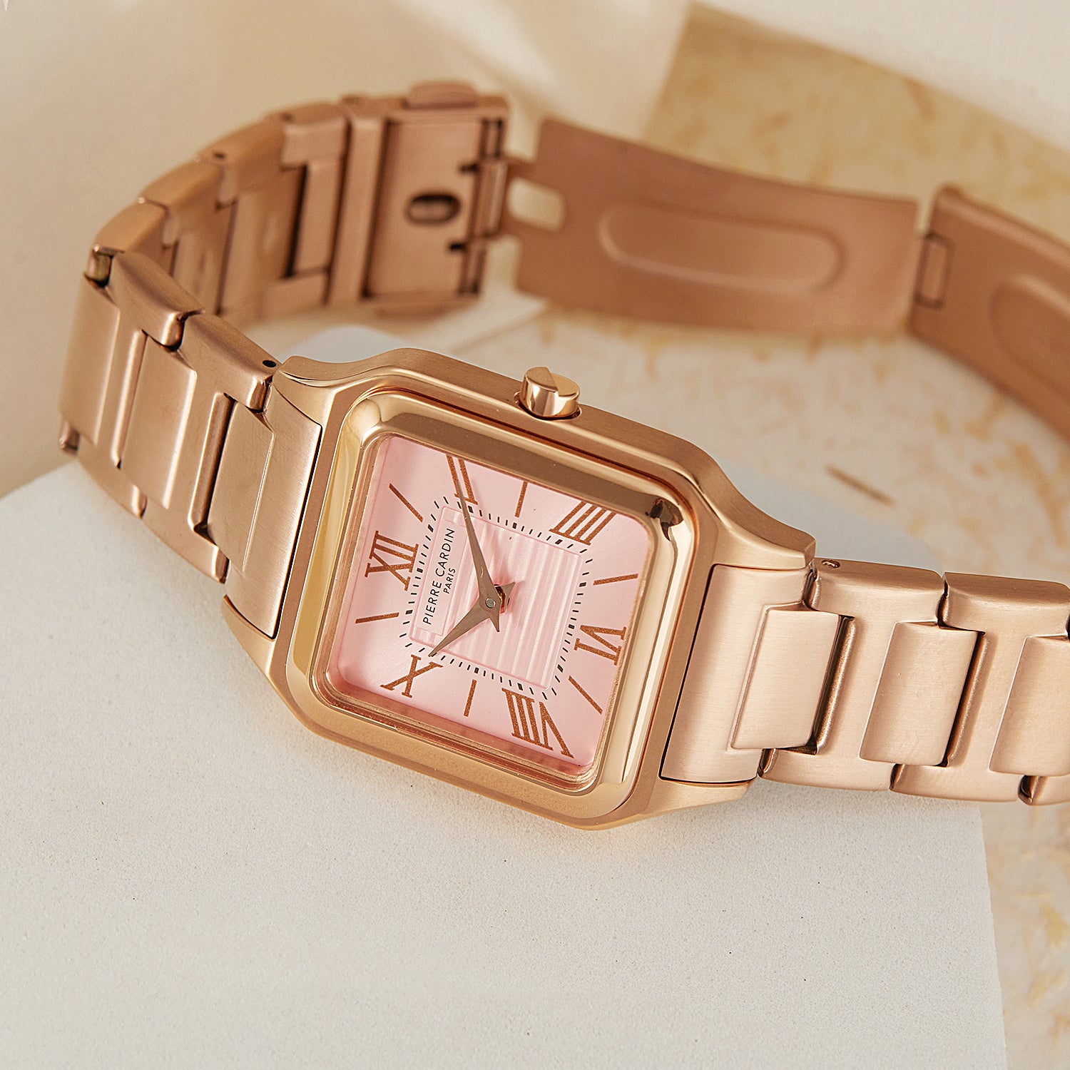 The Ménilmontant Carré women’s watch by Pierre Cardin embodies timeless sophistication with a touch of feminine charm. This square-shaped timepiece, measuring 38 x 27.5 mm, features a radiant rose gold case paired with a delicate pale pink dial adorned with elegant center lines and classic Roman numerals. Powered by a precise two-hand quartz movement, it is complemented by a luxurious rose gold metal strap, creating a refined and versatile look. Perfect for the modern woman, the Ménilmontant Carré watch showcases Pierre Cardin’s dedication to Parisian elegance and exceptional craftsmanship.