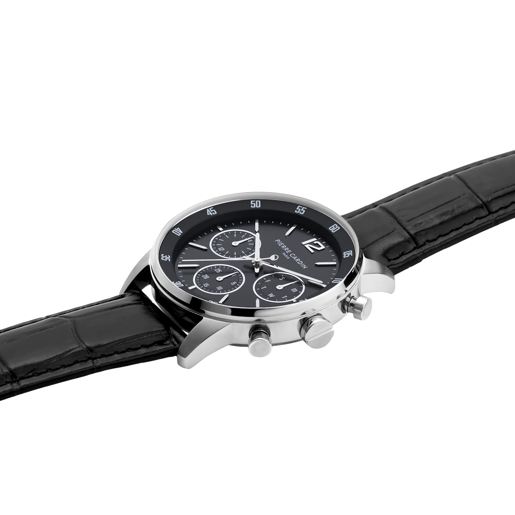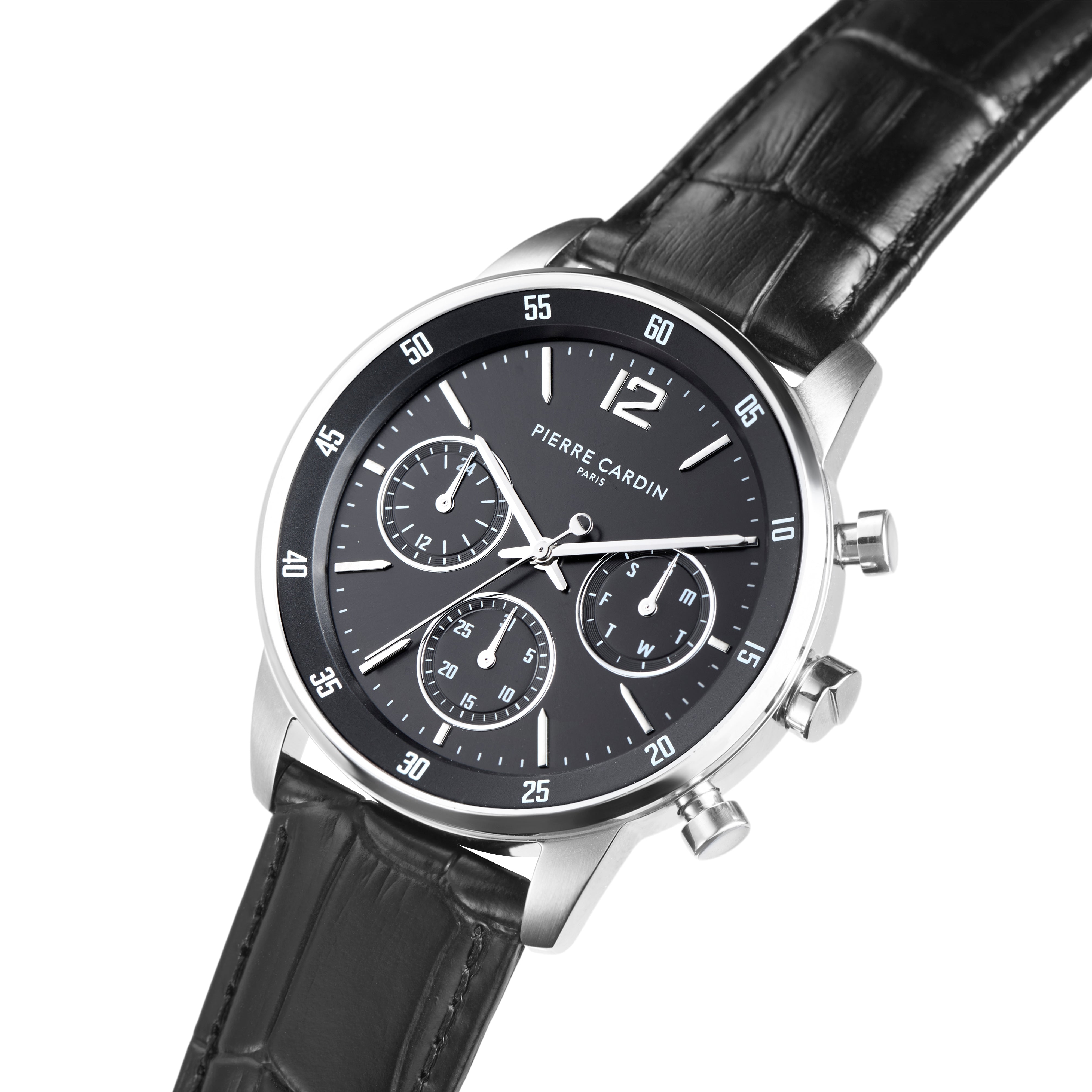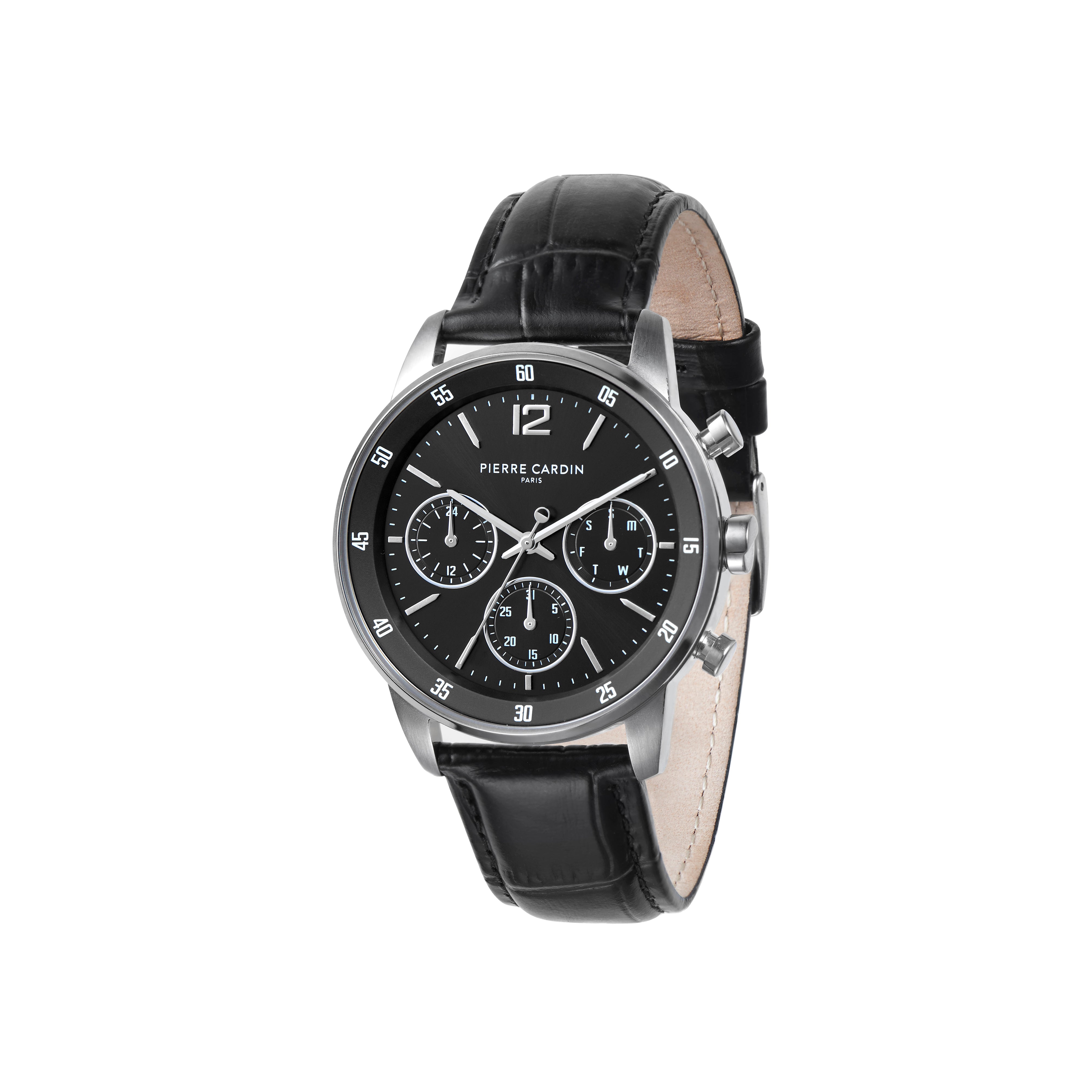 The Montrouge Prim Multifunction leather watch for men is a statement piece that stays close to Pierre Cardin’s iconic design inspired by the cosmopolitan style of the Montrouge district. The dial features minimal silver hands and a date feature, The polished silver stainless steel watch case offers a touch of contrast to complement a classic black leather strap, a fine addition to all your outfits night or day.