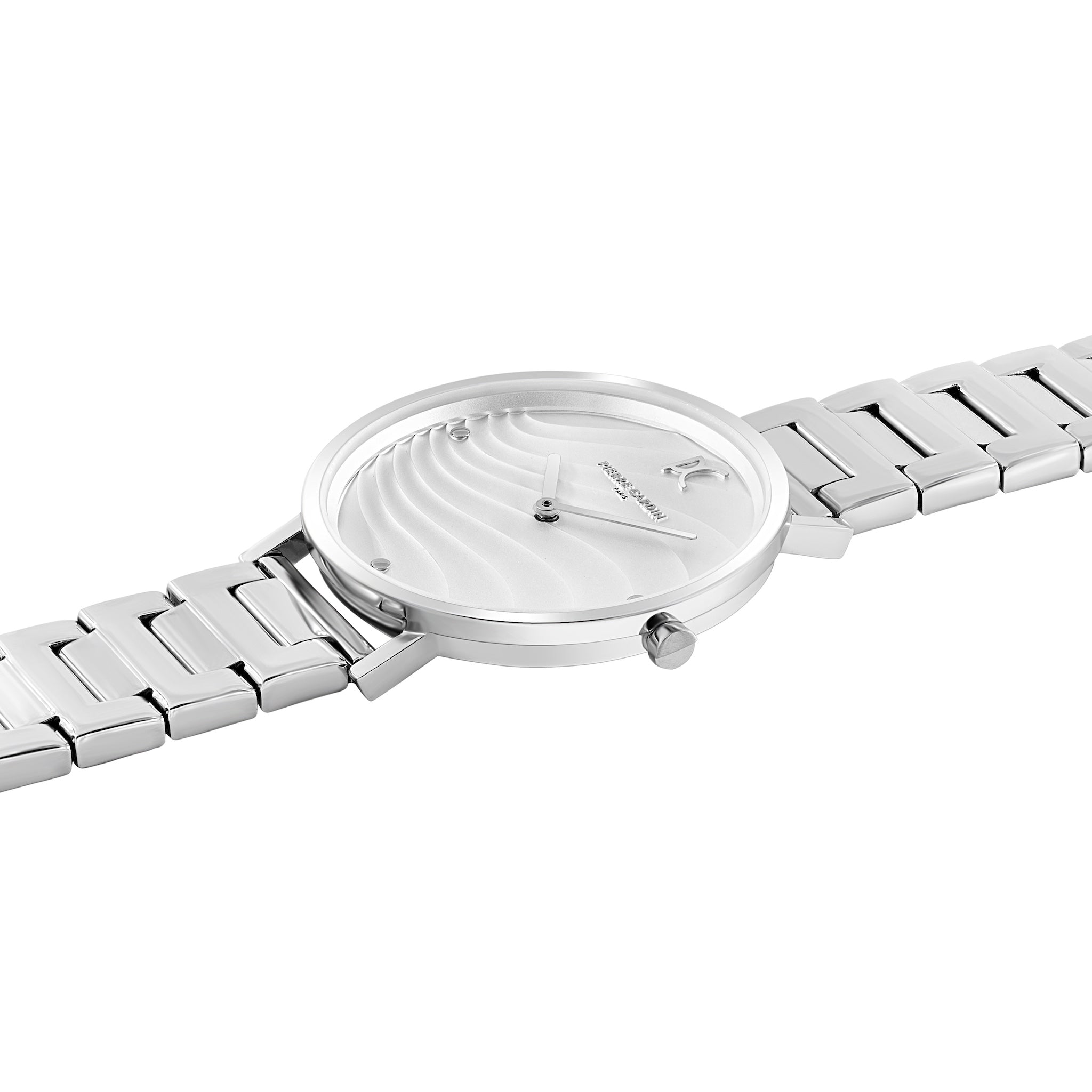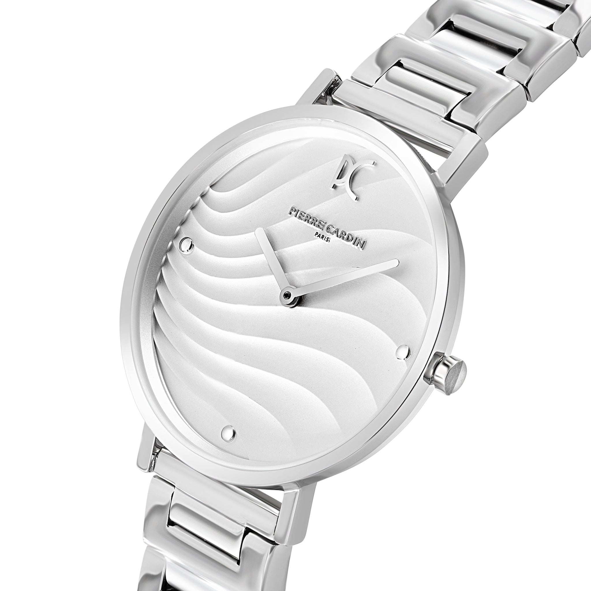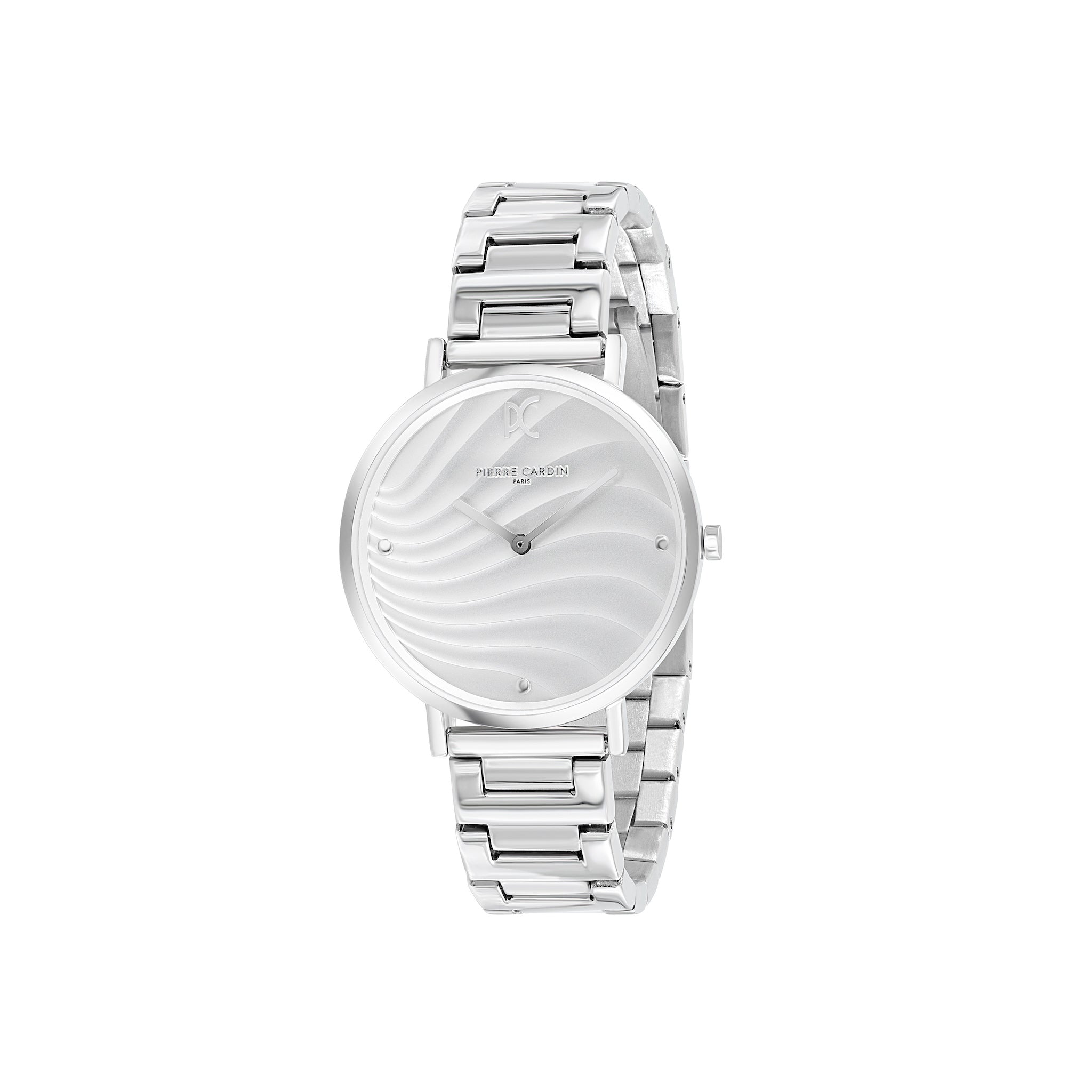 The Belleville patterned dial watch is a contemporary tribute to Pierre Cardin's iconic design and unique style. This women’s watch features a stainless steel Metal links strap, a striking polished silver tone case and a patterned dial with coordinating silver tone watch hands for a truly timeless French style appearance.