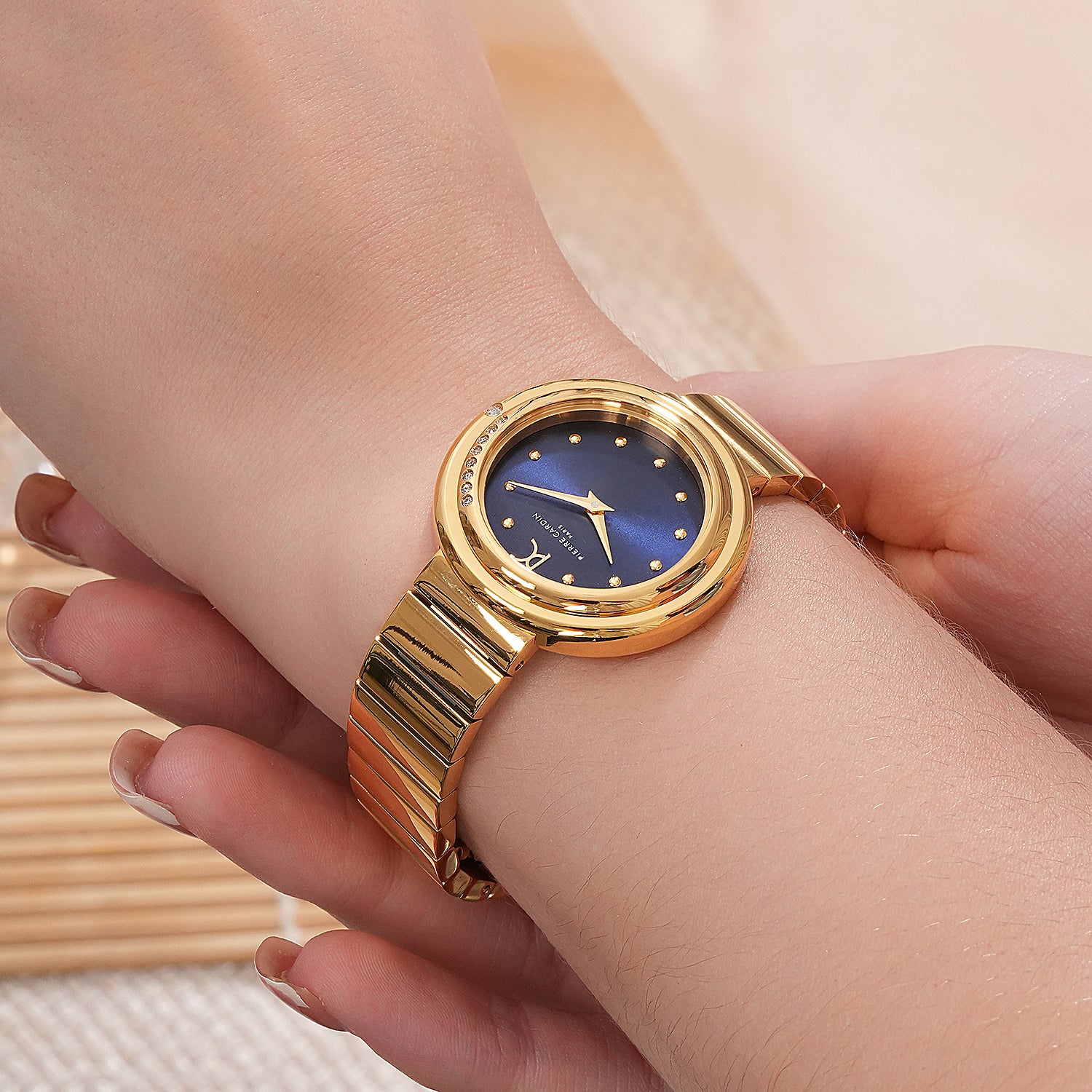 Passy Météore Ladies’ Watch - Gold Case with Blue Dial, Crystal Bezel, and Metal Link Strap