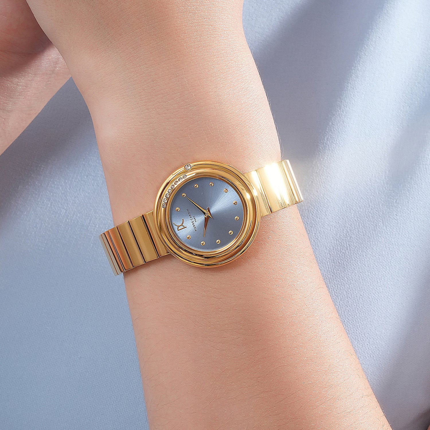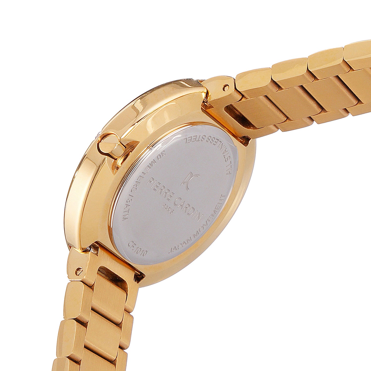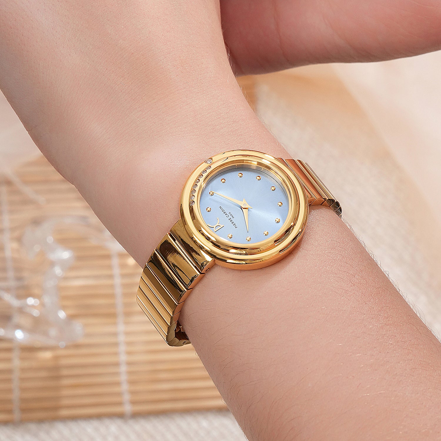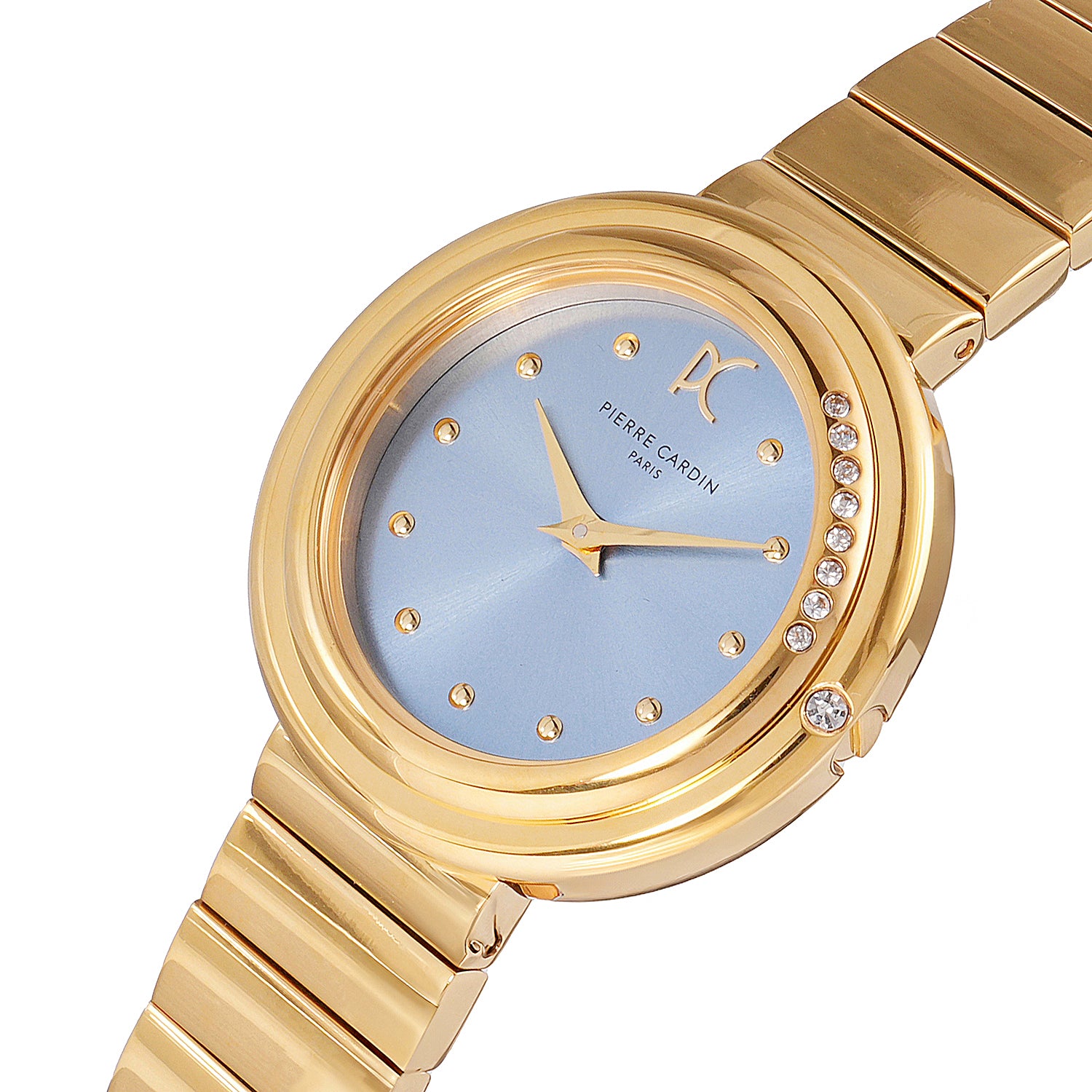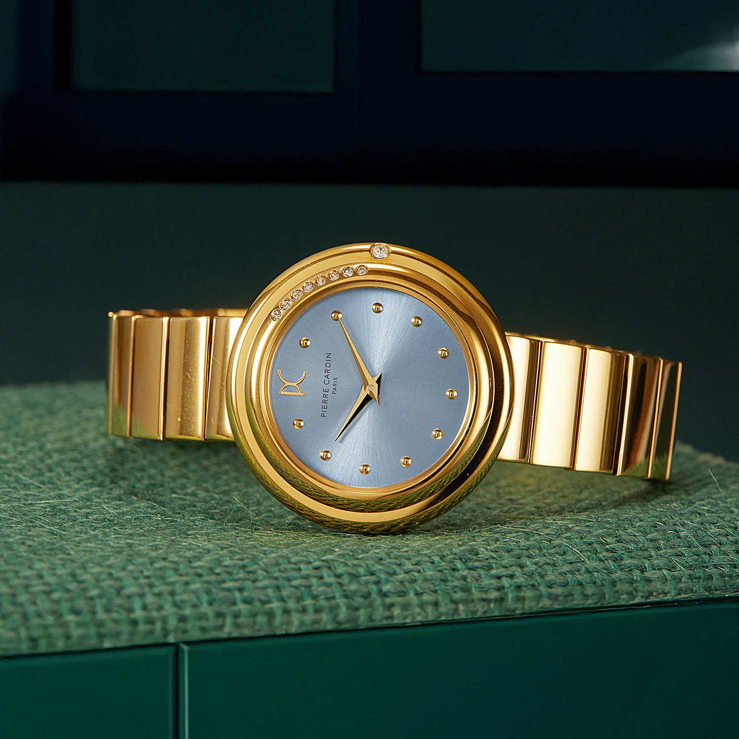 The Passy Météore collection by Pierre Cardin combines timeless luxury with a fresh, vibrant aesthetic. This stunning 32mm ladies’ watch features a radiant gold case, a dazzling crystal-adorned bezel, and a serene clear sky dial accented with sparkling crystals. Its unique metal link strap adds a modern and elegant touch, while the hidden crown ensures a sleek, seamless design. Powered by a precise two-hand quartz movement, the Passy Météore watch is a sophisticated accessory for women who value style, craftsmanship, and Parisian charm.
