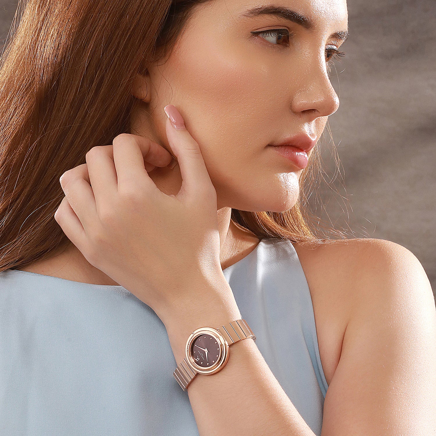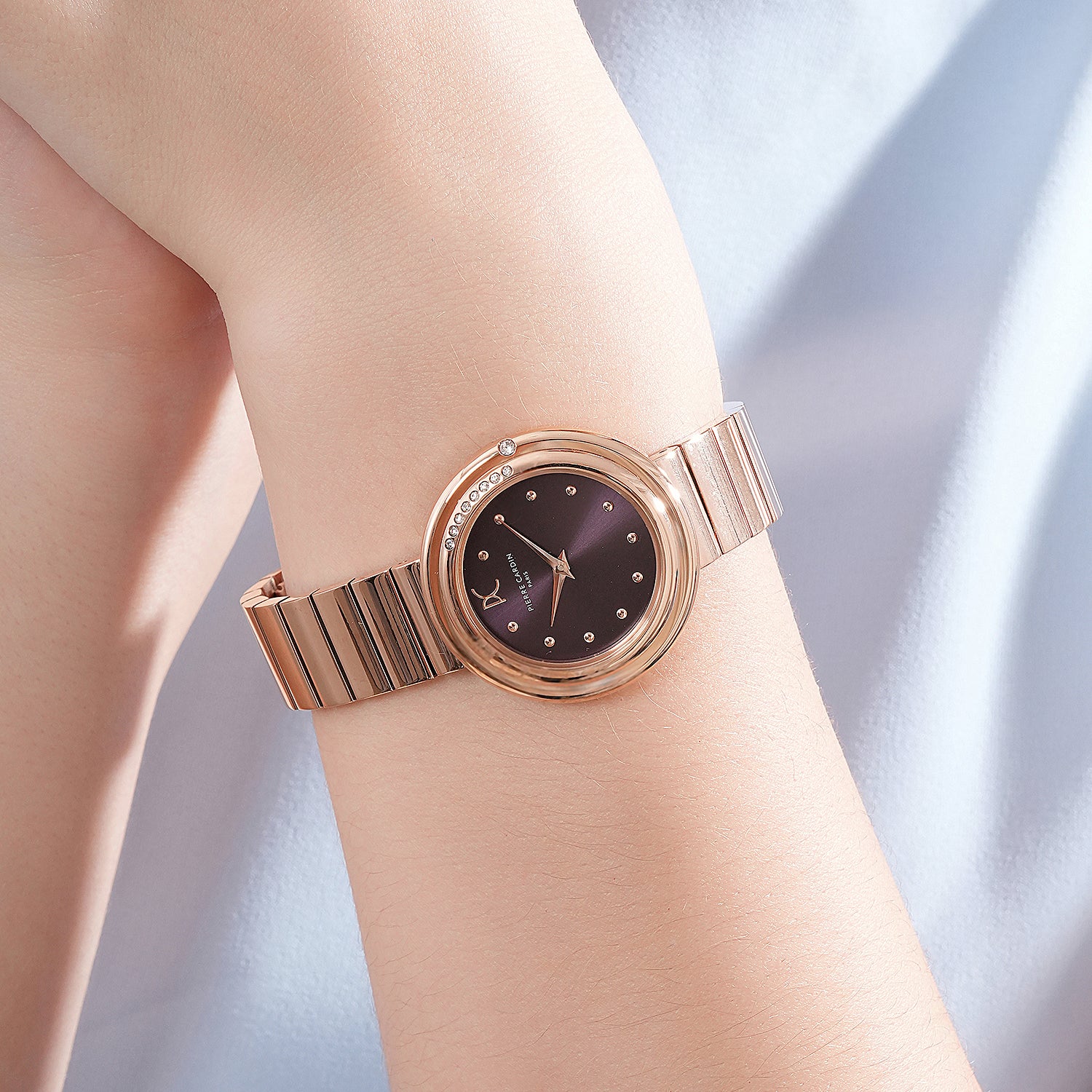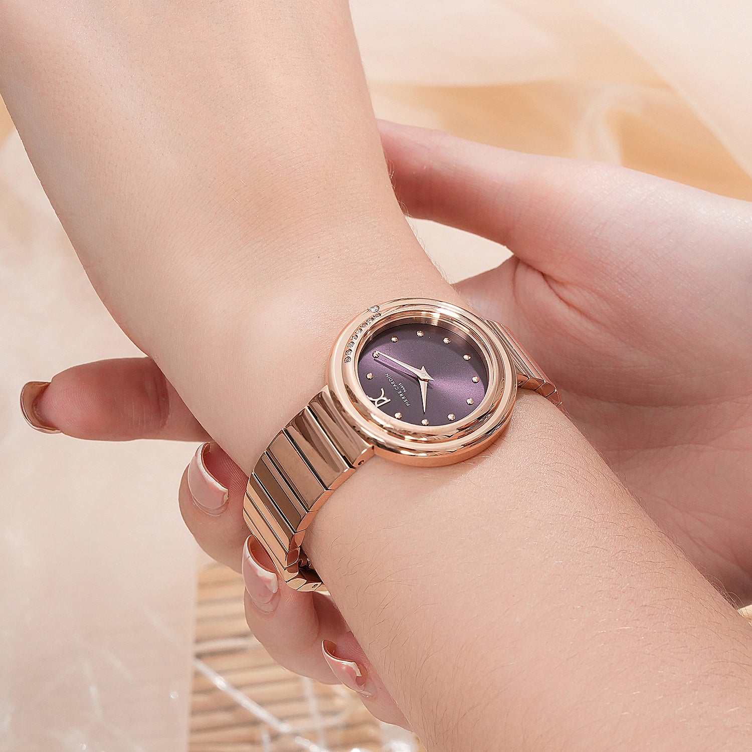 Passy Météore Ladies’ Watch - Rose Gold Case with Plum Dial, Crystal Bezel, and Metal Link Strap