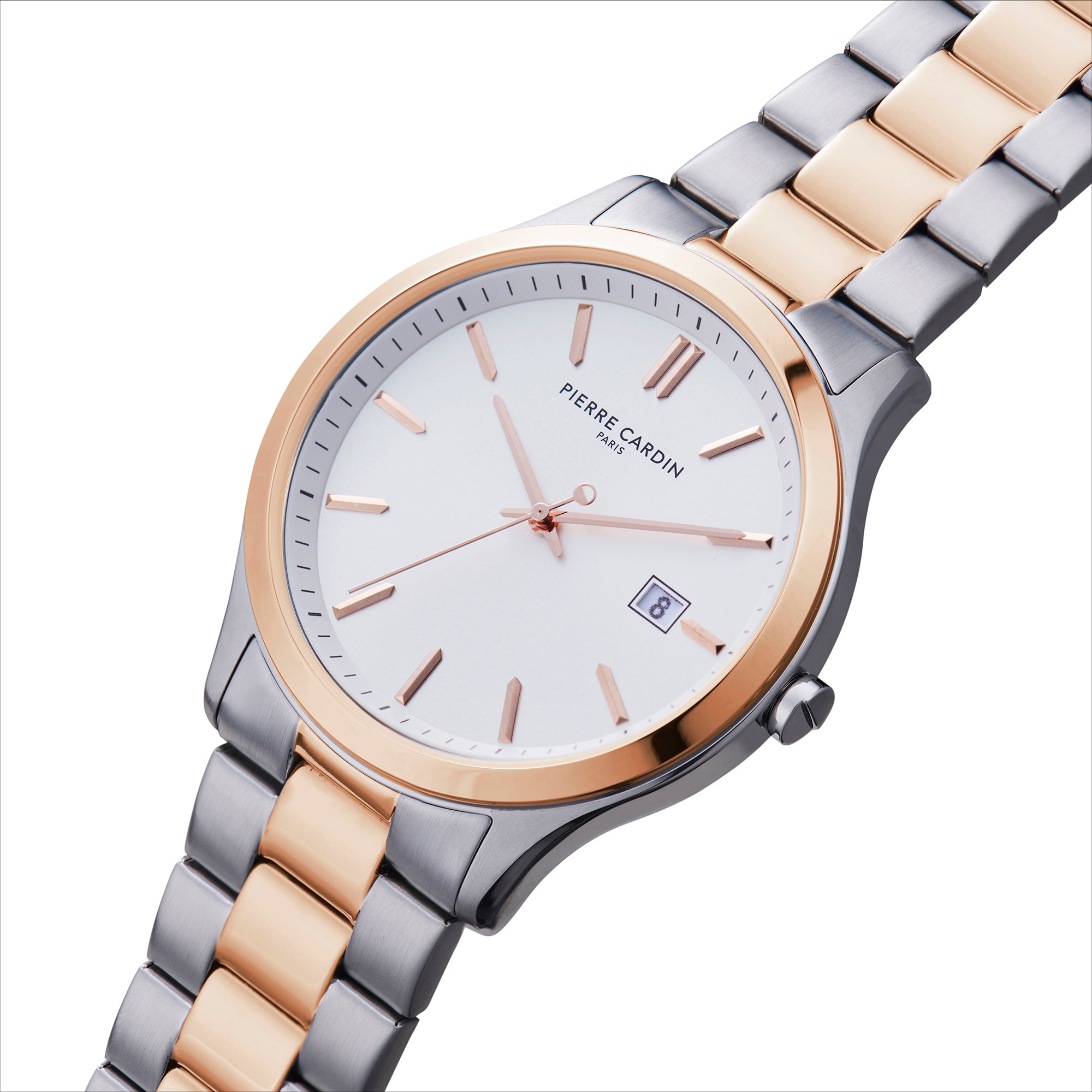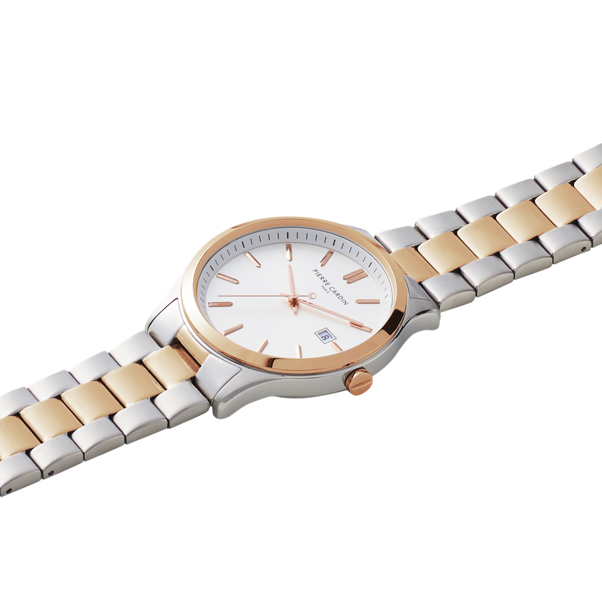 Épinettes Essential Two Tone Rose Gold and Steel Watch with Silver Dial and Metal Links Strap