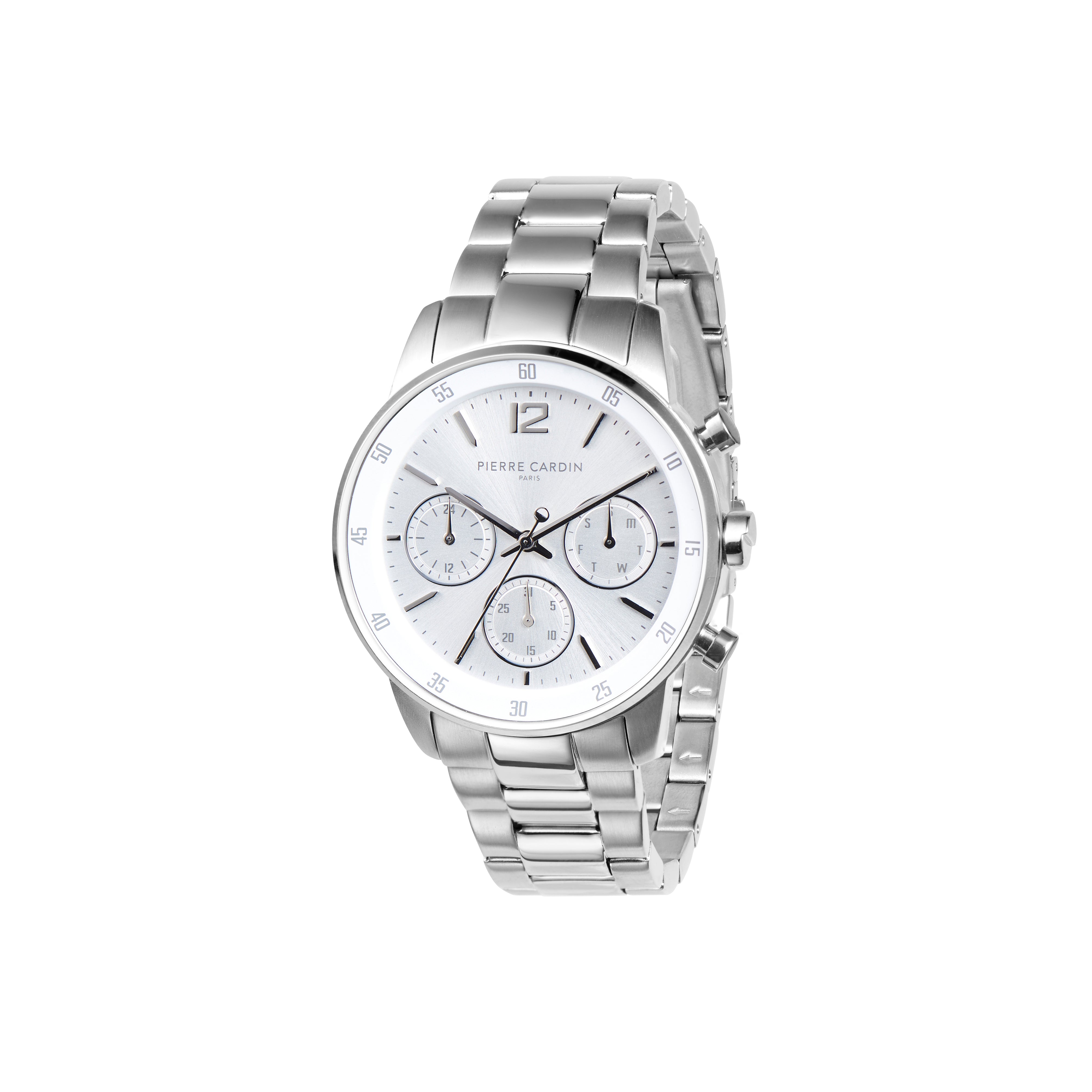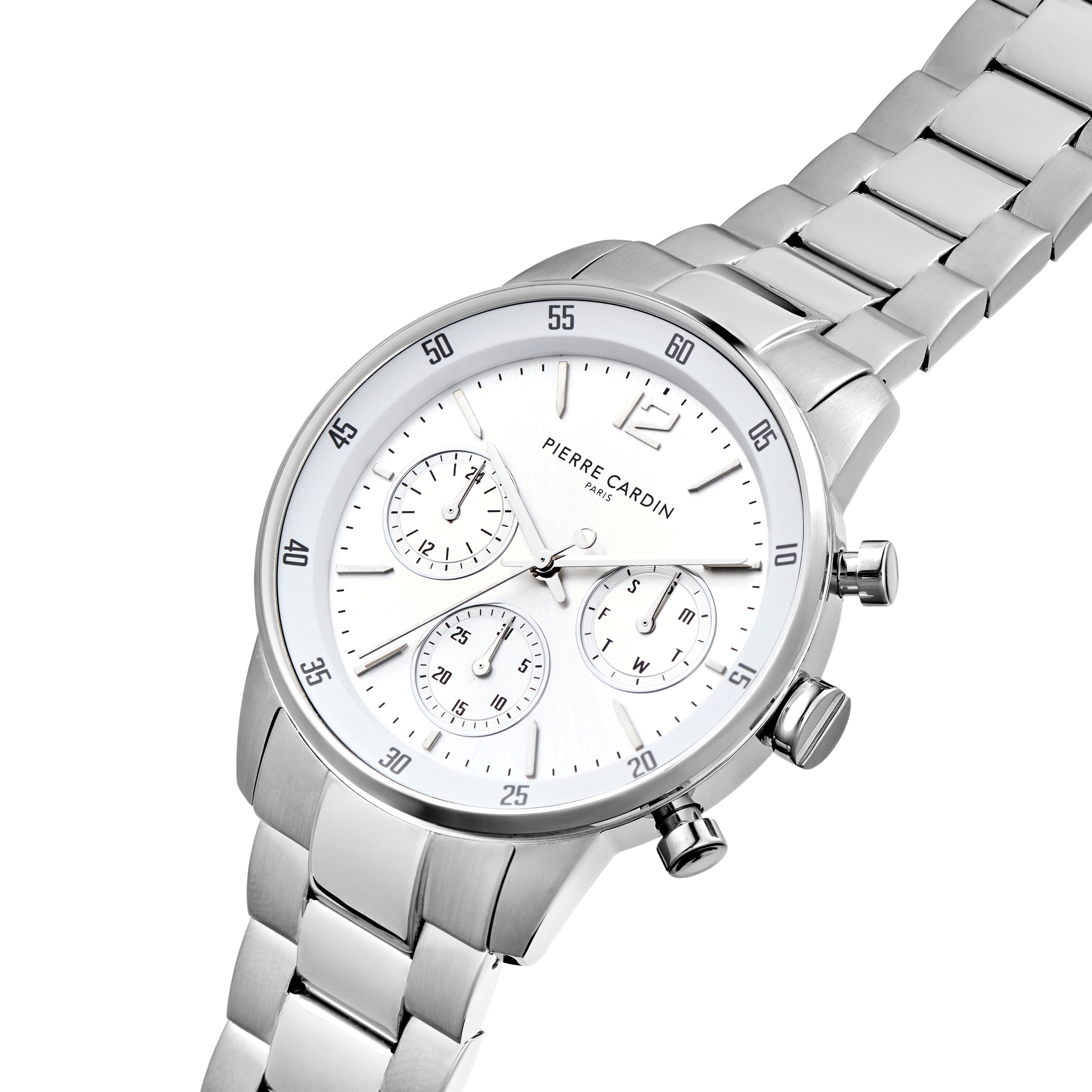 The Montrouge Prim Multifunction metal link watch for men is a statement piece that stays close to Pierre Cardin’s iconic design inspired by the cosmopolitan style of the Montrouge district. The dial features a sporty Multifunction movement, The polished Silver Stainless steel watch case offers to complement a metal links strap, a fine addition to all your outfits night or day.