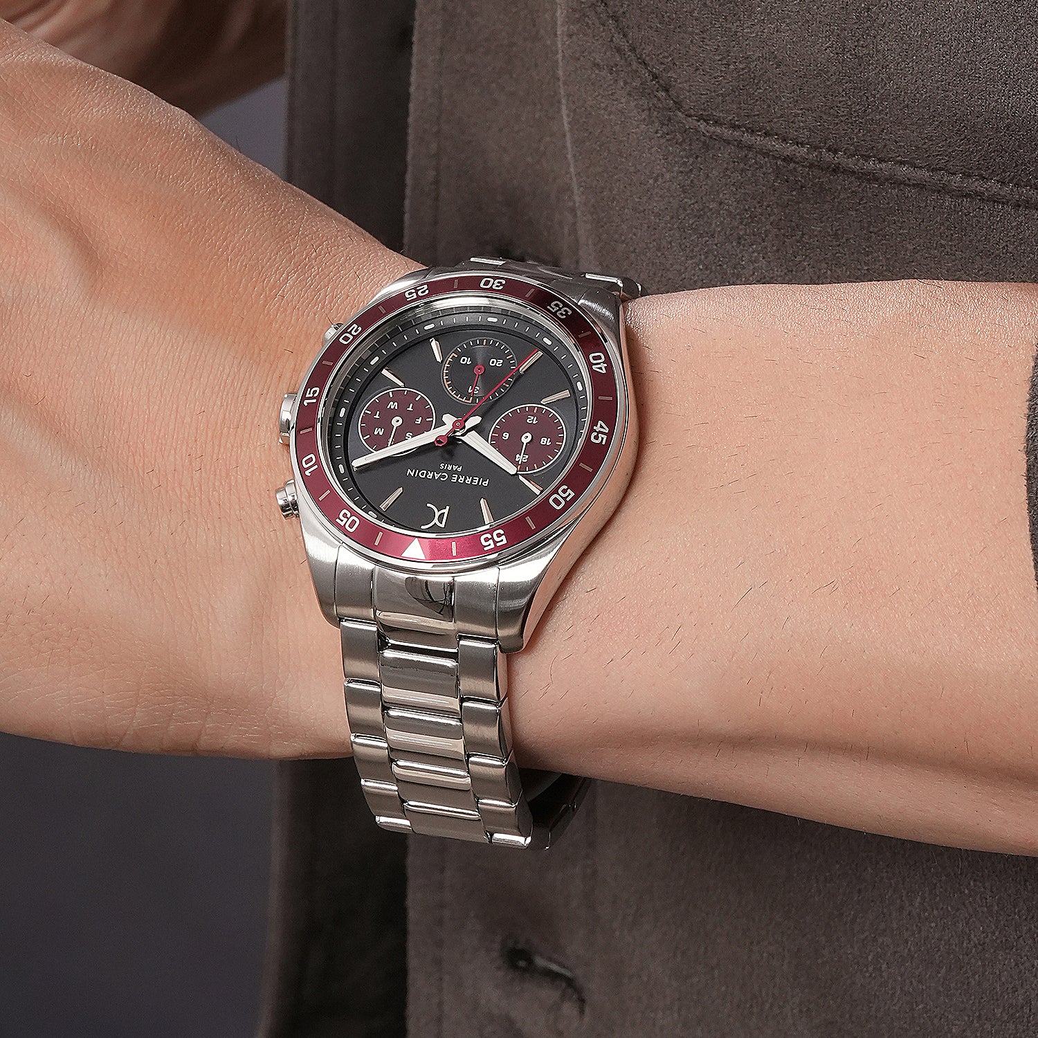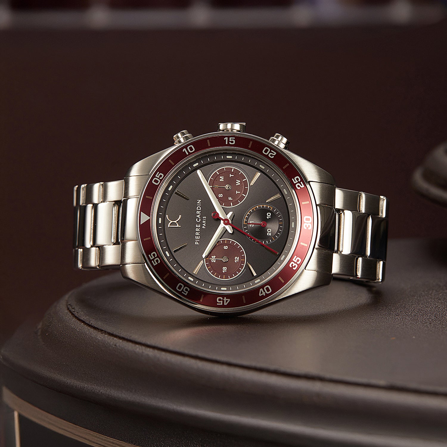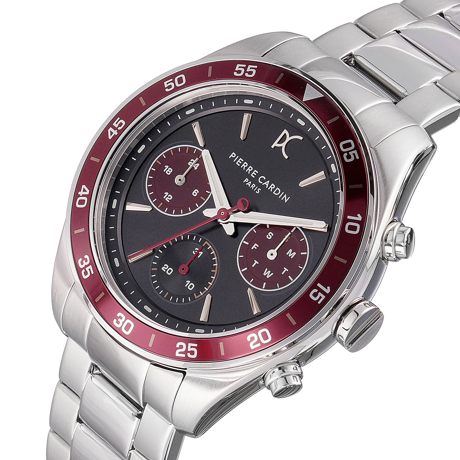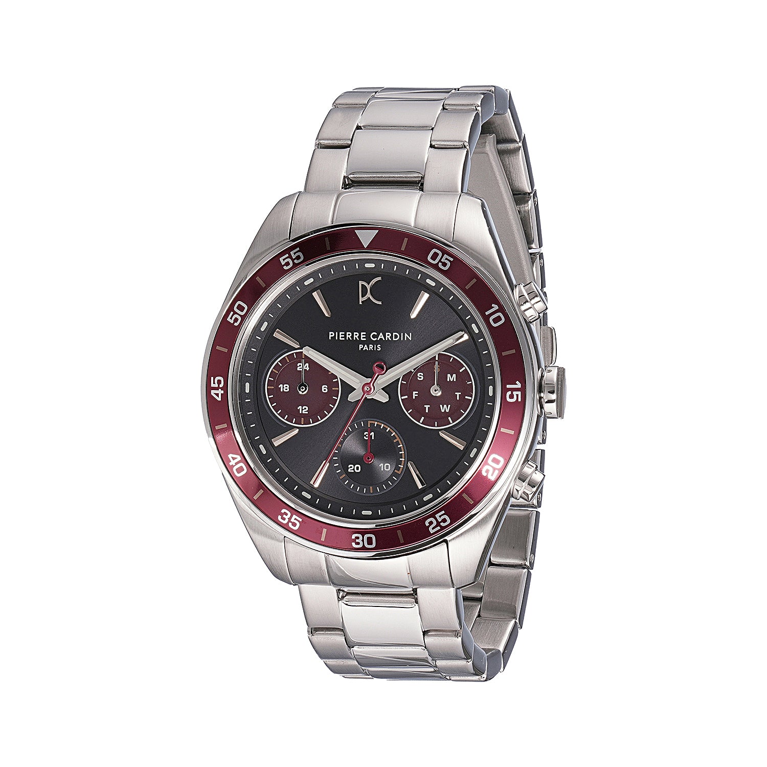 Nation Cristal Men’s 42mm Multifunction Watch - Silver Case, Black Dial with Wine Panda Eyes, Wine Bezel, and Silver Metal Strap