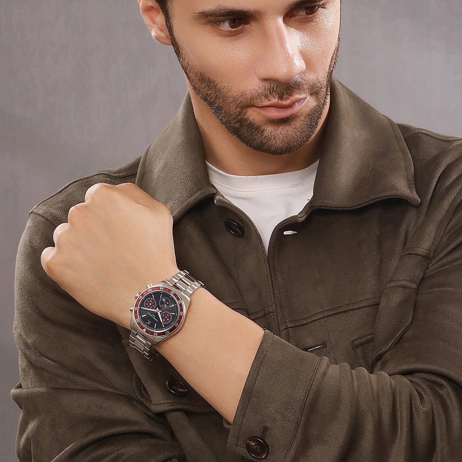 The Nation Cristal men’s watch is a stylish and bold timepiece, featuring a 42mm silver case, black dial with striking wine-colored panda eyes, and a matching wine bezel. Paired with a sleek silver metal strap, this watch combines elegance with a modern edge. Equipped with a multifunction movement, it includes day, date, and 24-hour sub-dials for added functionality. Perfect for the discerning gentleman, the Nation Cristal watch is a statement piece that blends quality craftsmanship with eye-catching design, suitable for any occasion.