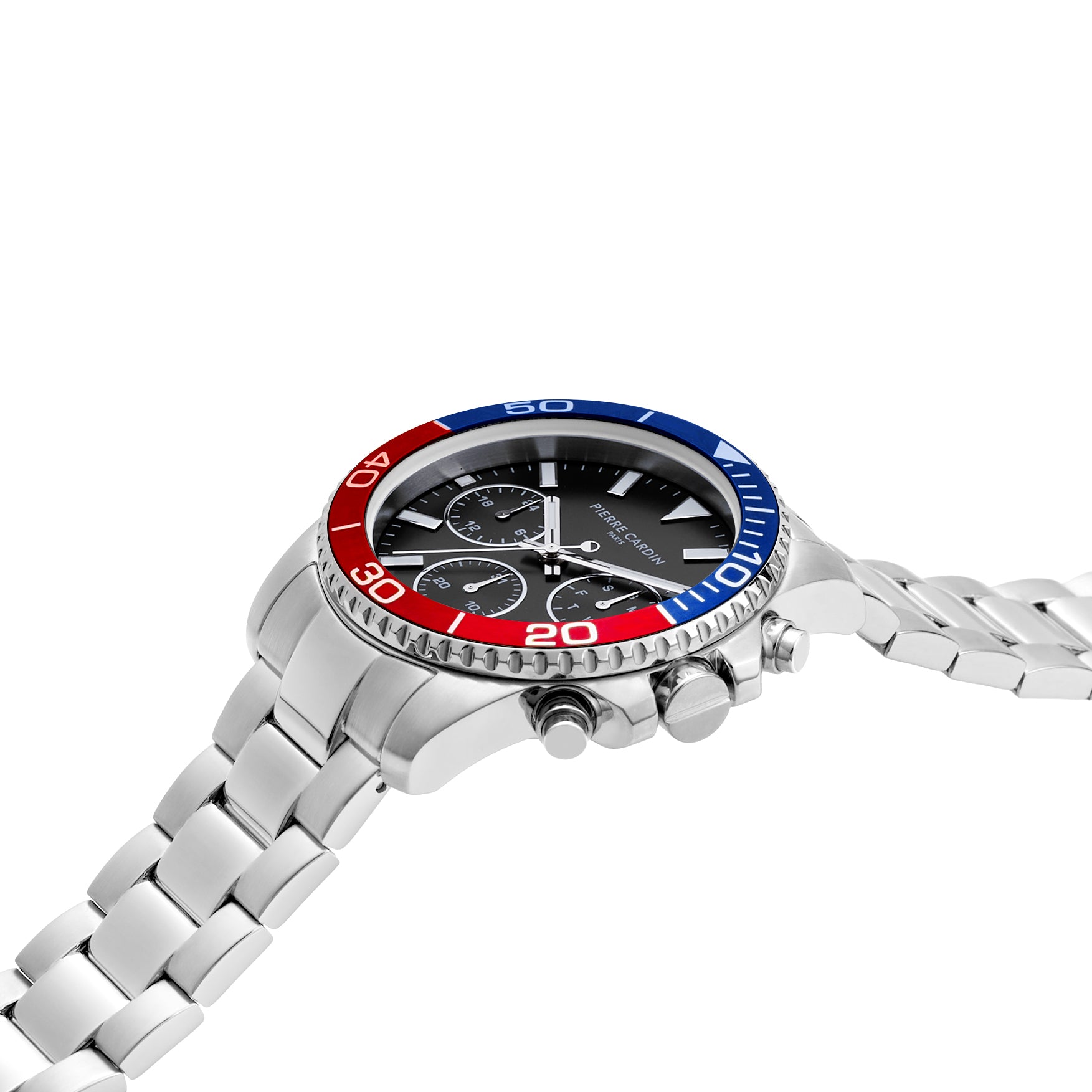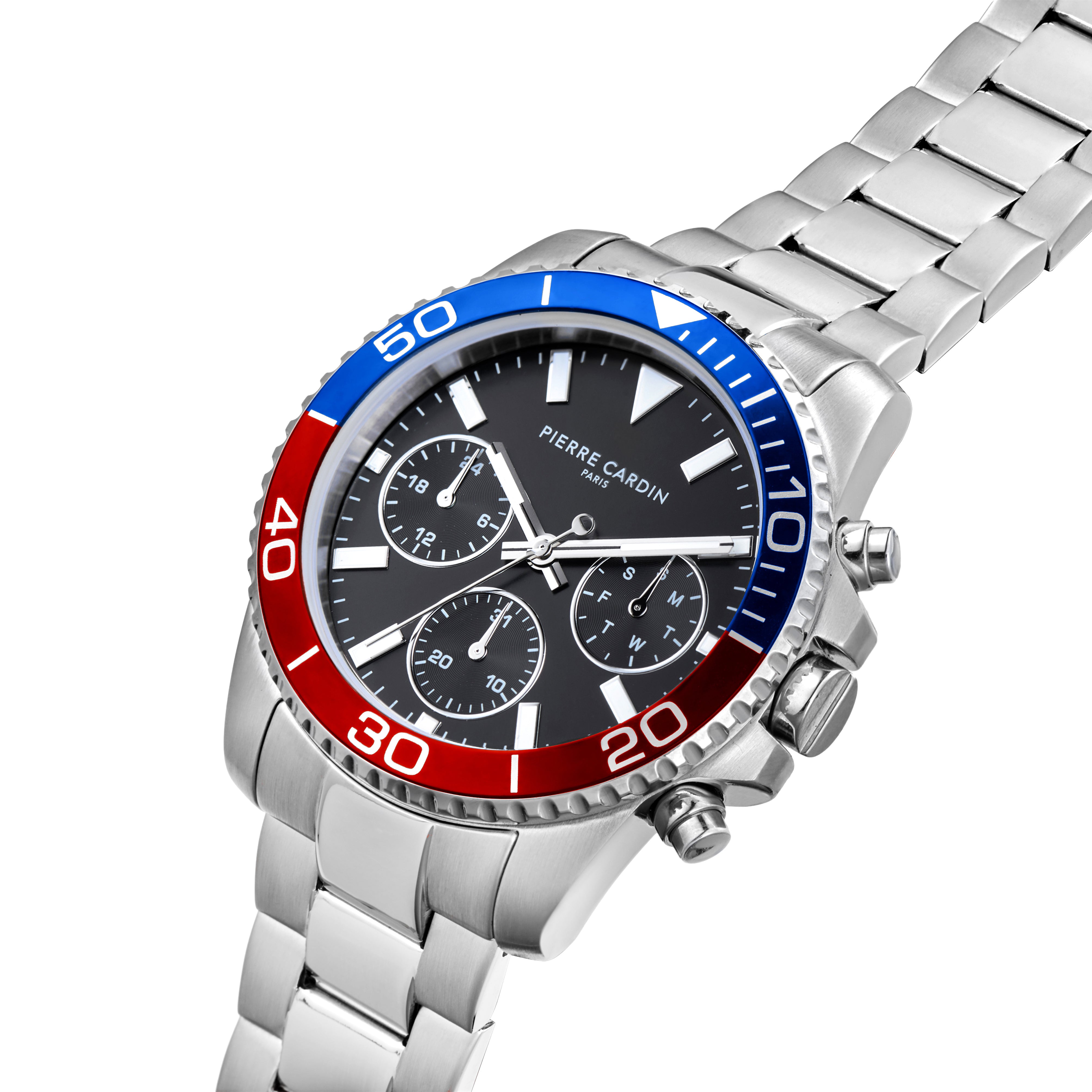 Nation Posh Multifunction watch with Black Dial and Blue Red bezel with a Metal Links Strap