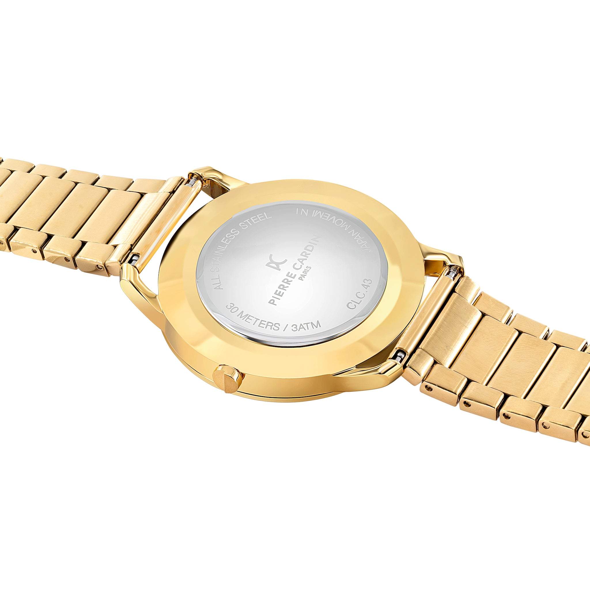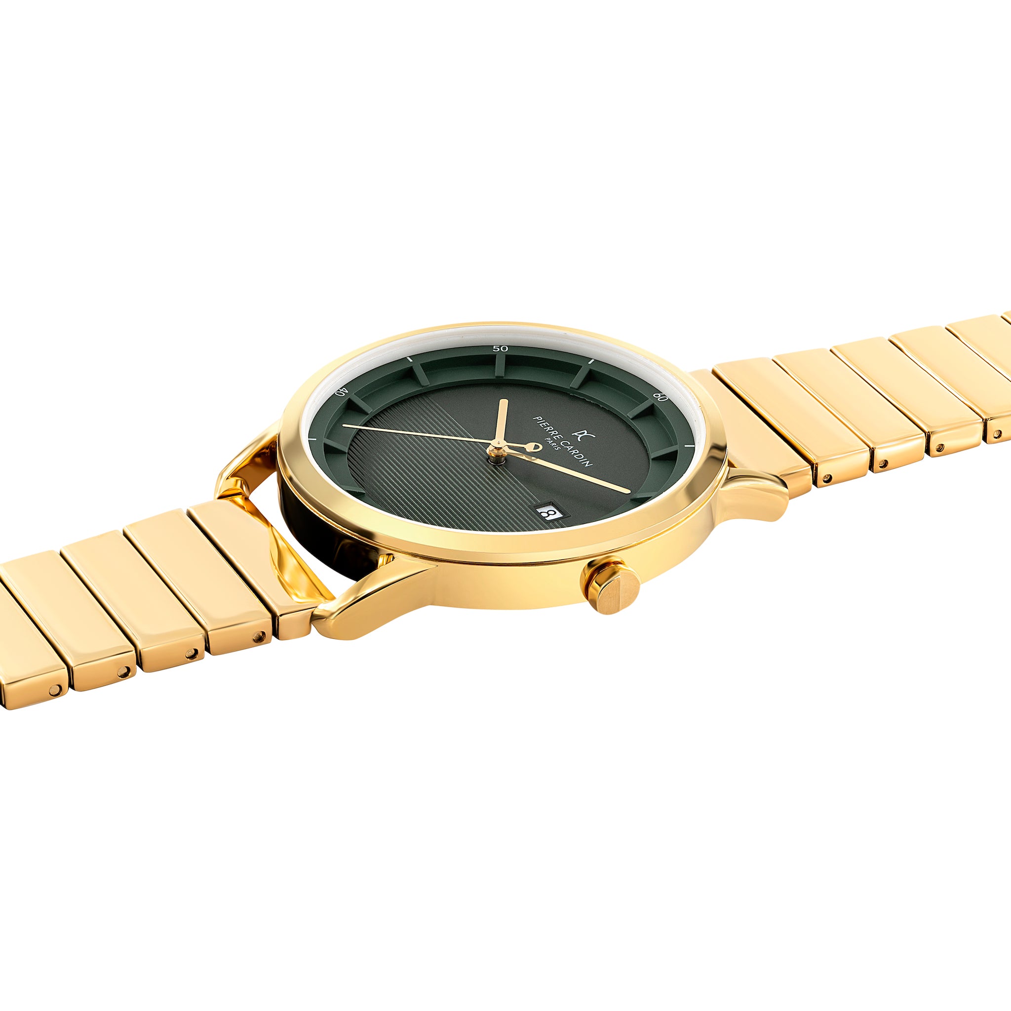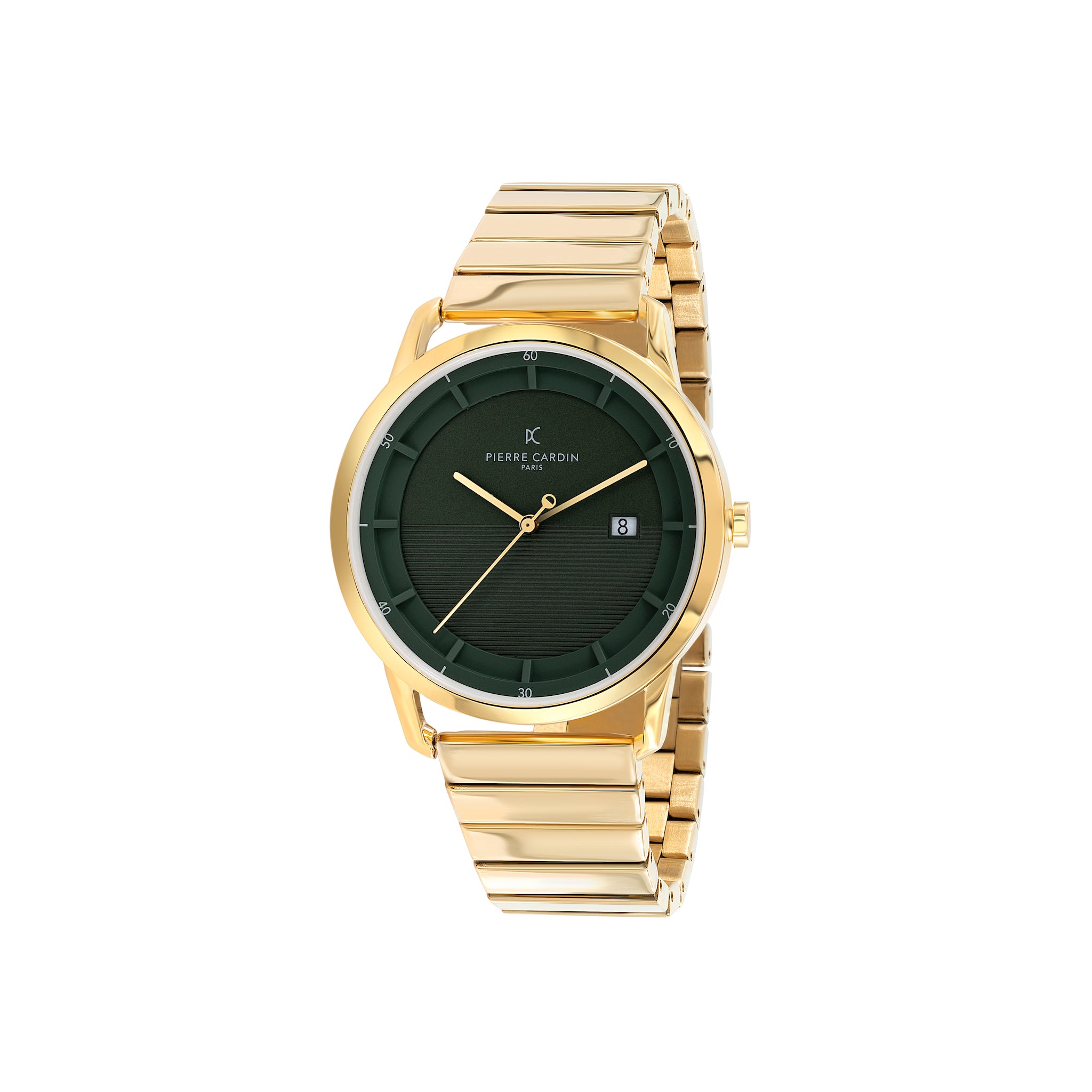 Pierre Cardin mens watch inspired by the Parisian region of St. Germain, this watch features a gold tone stainless steel case, Green dial with lines pattern and a metal link strap. The three-hand movement includes a date display at the 3 o'clock position, and the watch is powered by a reliable quartz movement. The metal link strap is made of stainless steel, adding a touch of luxury to the overall design. This watch is suitable for both casual and formal occasions, and would make a great addition to any wardrobe.
