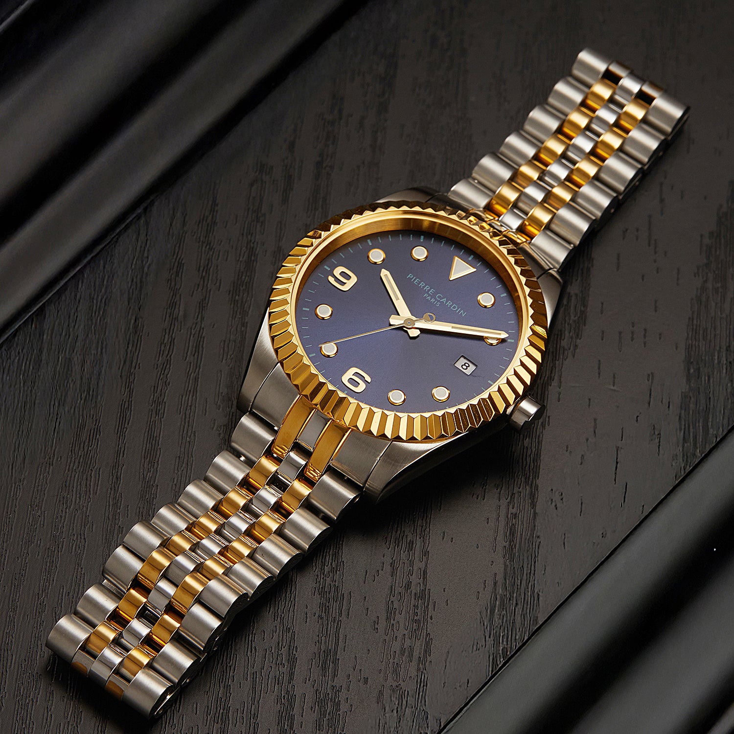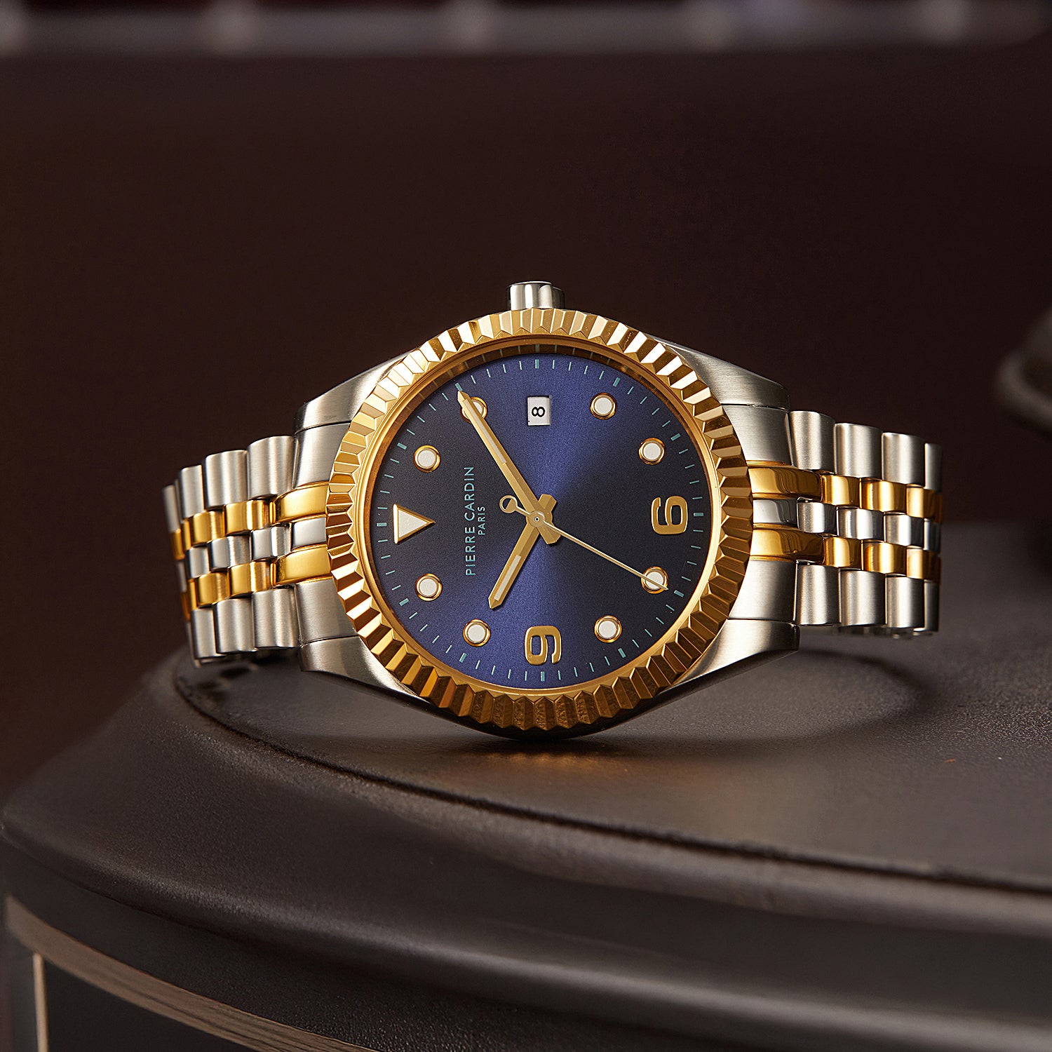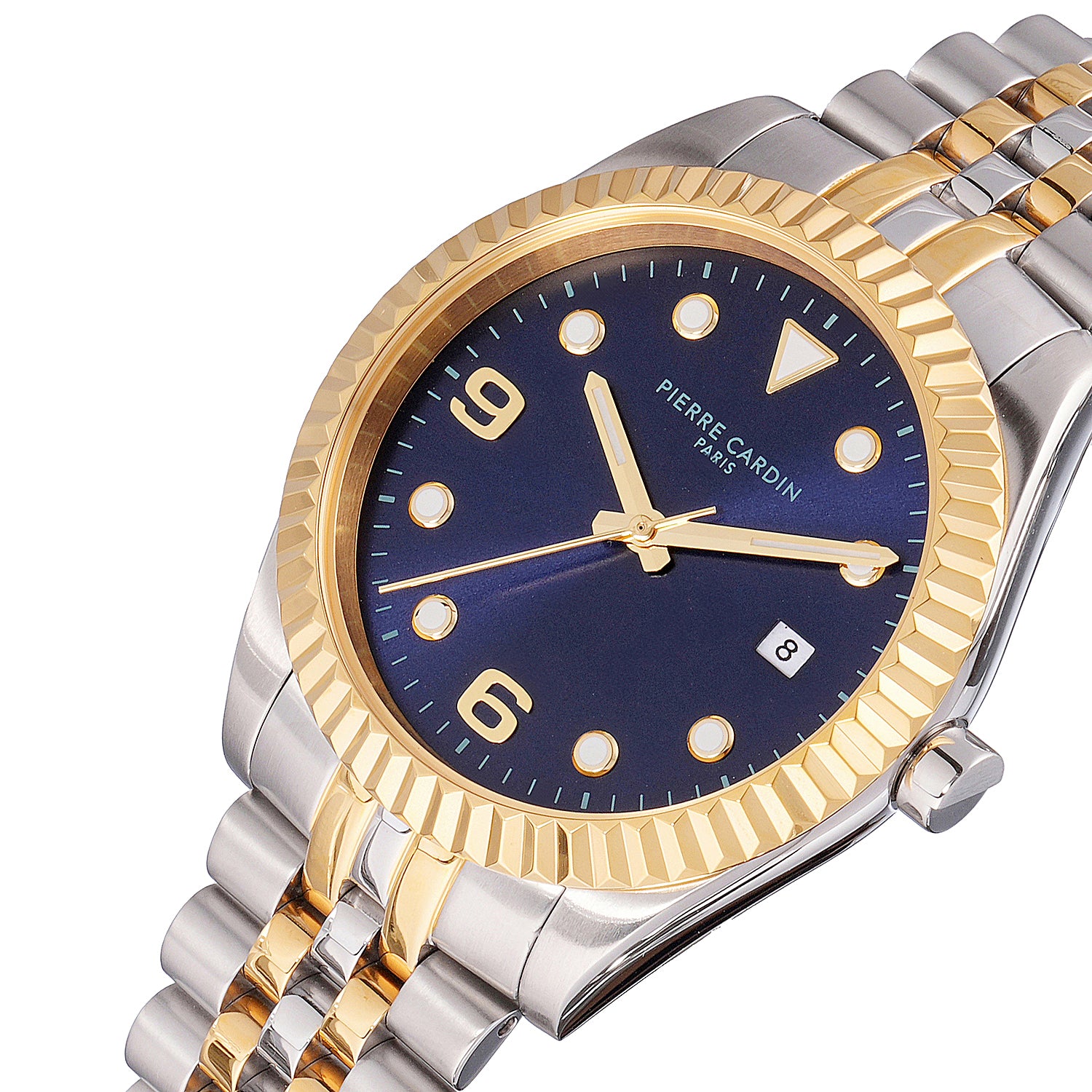 The Opéra Timbre men’s watch by Pierre Cardin is a striking blend of classic elegance and modern flair. Featuring a sophisticated two-tone case in gold and silver, this timepiece is complemented by a rich blue dial adorned with luxurious gold hour markers and hands. Paired with a comfortable stainless steel Jubilee strap, it’s powered by a reliable 3-hand quartz movement with a date function. Perfect for any occasion, the Opéra Timbre watch captures the essence of Parisian refinement, making it an exceptional choice for those who value style and quality craftsmanship.