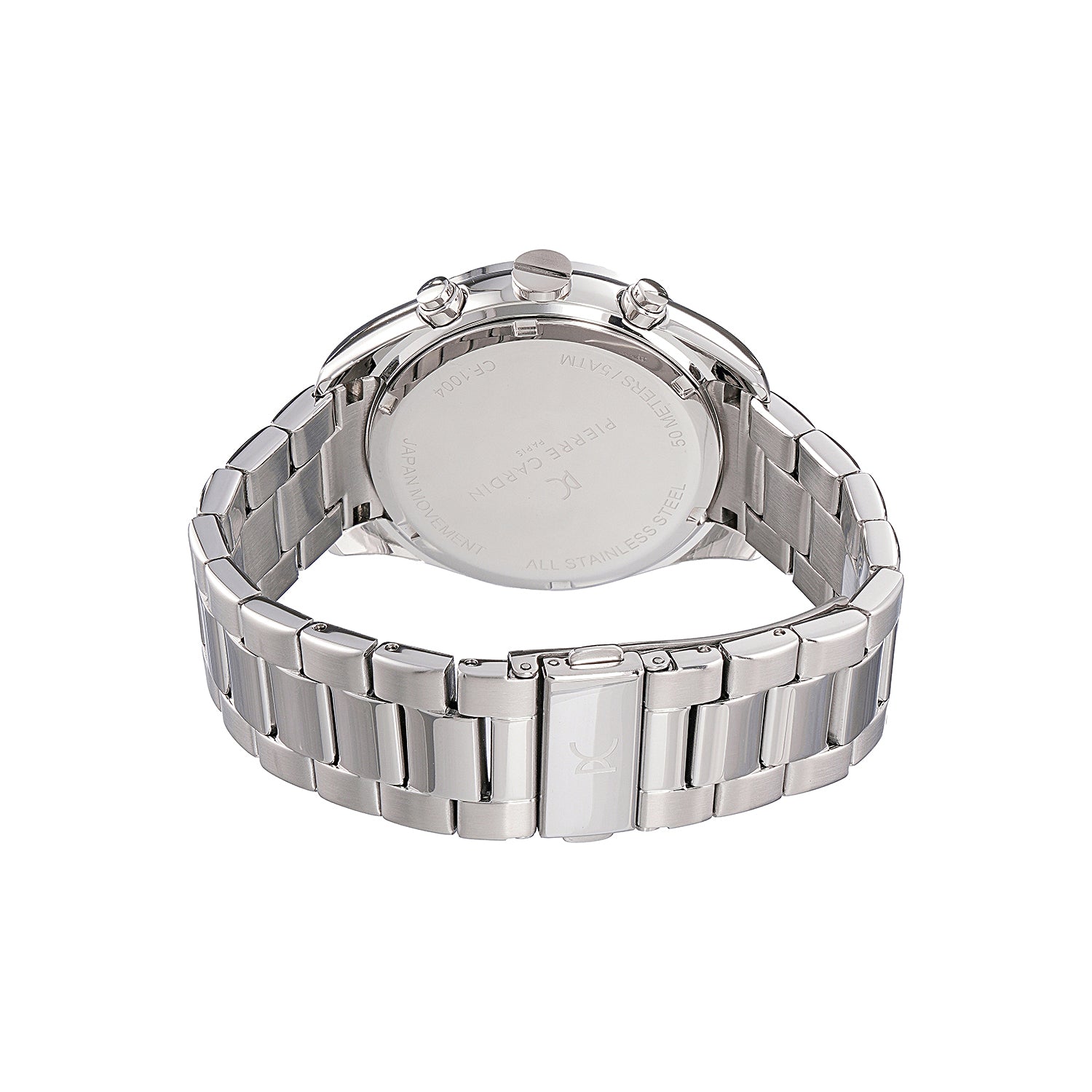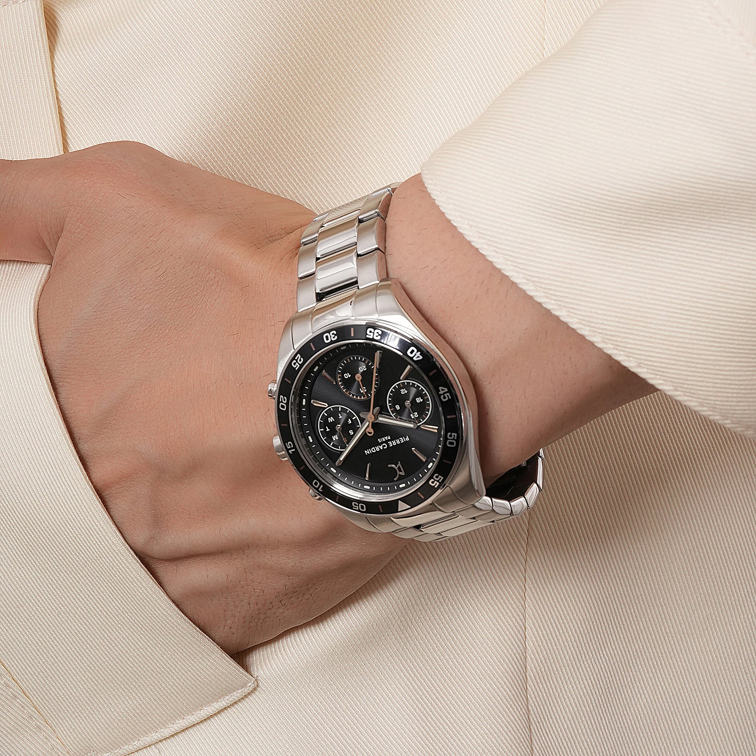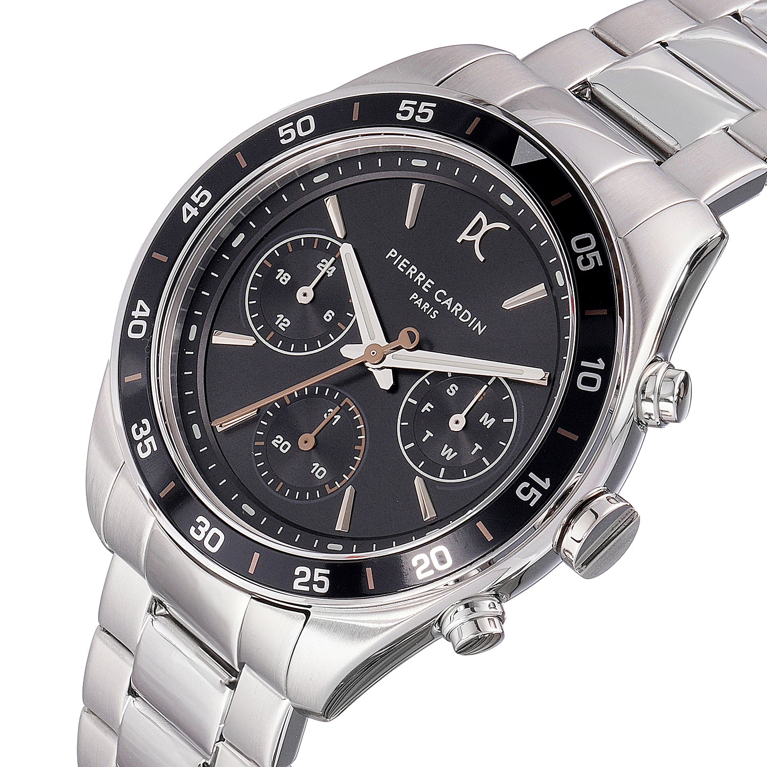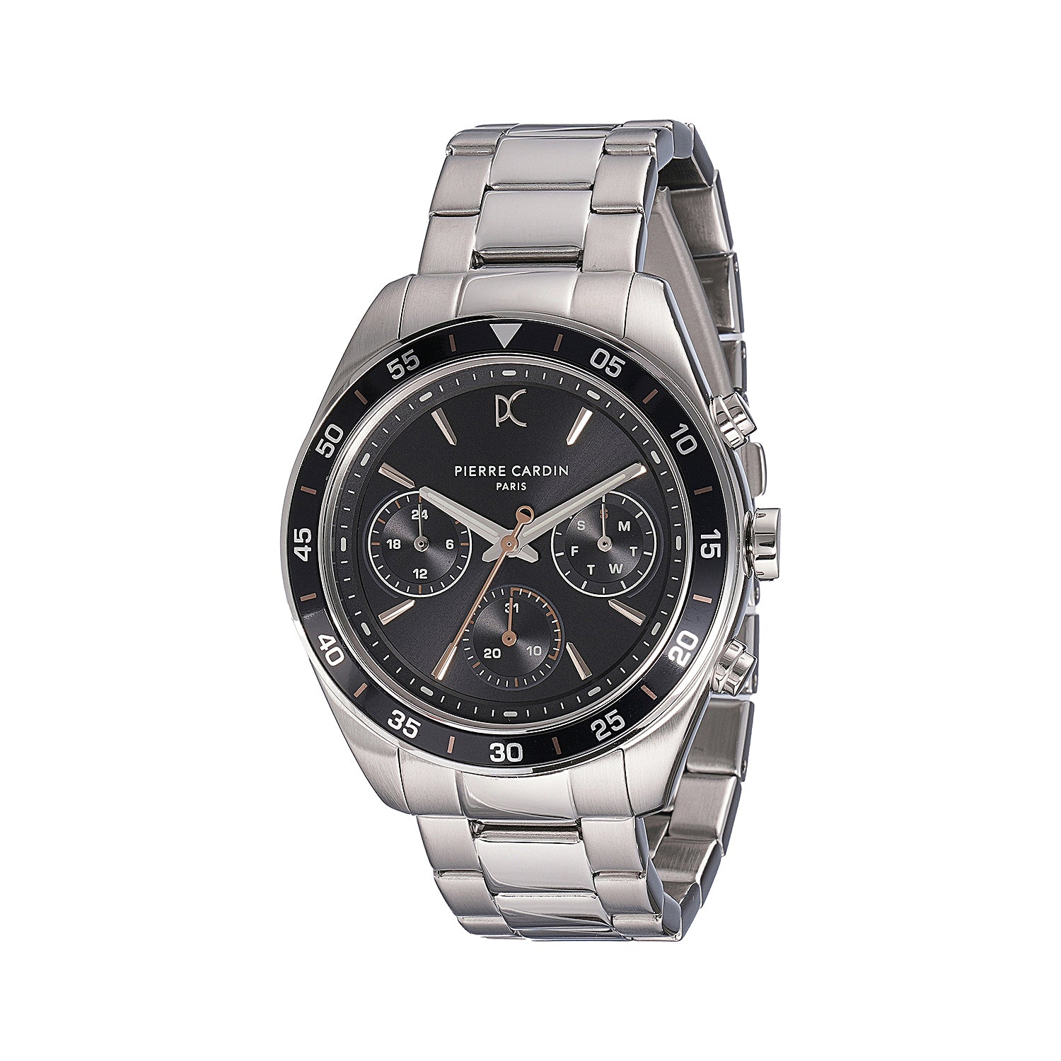 Nation Cristal Men’s 42mm Multifunction Watch - Silver Case, Black Dial, Black Bezel with Silver Metal Strap