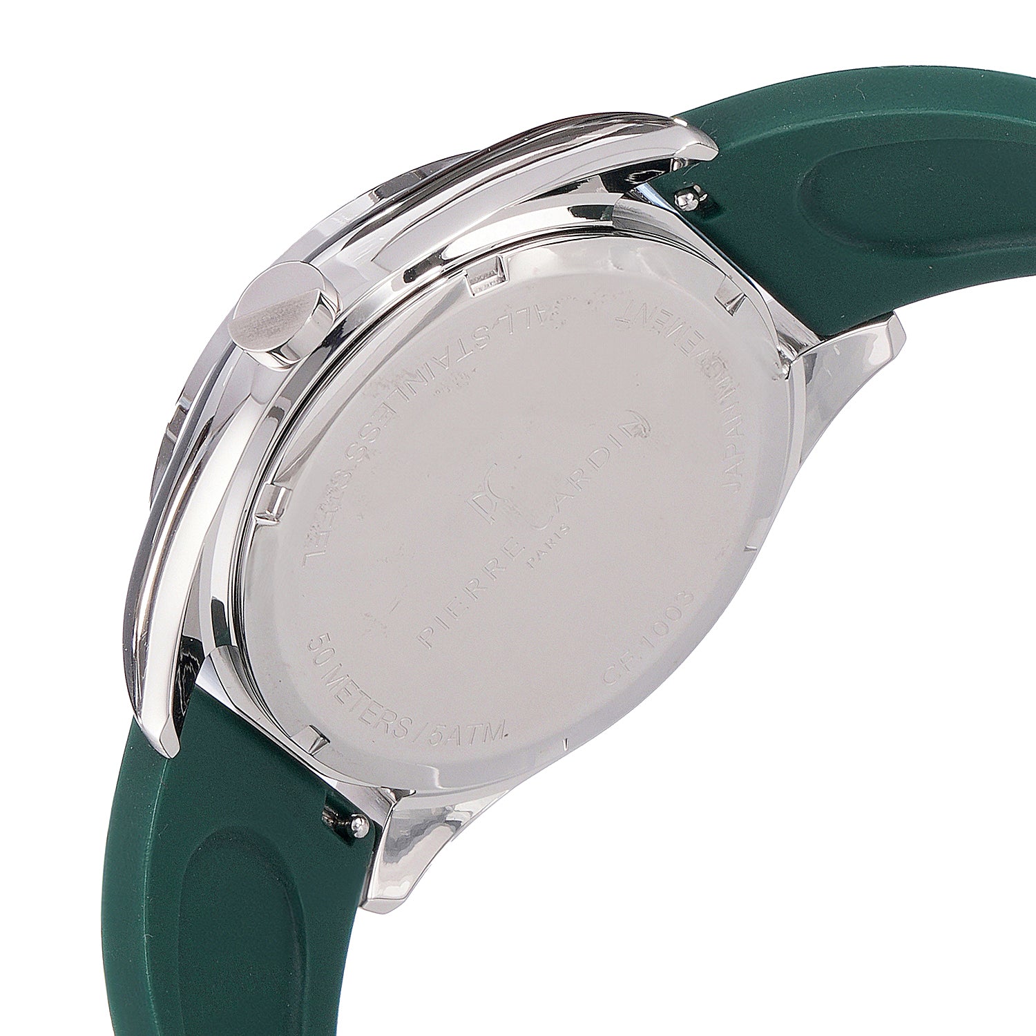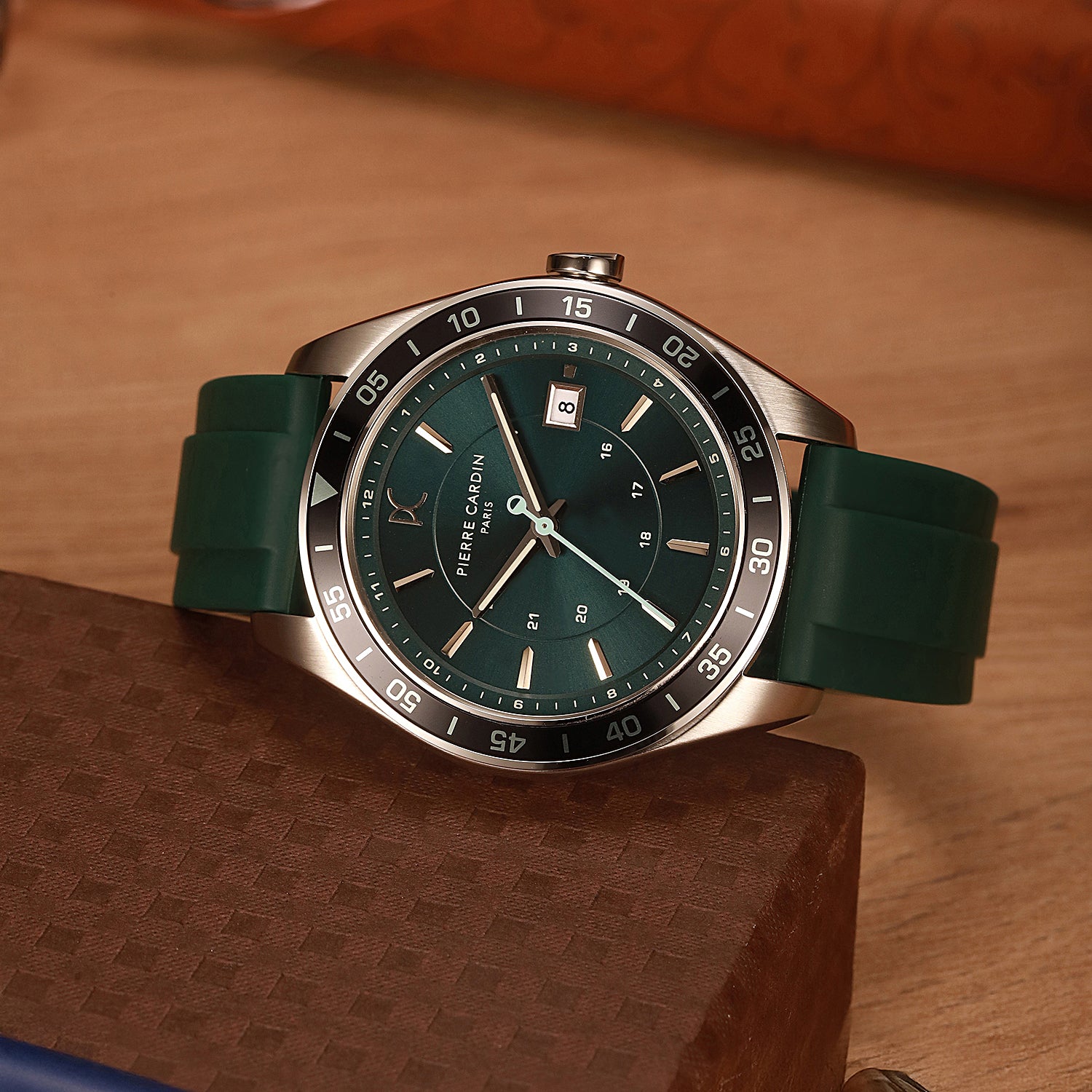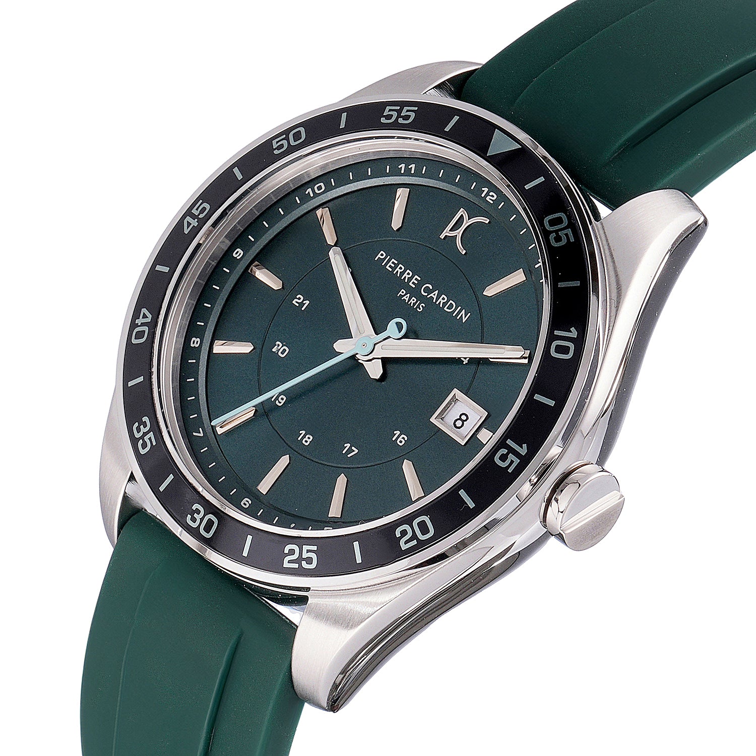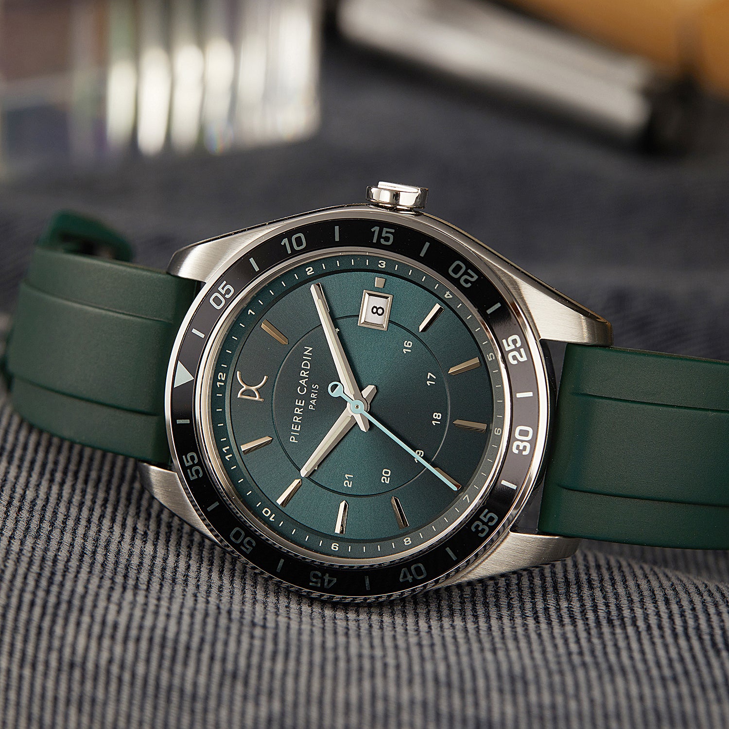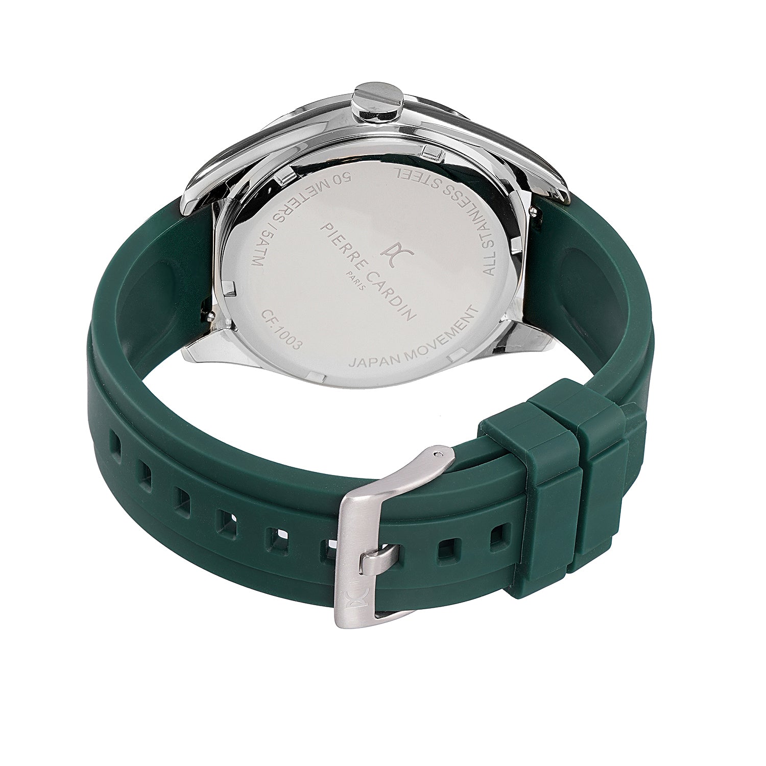 The Nation Verre men’s watch offers a fresh, sporty style with its unique color combination. Featuring a 42mm case, vibrant green dial, bold black bezel, and a durable green silicone strap, this watch is designed to stand out. Powered by a reliable 3-hand quartz movement with a date function, it’s built for performance and versatility. Perfect for both active days and casual wear, the Nation Verre watch combines functionality with a modern, eye-catching design.