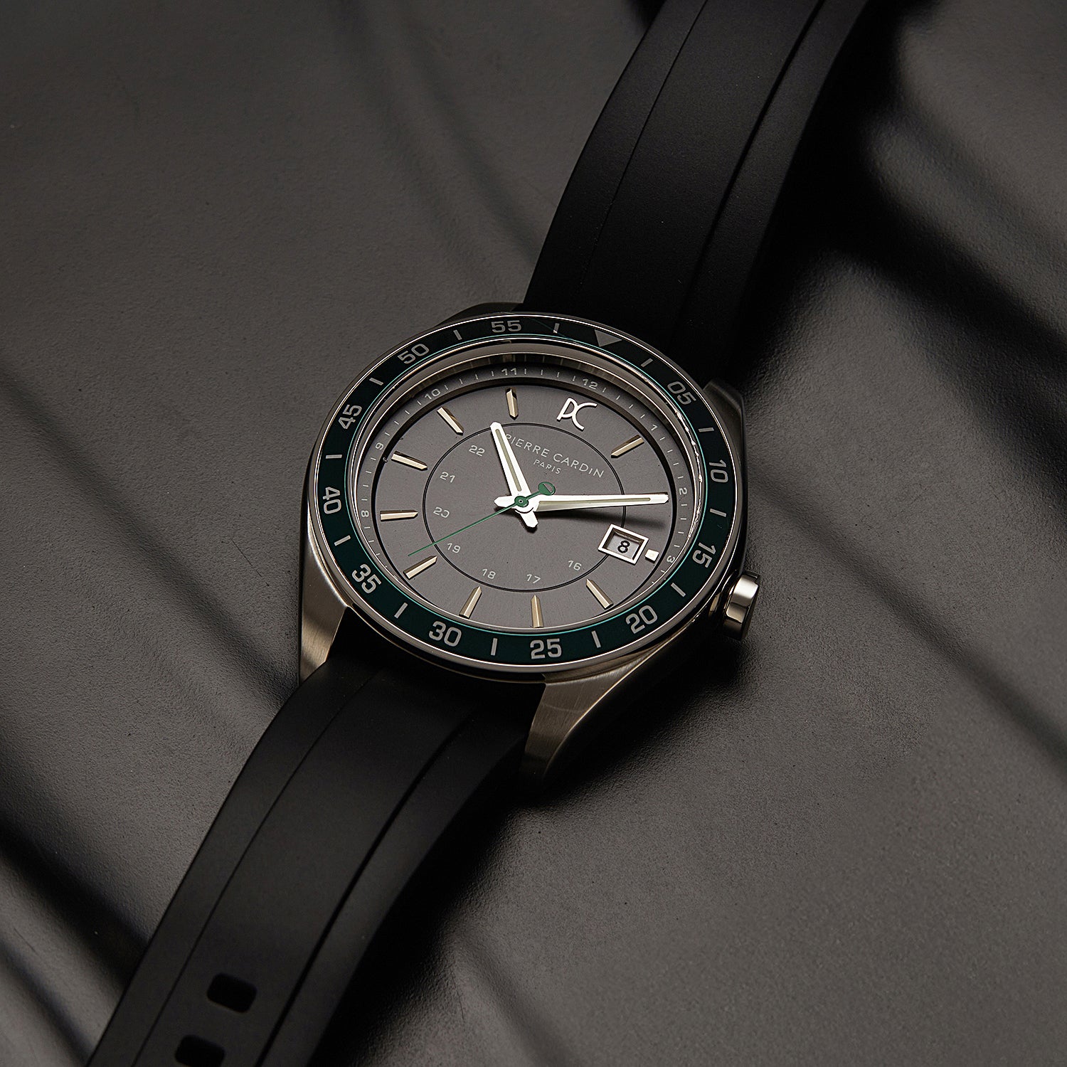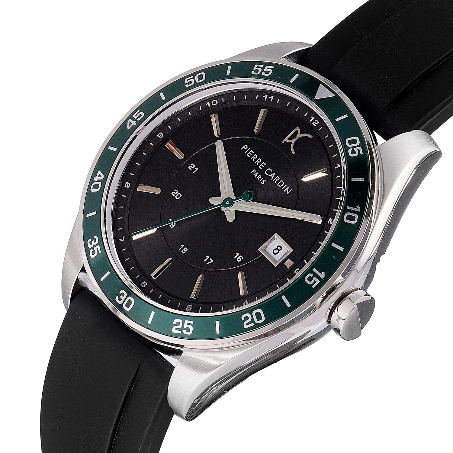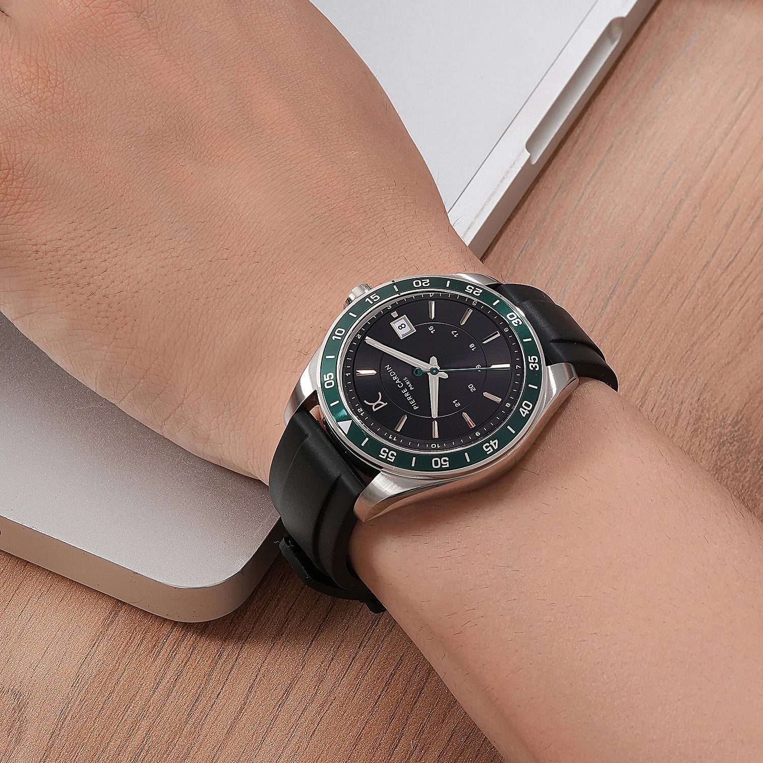 Nation Verre Men’s 42mm Sport Watch - Silver Case, Green Bezel, Black Dial with Black Silicone Strap
