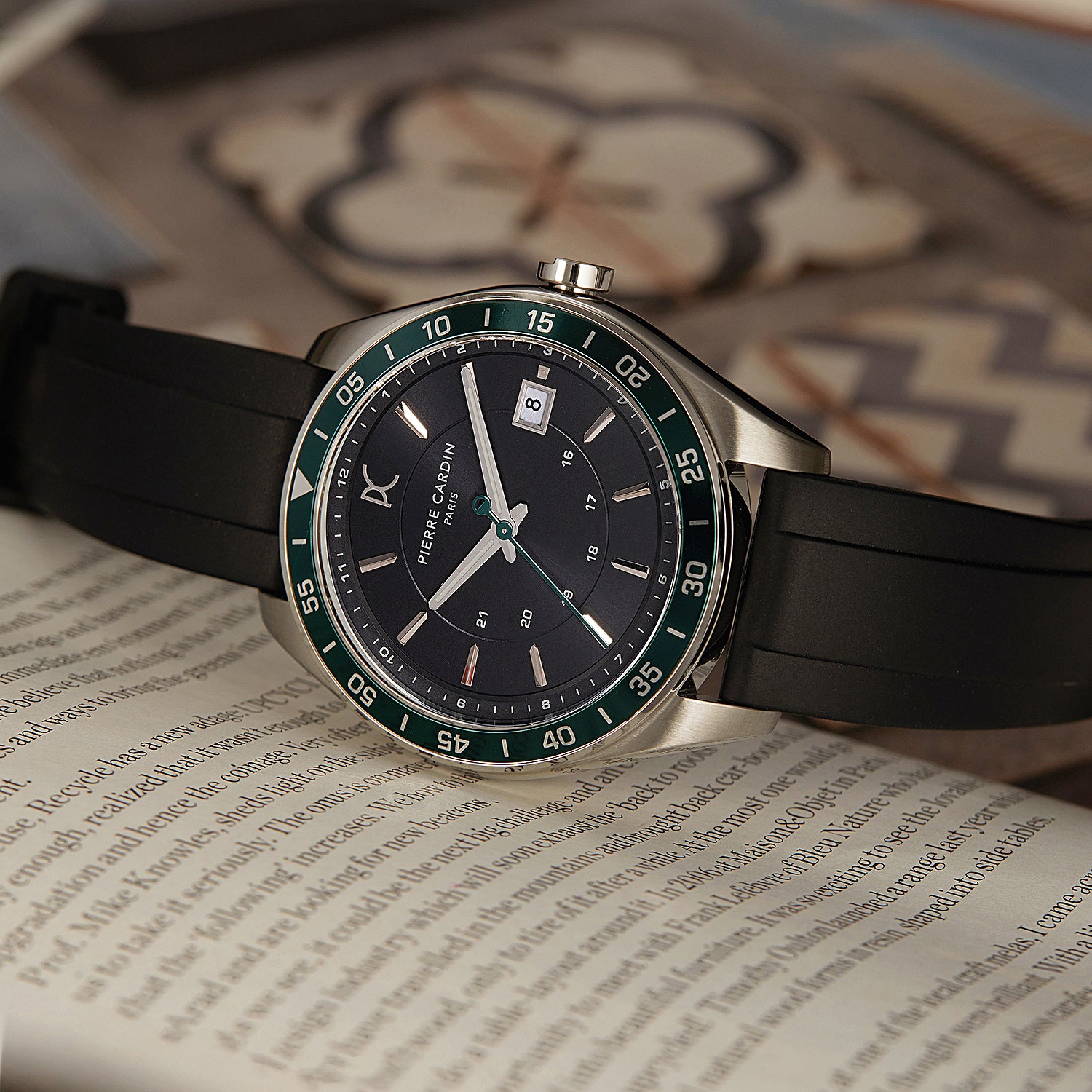 The Nation Verre men’s watch offers a unique and stylish look with its silver 42mm case, bold green bezel, and sleek black dial. Paired with a durable black silicone strap, this timepiece is designed for both comfort and versatility. Powered by a reliable 3-hand quartz movement with a date function, it’s perfect for everyday wear and active lifestyles. The contrasting colors make the Nation Verre watch an eye-catching accessory, blending sporty appeal with modern sophistication.