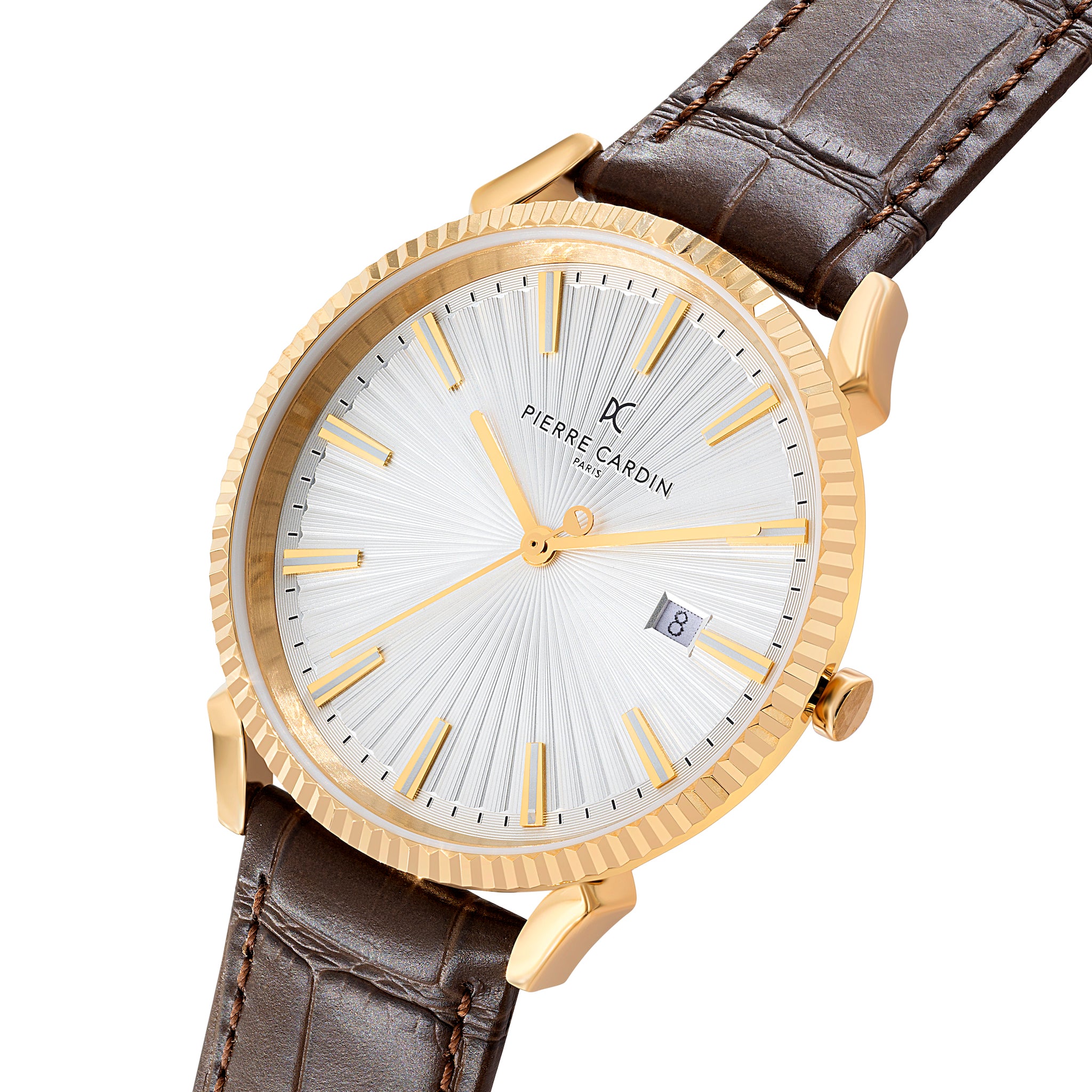 The Pigalle gold watch with brown leather strap is the perfect heritage timepiece for any man, with beautiful aesthetics inspired by the trendy Pigalle district as well as the iconic Pierre Cardin's heritage. This mens timepiece features a cool brown genuine leather strap, a bold polished gold tone case and an eye-catching silver dial with a subtle plissée and matching gold tone watch hands.