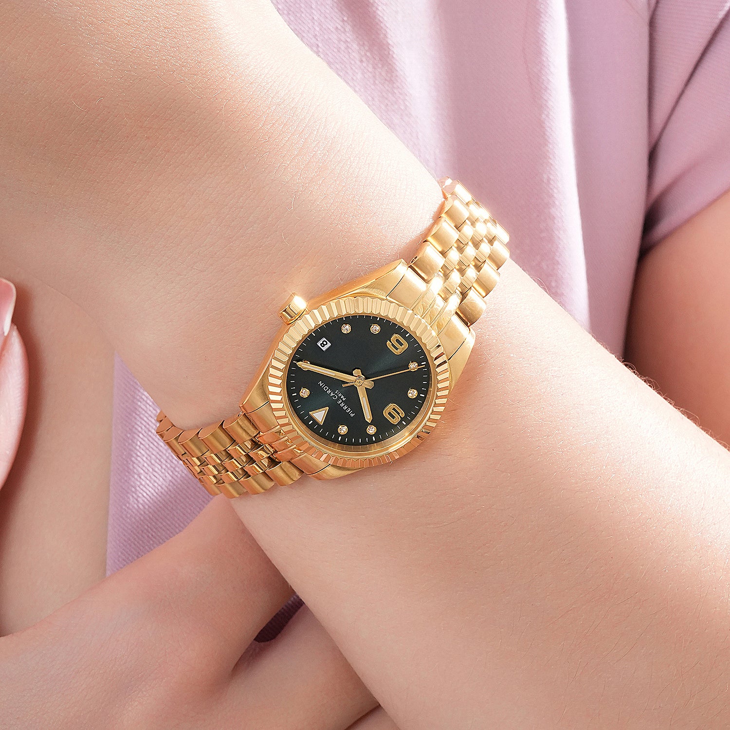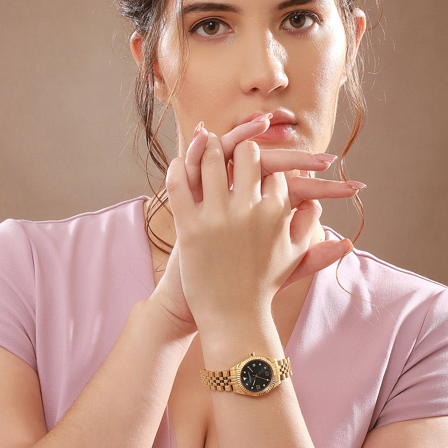 Opéra Timbre Women’s Watch - Gold Case, Dark Green Dial with Crystal Indexes and Gold Jubilee Strap