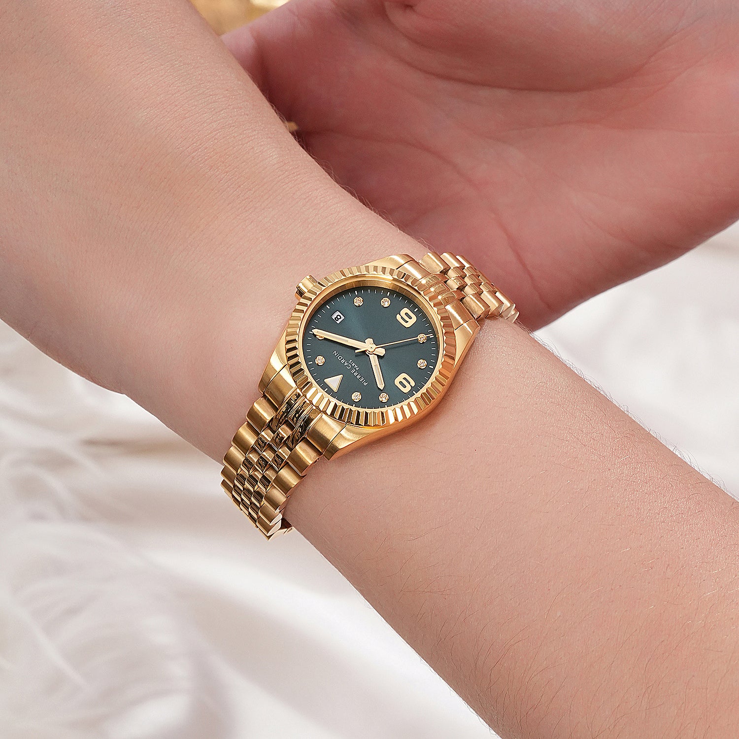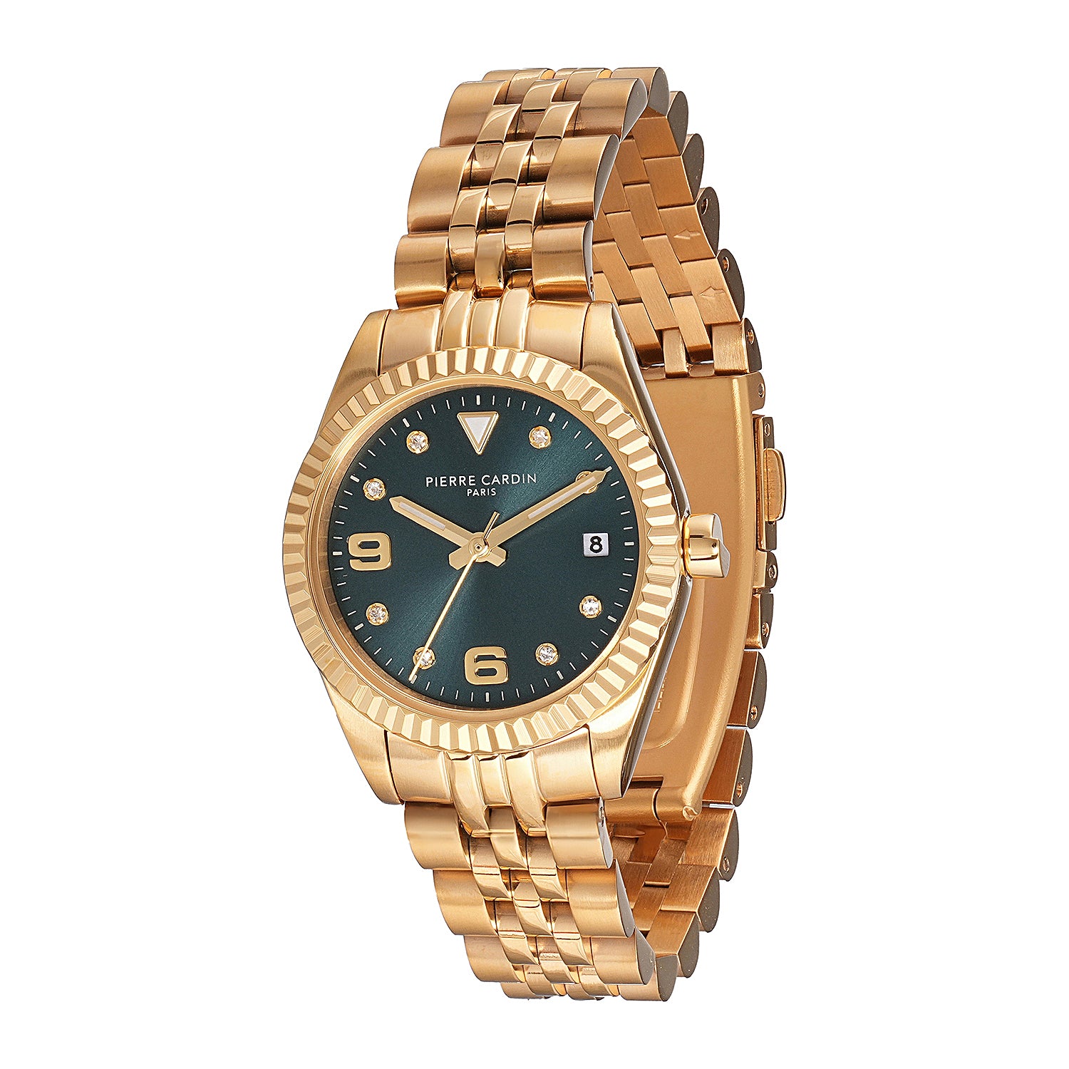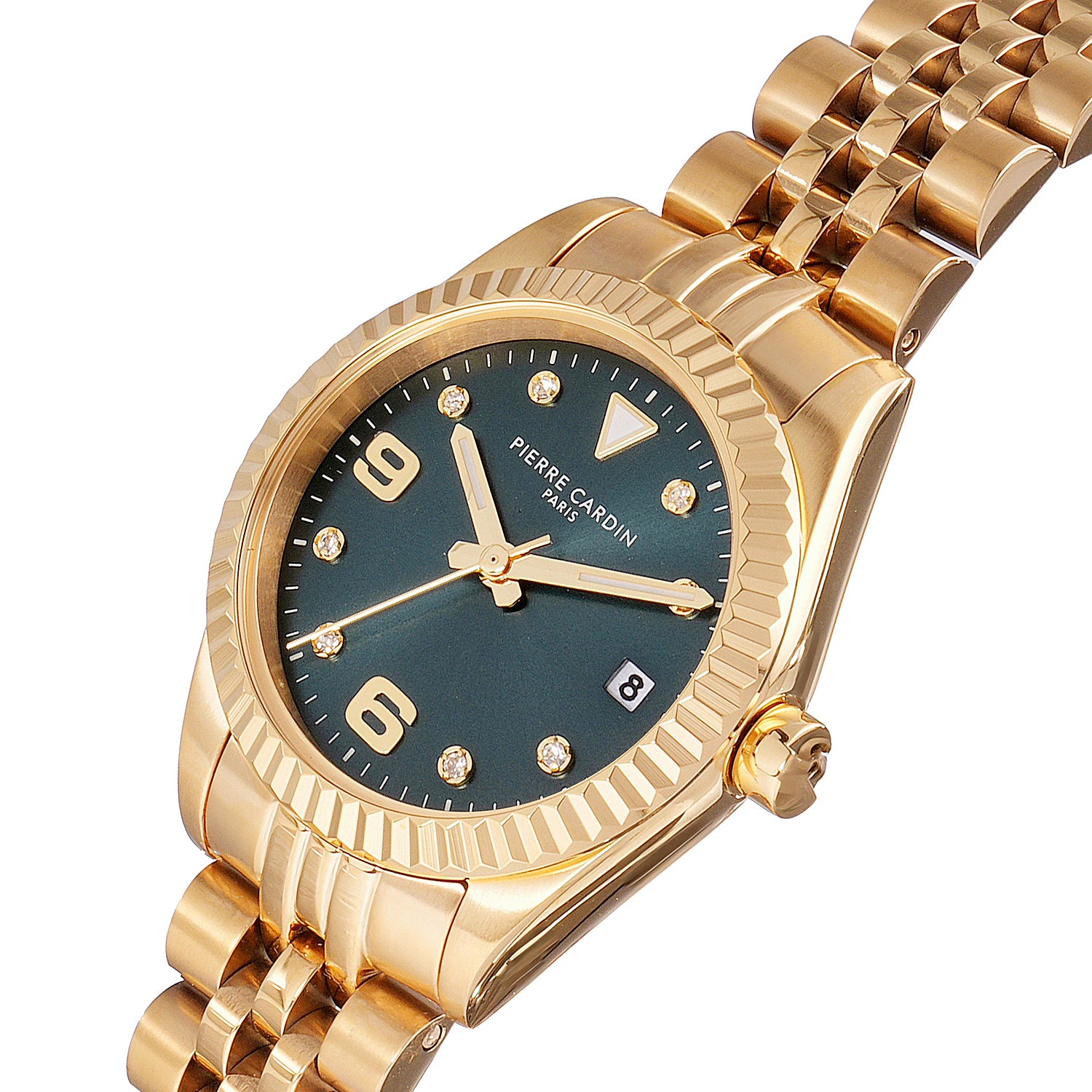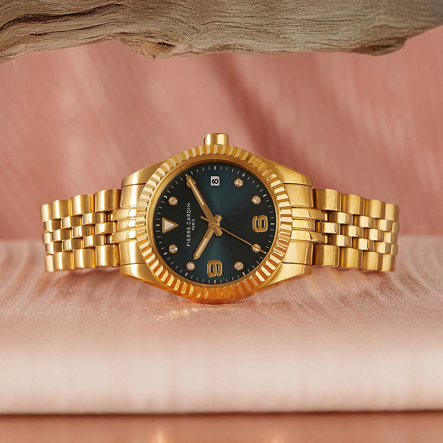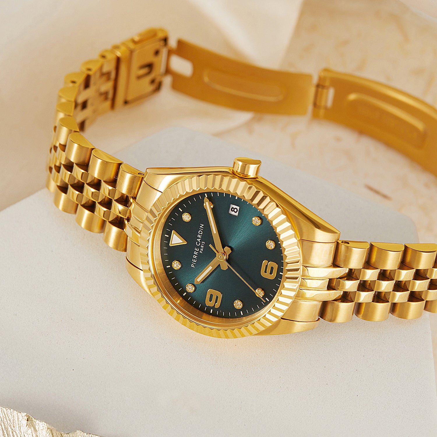 The Opéra Timbre women’s watch by Pierre Cardin exudes luxury and sophistication with its bold design. Featuring a radiant gold case and a striking dark green dial adorned with sparkling crystal indexes and elegant gold hands, this timepiece is a perfect blend of classic and modern style. Paired with a luxurious gold Jubilee strap, it is powered by a precise 3-hand quartz movement and includes a convenient date display. Designed for the modern woman, the Opéra Timbre watch is a stunning accessory that combines Parisian elegance with impeccable craftsmanship.