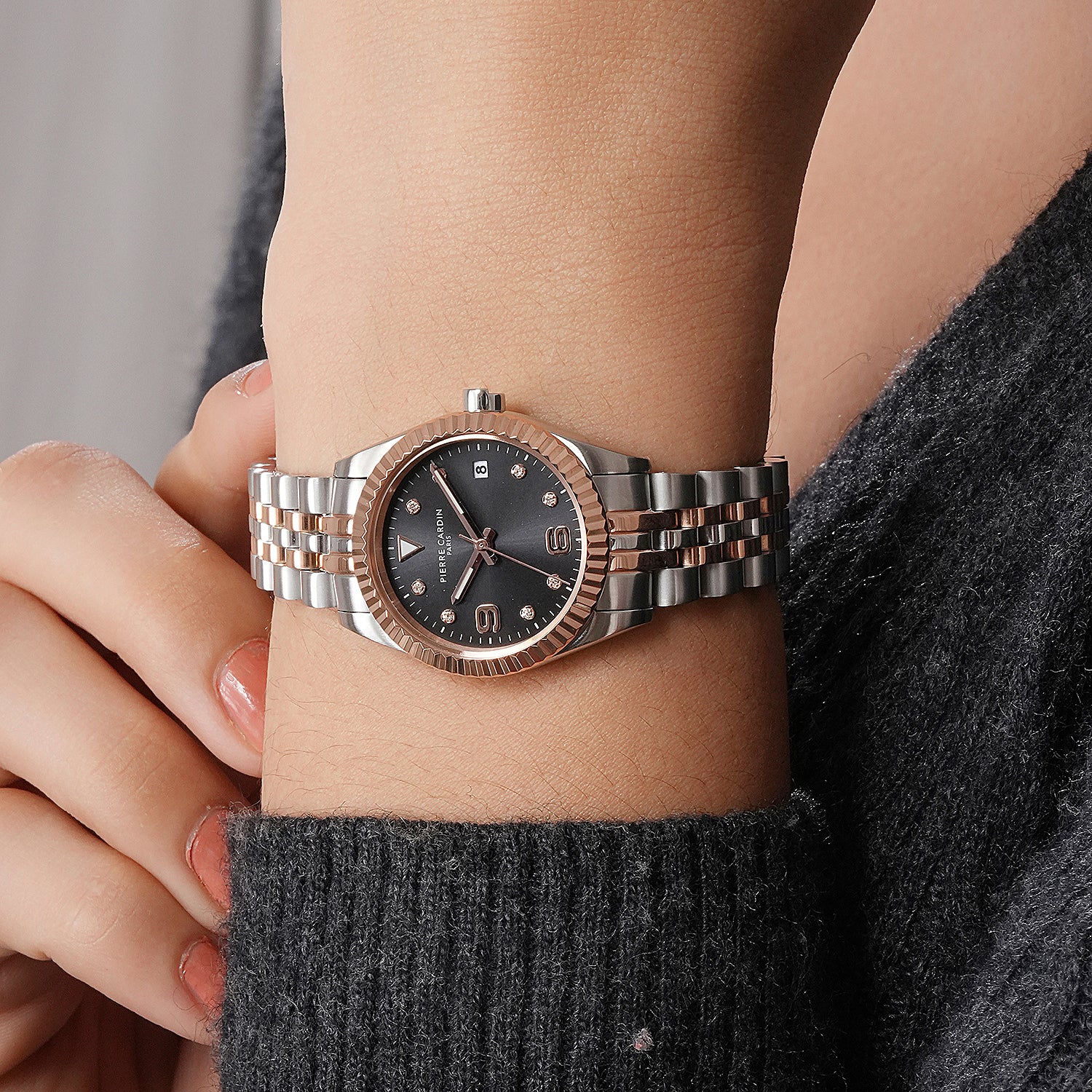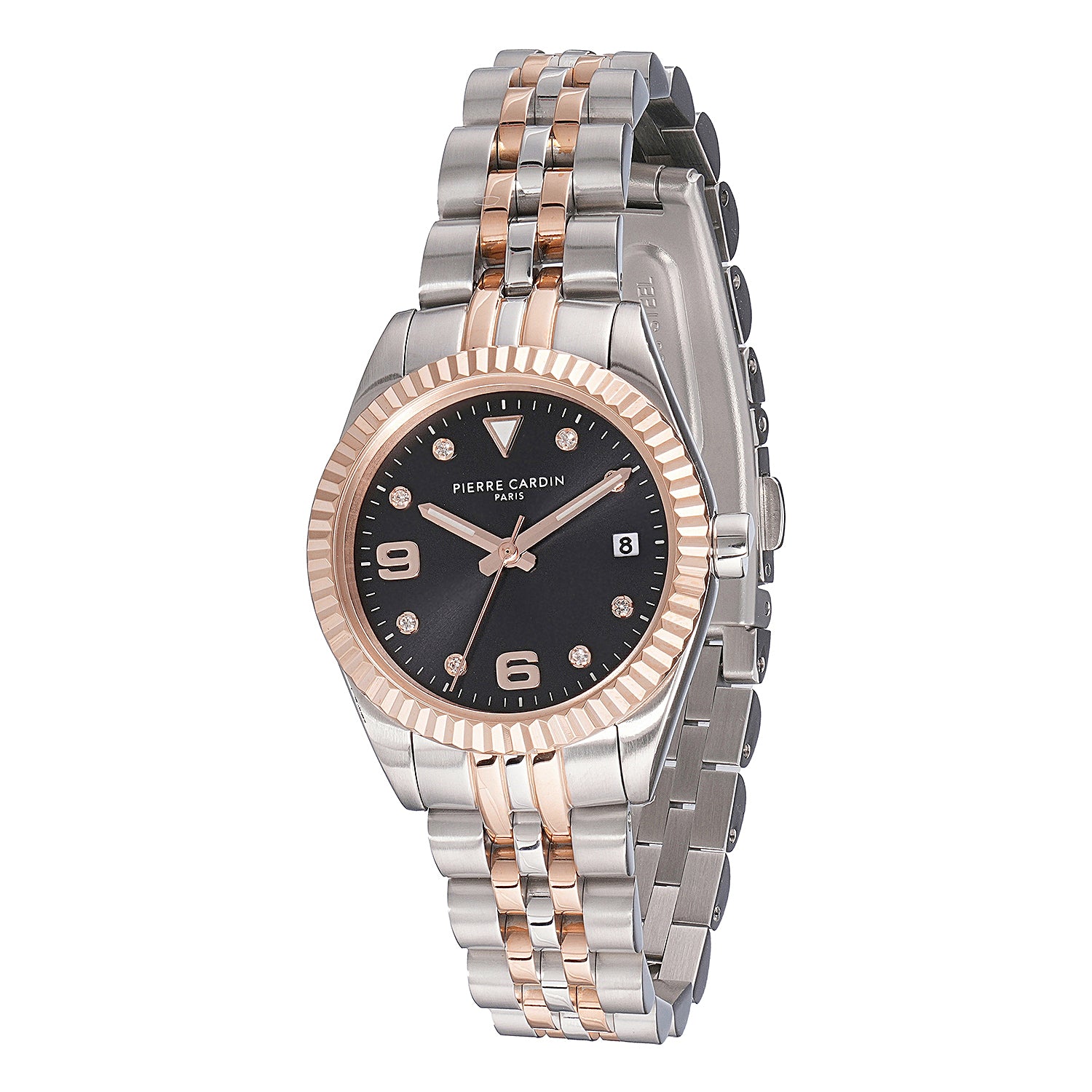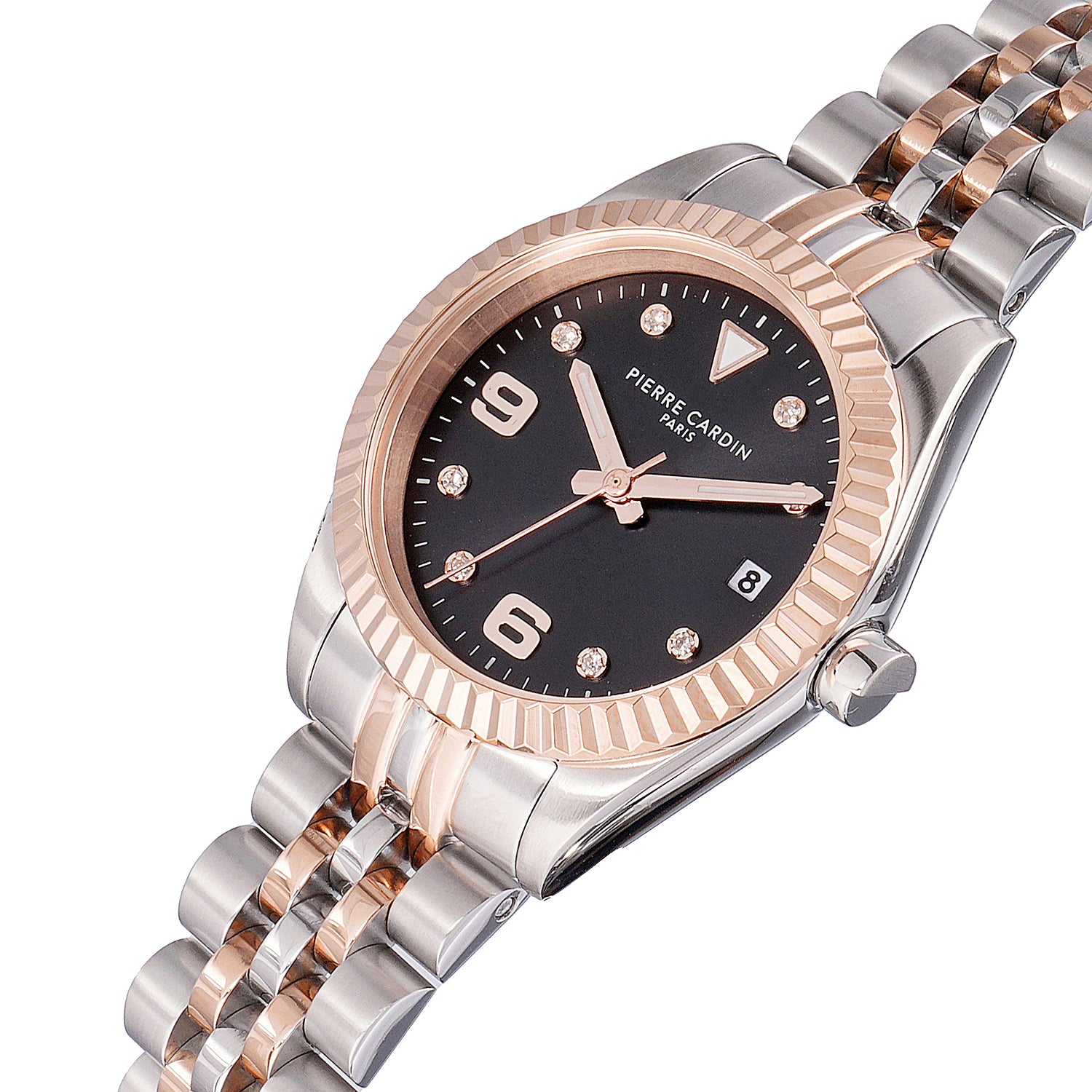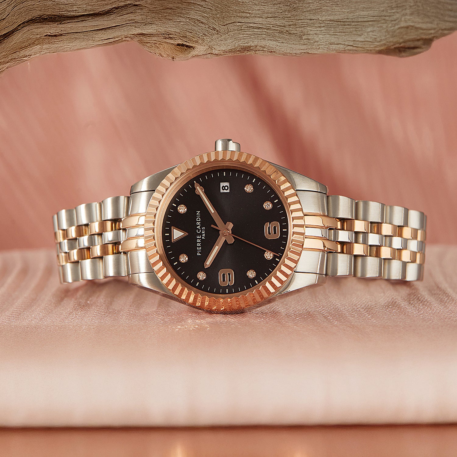 The Opéra Timbre women’s watch by Pierre Cardin exudes elegance with a contemporary edge. Featuring a refined two-tone case in rose gold and silver, this stunning timepiece is enhanced by a striking black dial adorned with sparkling crystal indexes and elegant rose gold hands. Paired with a matching two-tone Jubilee strap, it is powered by a precise 3-hand quartz movement and includes a convenient date display. Perfect for the modern woman, the Opéra Timbre watch blends timeless sophistication with Parisian craftsmanship, making it a versatile and stylish addition to any collection.