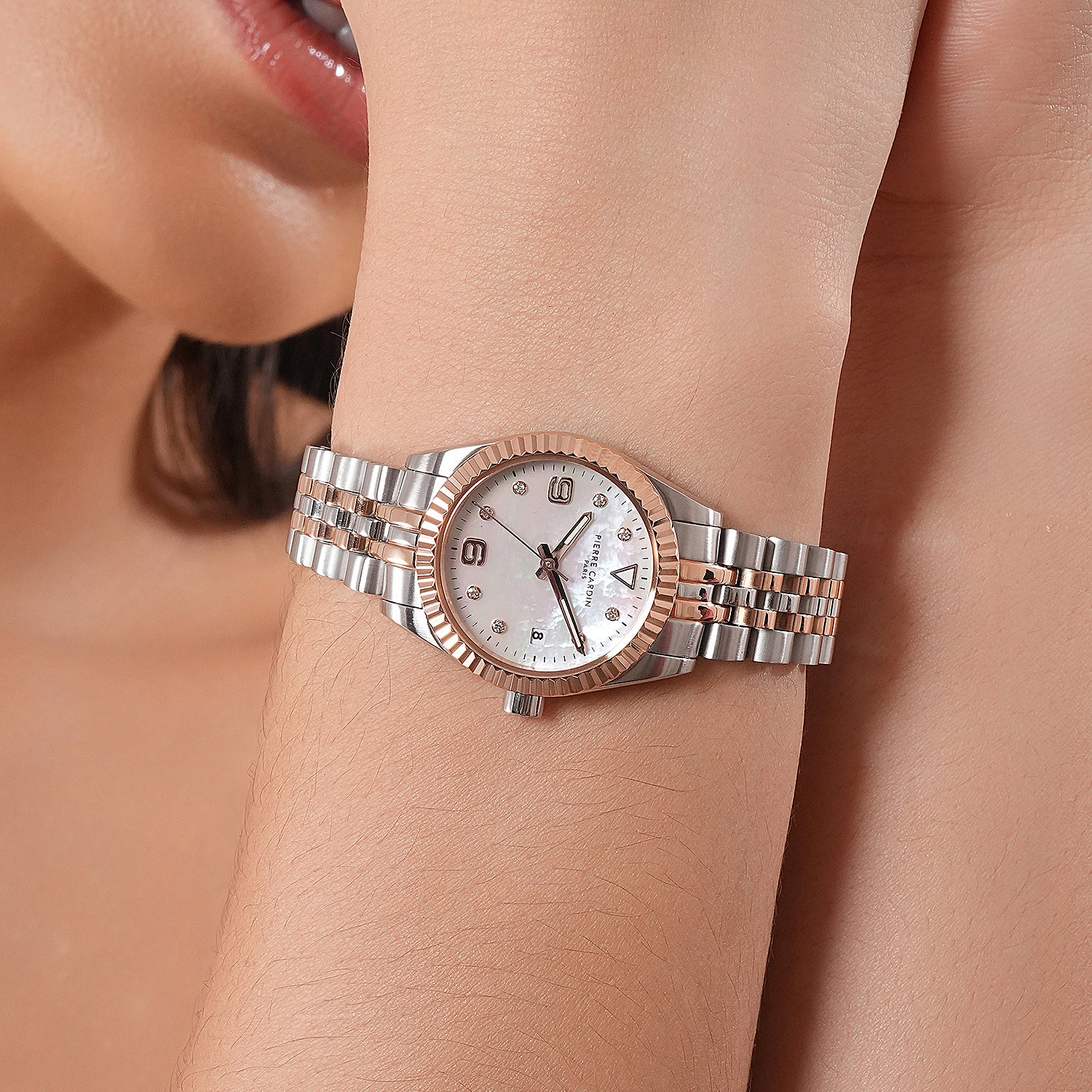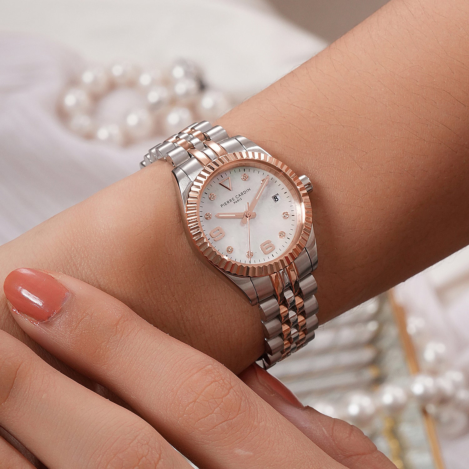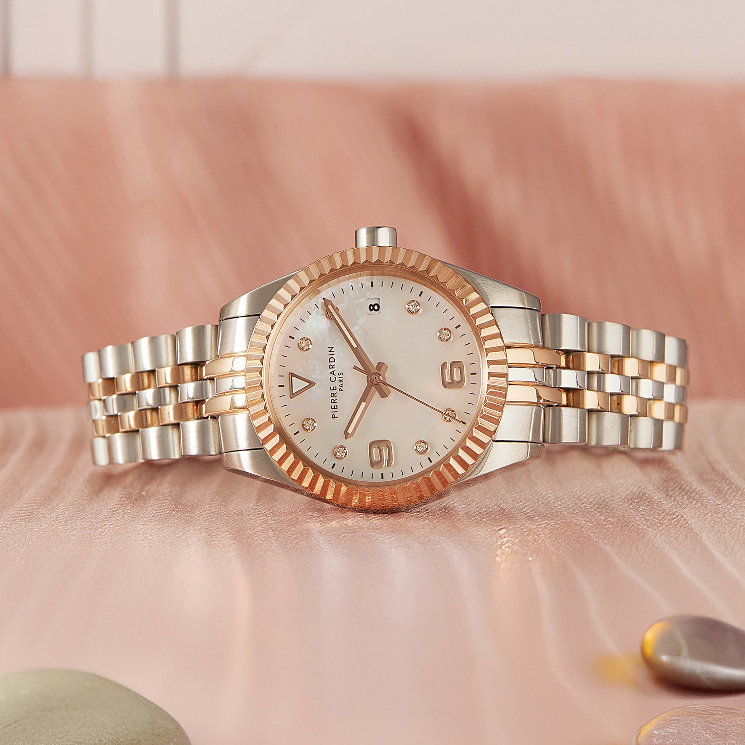 The Opéra Timbre women’s watch by Pierre Cardin combines timeless elegance with luxurious details. Featuring a sophisticated two-tone case in rose gold and silver, this stunning timepiece is adorned with a luminous white mother of pearl dial accented by sparkling crystal indexes and elegant rose gold hands. Paired with a matching two-tone Jubilee strap, it is powered by a precise 3-hand quartz movement and includes a convenient date display. Perfect for the modern woman, the Opéra Timbre watch is a versatile accessory that exudes Parisian charm and refined craftsmanship.