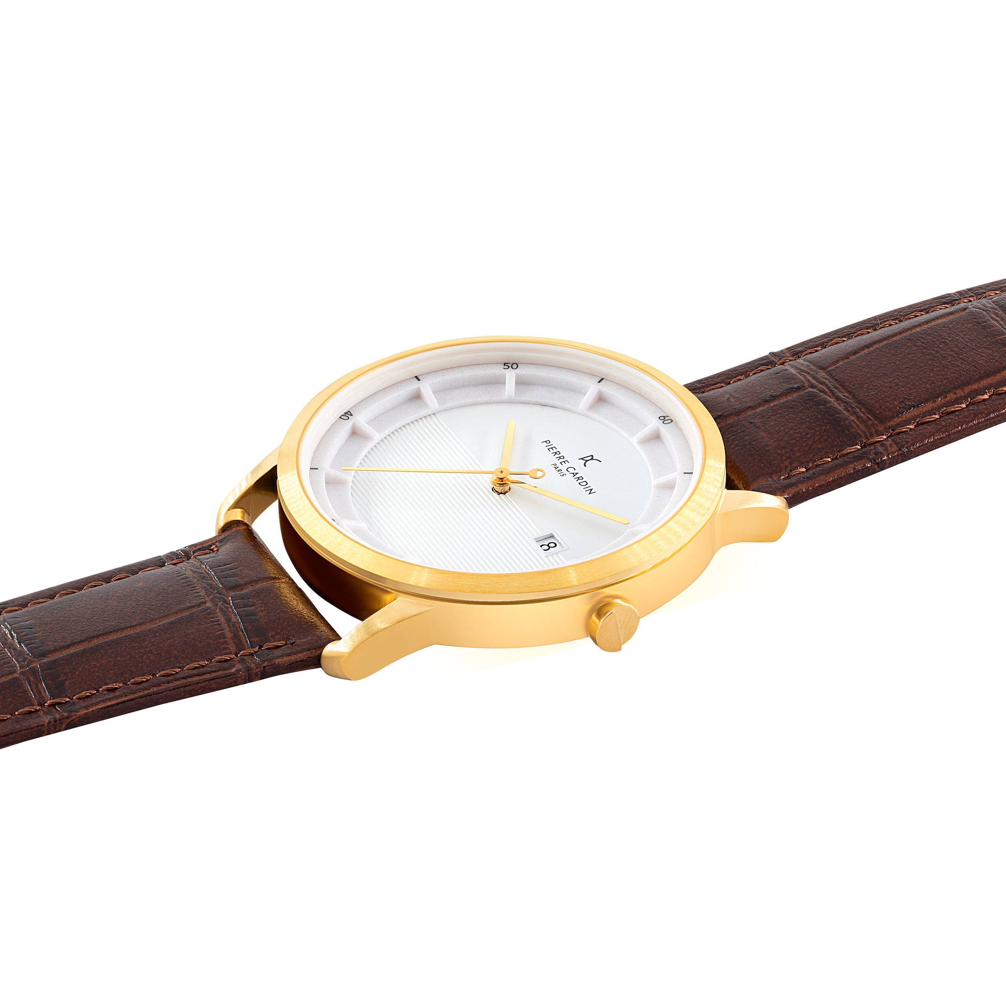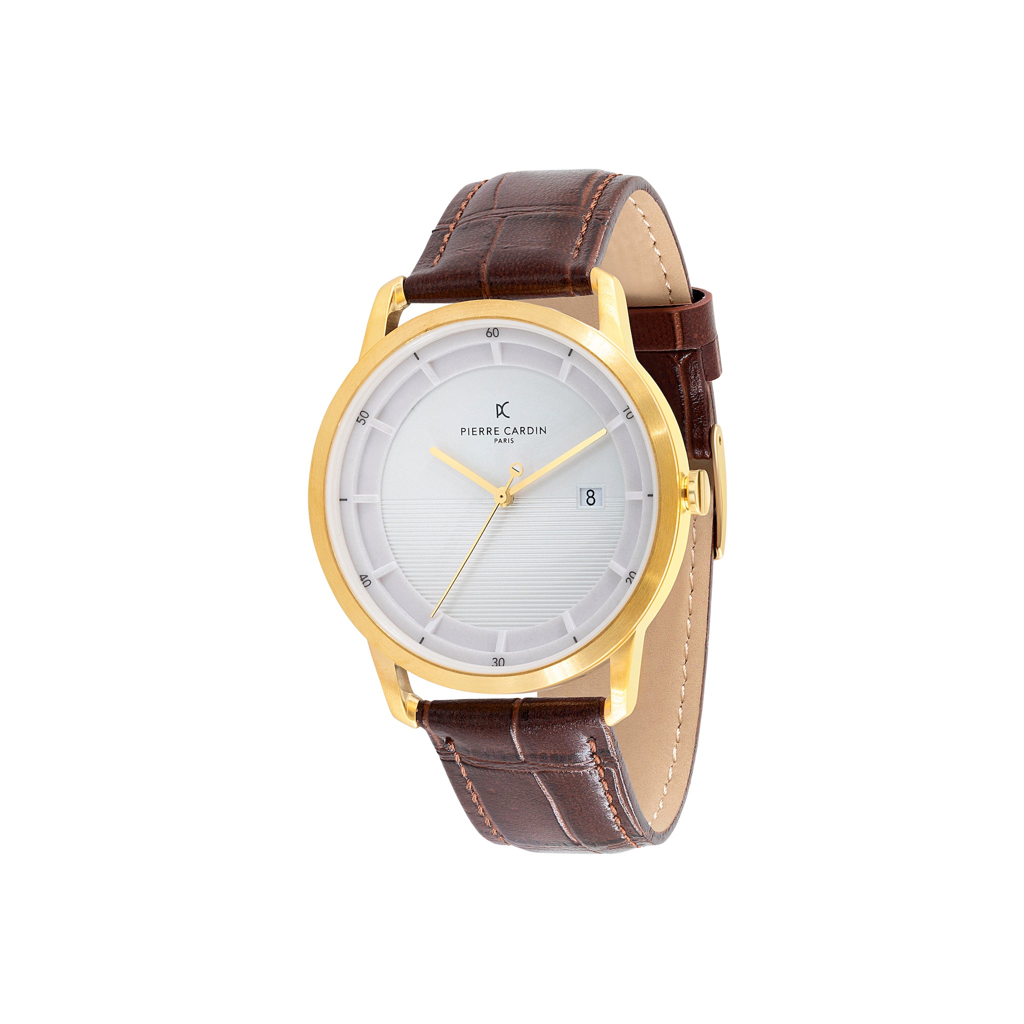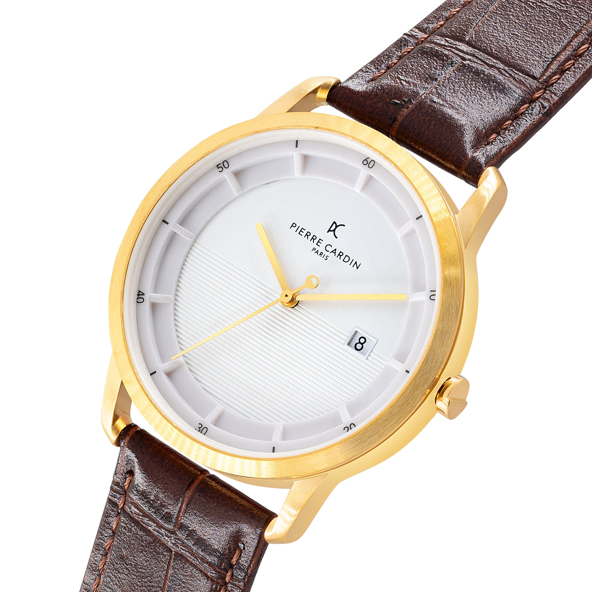 Pierre Cardin Mens watch inspired by the Parisian region of St. Germain, this watch features a gold tone stainless steel case, white dial with lines pattern, and a brown leather strap with a crocodile pattern. The three-hand movement includes a date display at the 3 o'clock position, and the watch is powered by a reliable quartz movement. The brown leather strap is made from genuine leather, adding a touch of luxury to the overall design. This watch is suitable for both casual and formal occasions, and would make a great addition to any wardrobe.