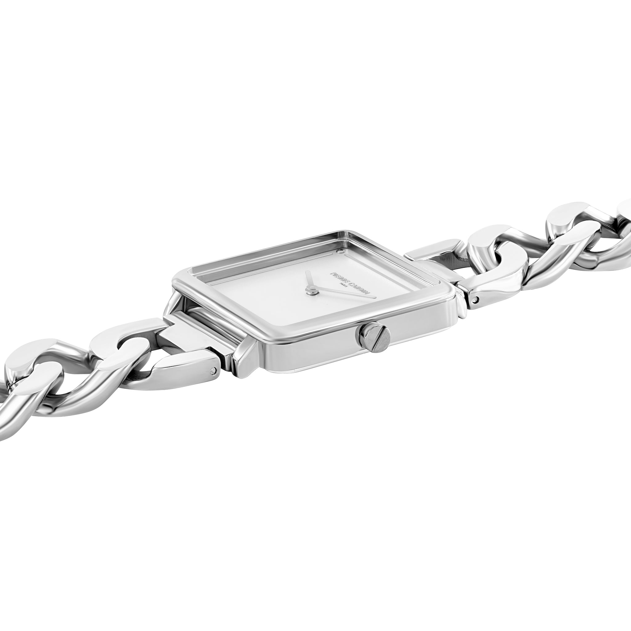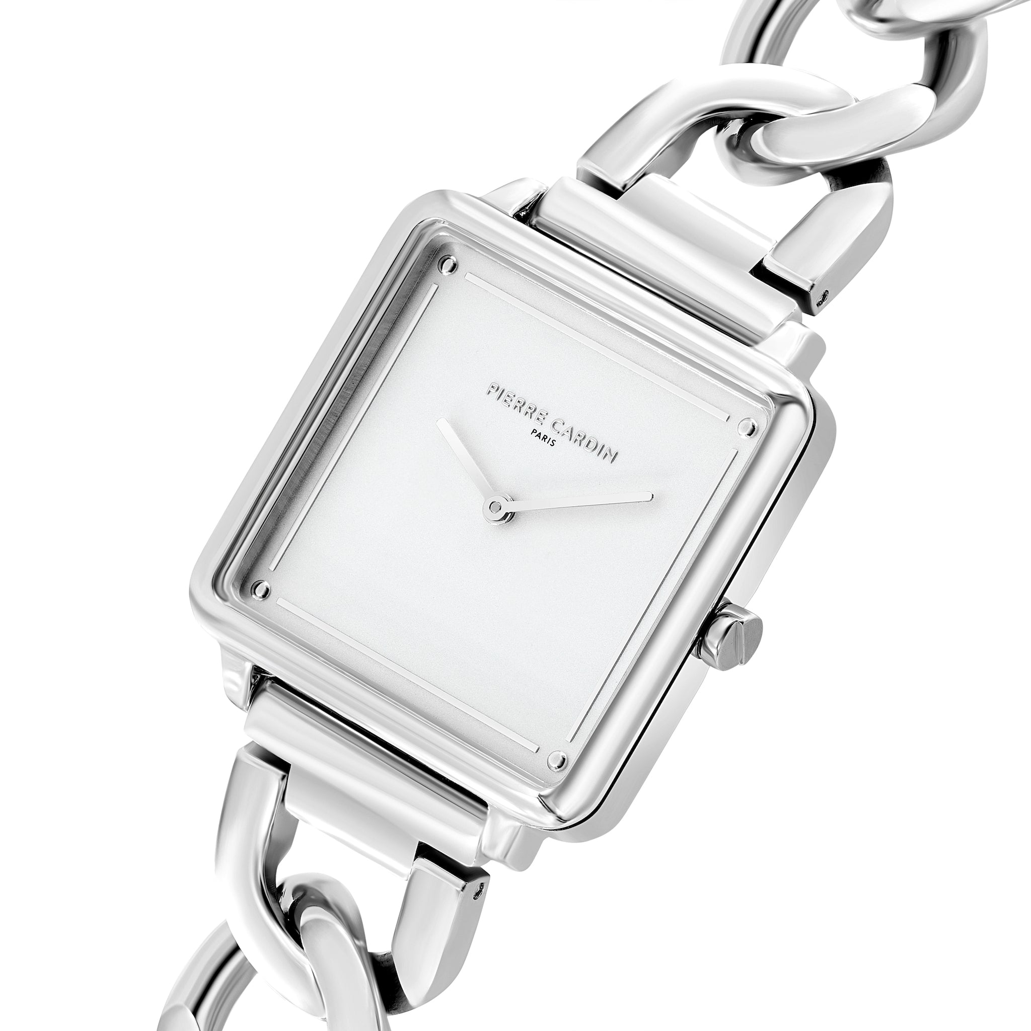 The Vendôme silver watch with bracelet style chain metal strap is a sleek and stylish timepiece. The square case and minimalist design give it a modern and sophisticated look, making it a great choice for both casual and formal occasions. The square shape of the case is unique and adds an interesting twist to the classic round watch shape.