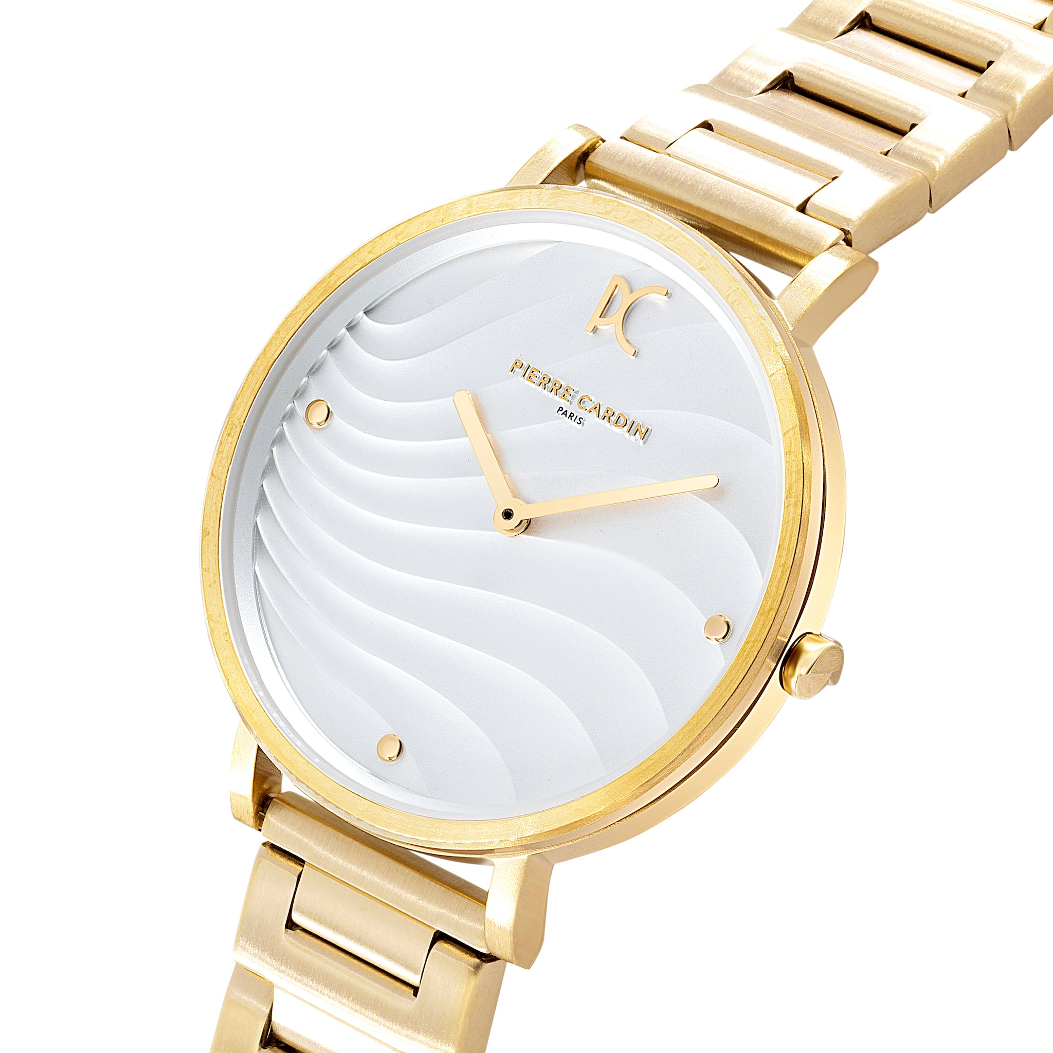 The Belleville patterned dial watch is a contemporary tribute to Pierre Cardin's iconic design and unique style. This women’s watch features a gold polished metal links strap, a striking polished gold tone case and a patterned dial with coordinating gold tone watch hands for a truly timeless French style appearance.