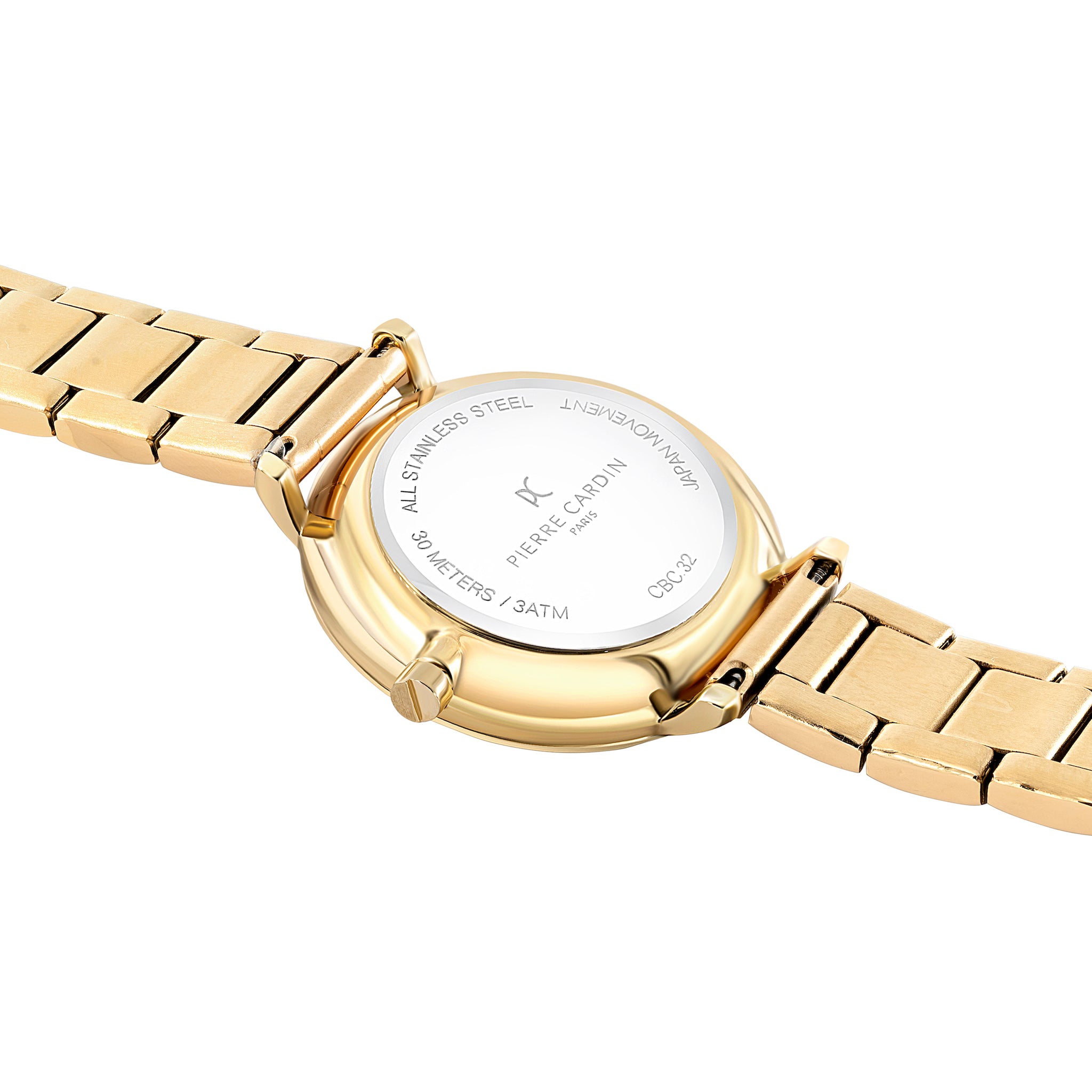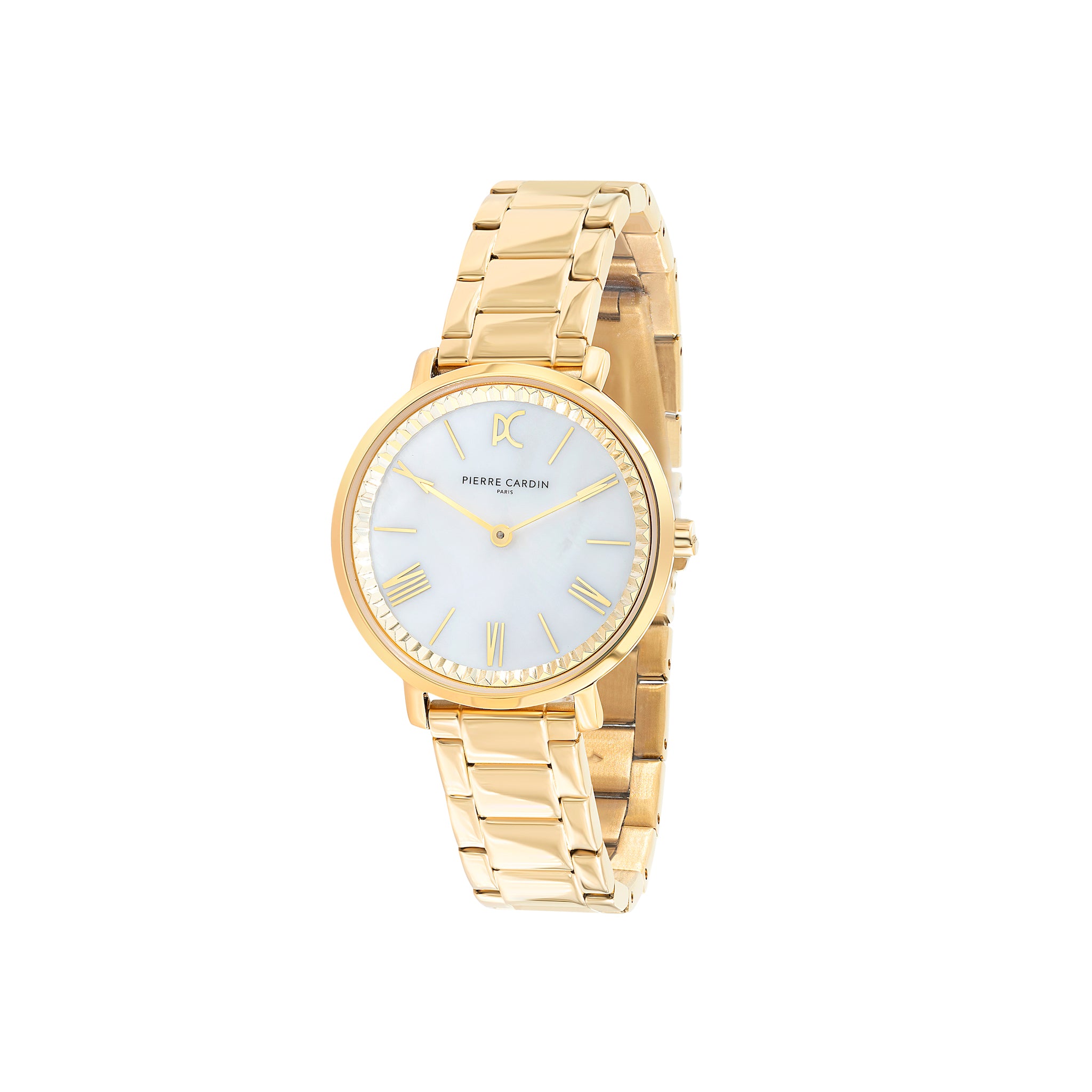 The Brochant mother of pearl gold watch with gold metal link strap is a stylish and elegant timepiece. The watch features a modern design with a bold medium-sized dial and a fluidic design silver case. The gold metal link strap adds an luxury and elegant touch, making it suitable for both casual and formal occasions.