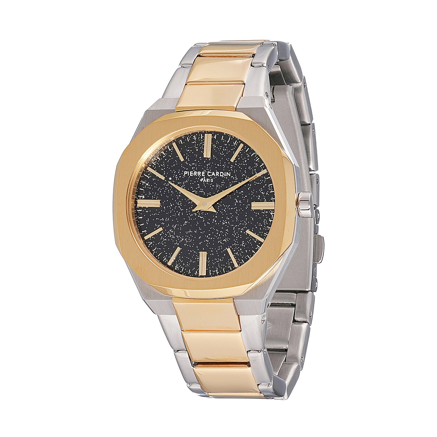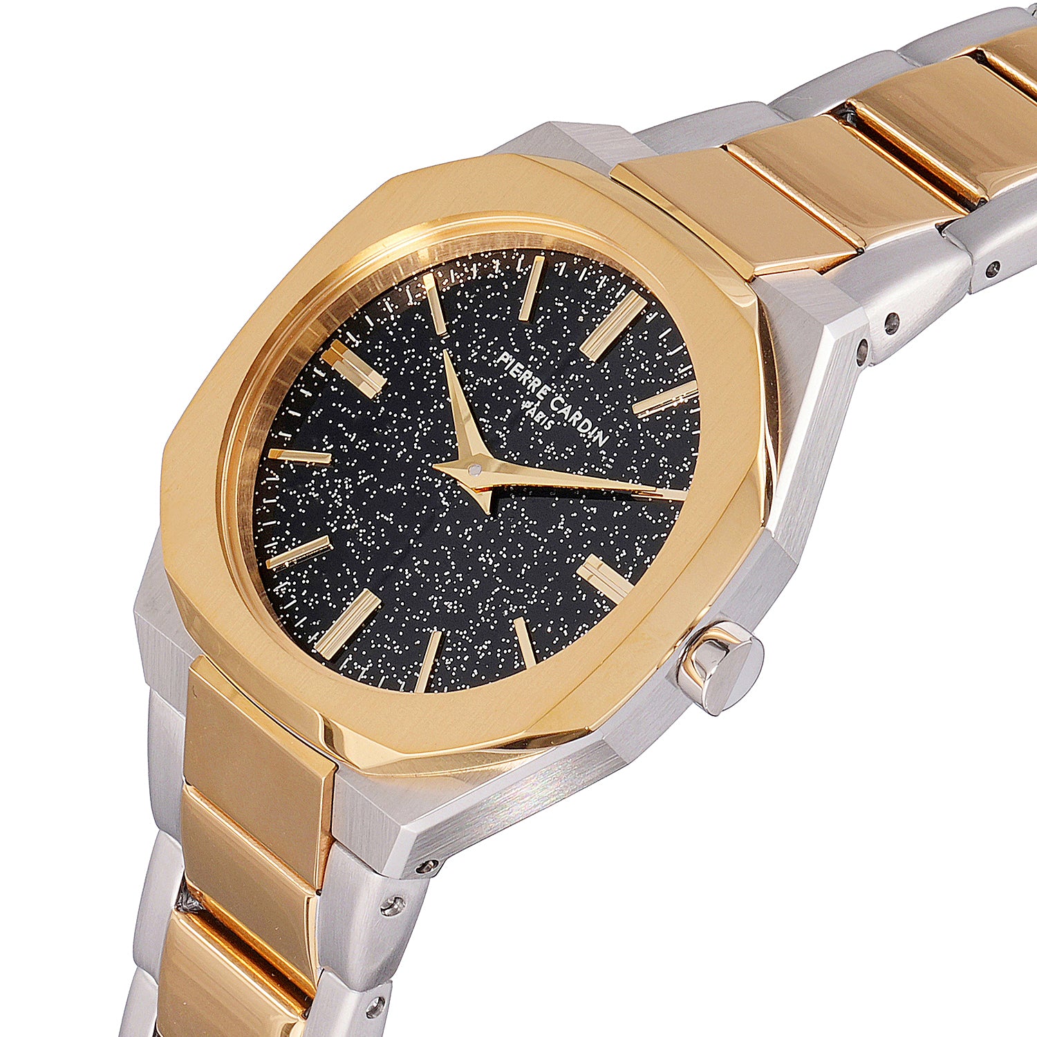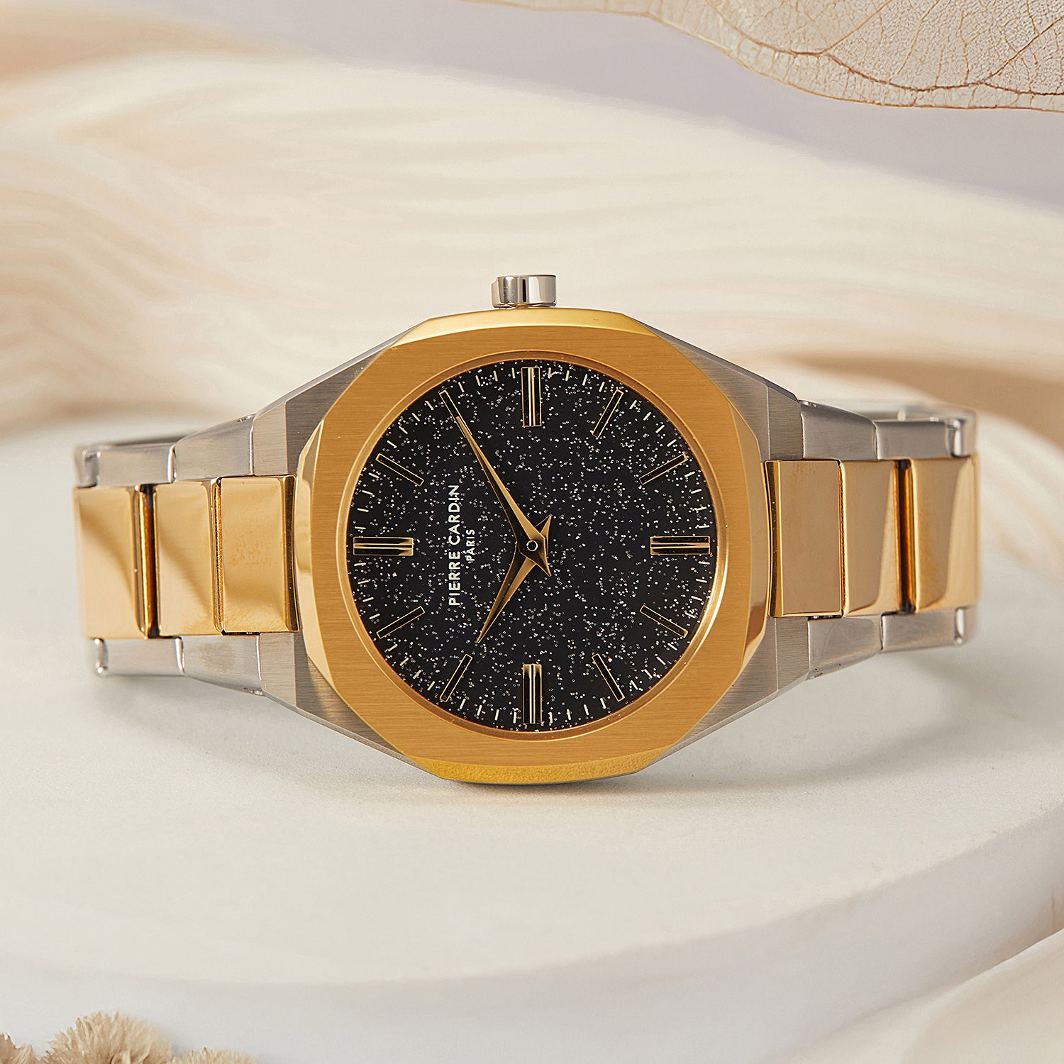 The Élysée Chrysanthème collection by Pierre Cardin exudes sophistication with a touch of sparkle, crafted for the elegant woman. This 32mm timepiece features a refined two-tone case and band in gold and silver, beautifully complemented by a black dial adorned with delicate sparkles that catch the light. With its simple two-hand movement, the Élysée Chrysanthème watch combines timeless style with understated glamour, perfect for any occasion. Embrace the essence of Parisian elegance with this luxurious piece, crafted to elevate your everyday look.