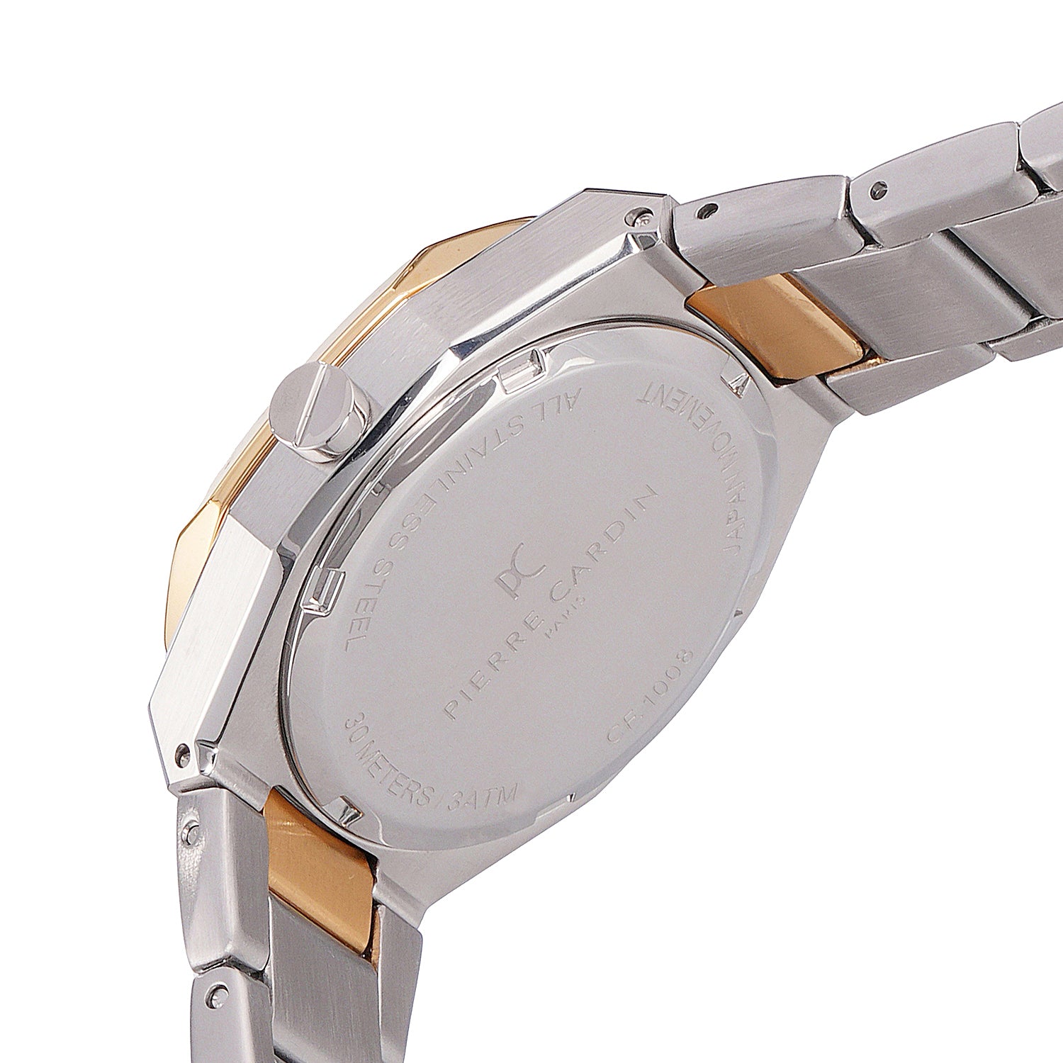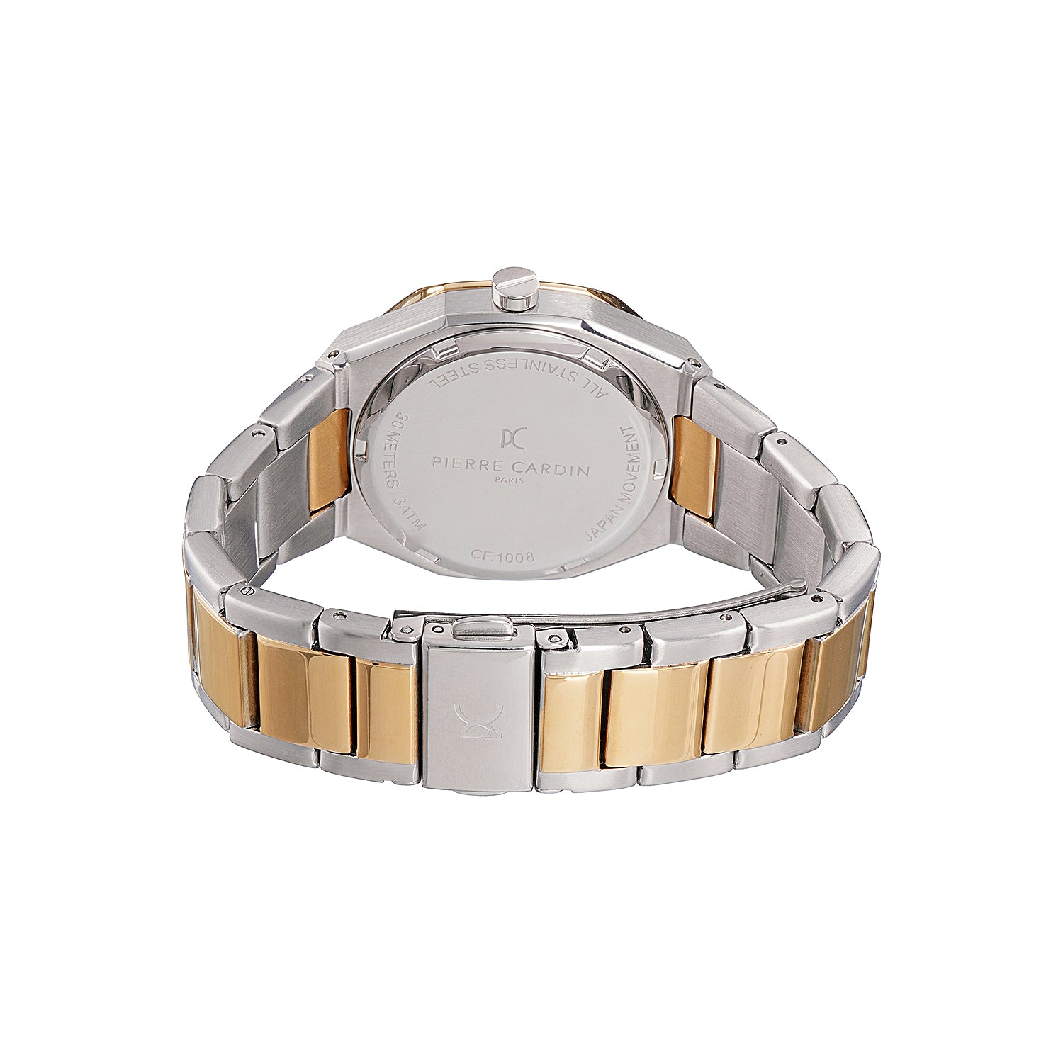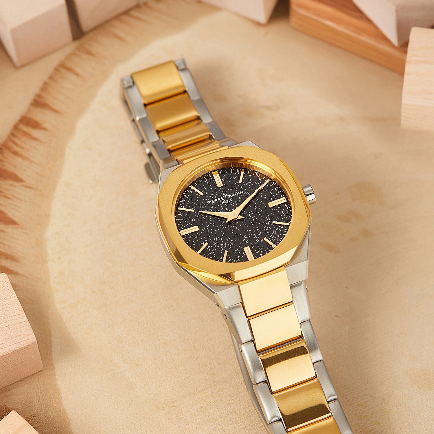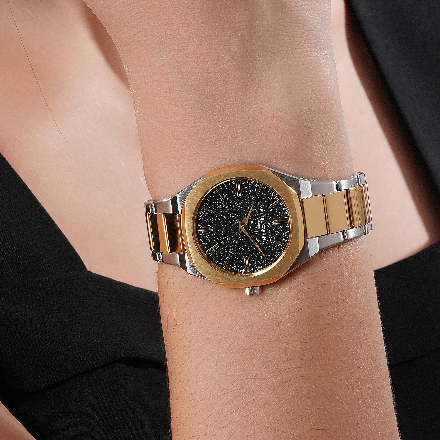 The Élysée Chrysanthème collection by Pierre Cardin exudes sophistication with a touch of sparkle, crafted for the elegant woman. This 32mm timepiece features a refined two-tone case and band in gold and silver, beautifully complemented by a black dial adorned with delicate sparkles that catch the light. With its simple two-hand movement, the Élysée Chrysanthème watch combines timeless style with understated glamour, perfect for any occasion. Embrace the essence of Parisian elegance with this luxurious piece, crafted to elevate your everyday look.