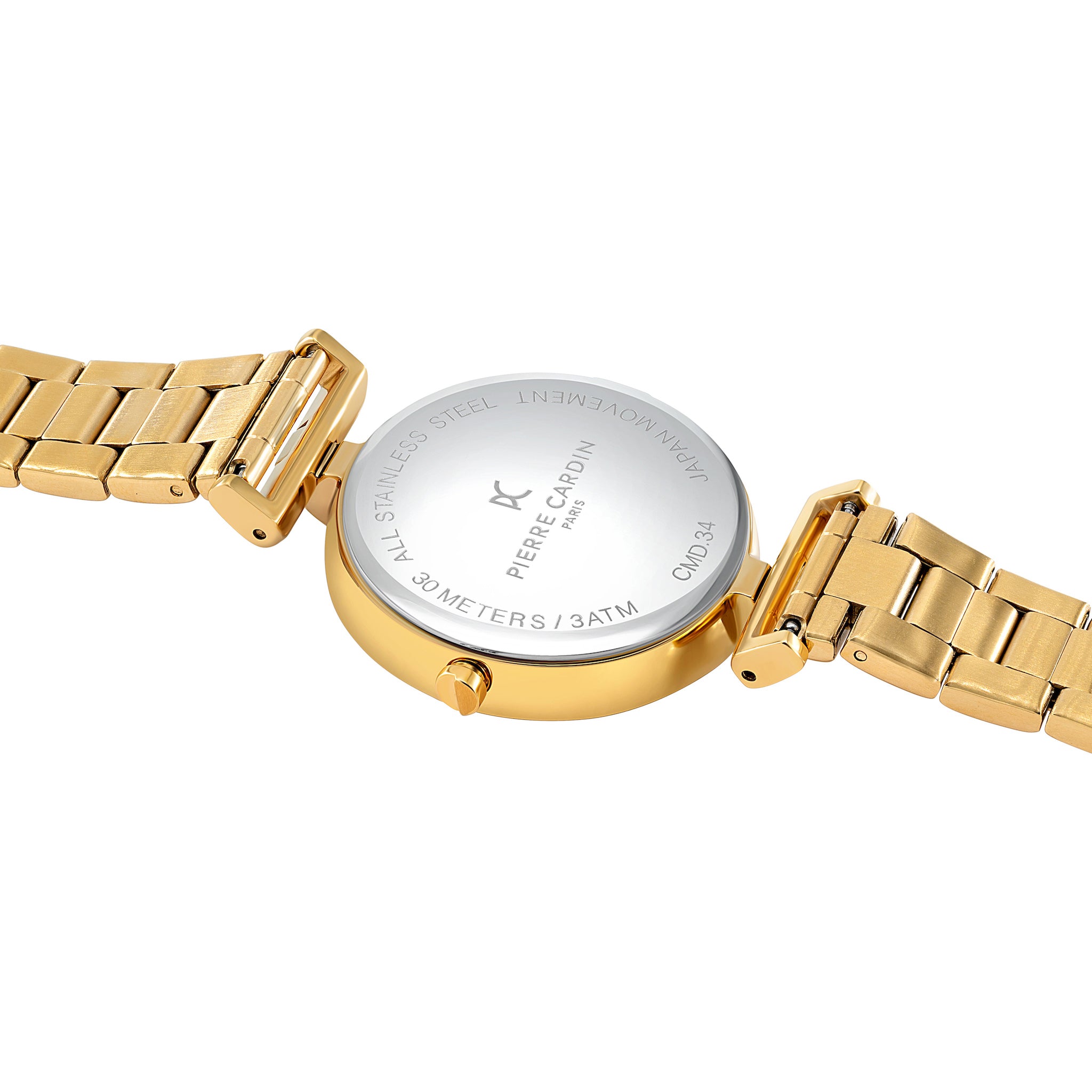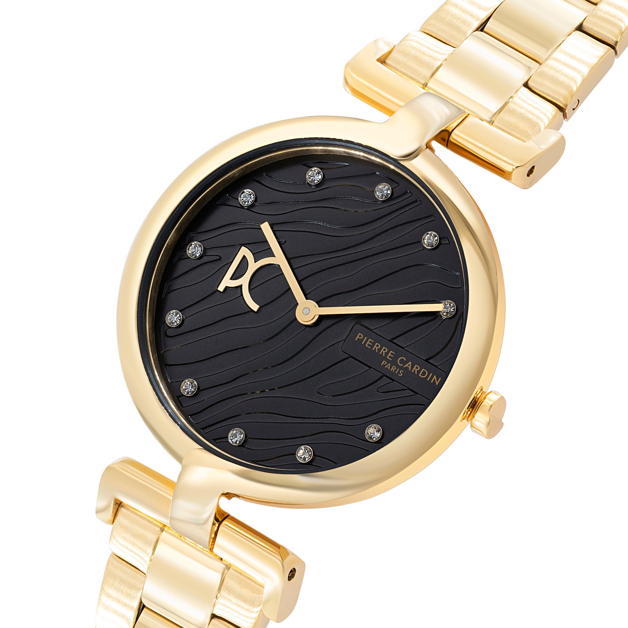 Flawless and radiant the Madeleine patterned black dial gold metal link strap watch delivers an unforgettable impact with its wonderful modern design. The elegant metal strap combined with a bold medium-sized dial and subtle fluidic design of the gold case renders this watch unforgettable. Featuring patterned black dial finished with minimalist watch indices and hands, ensure effortlessly graceful monochrome look.