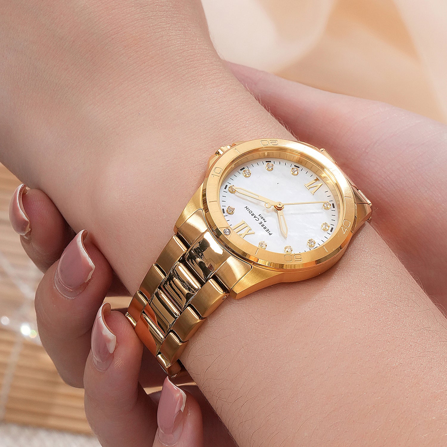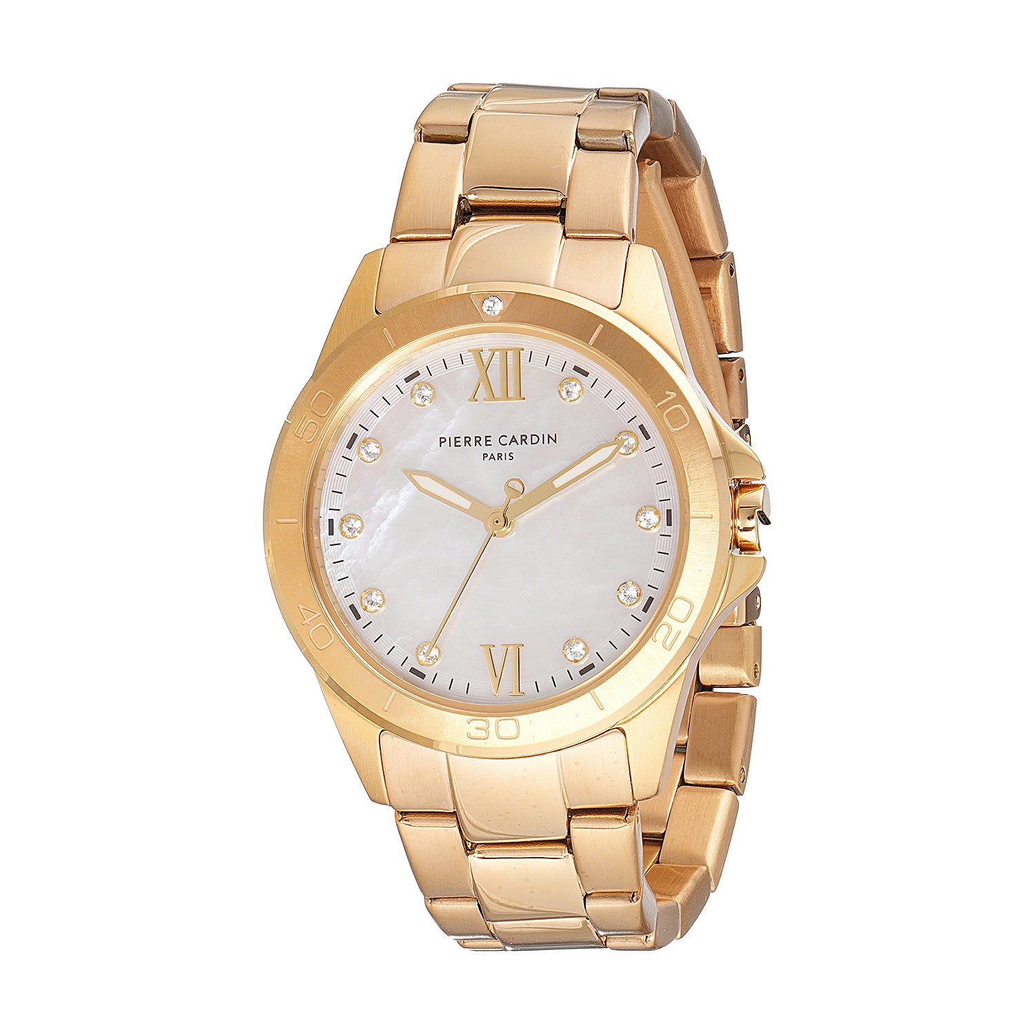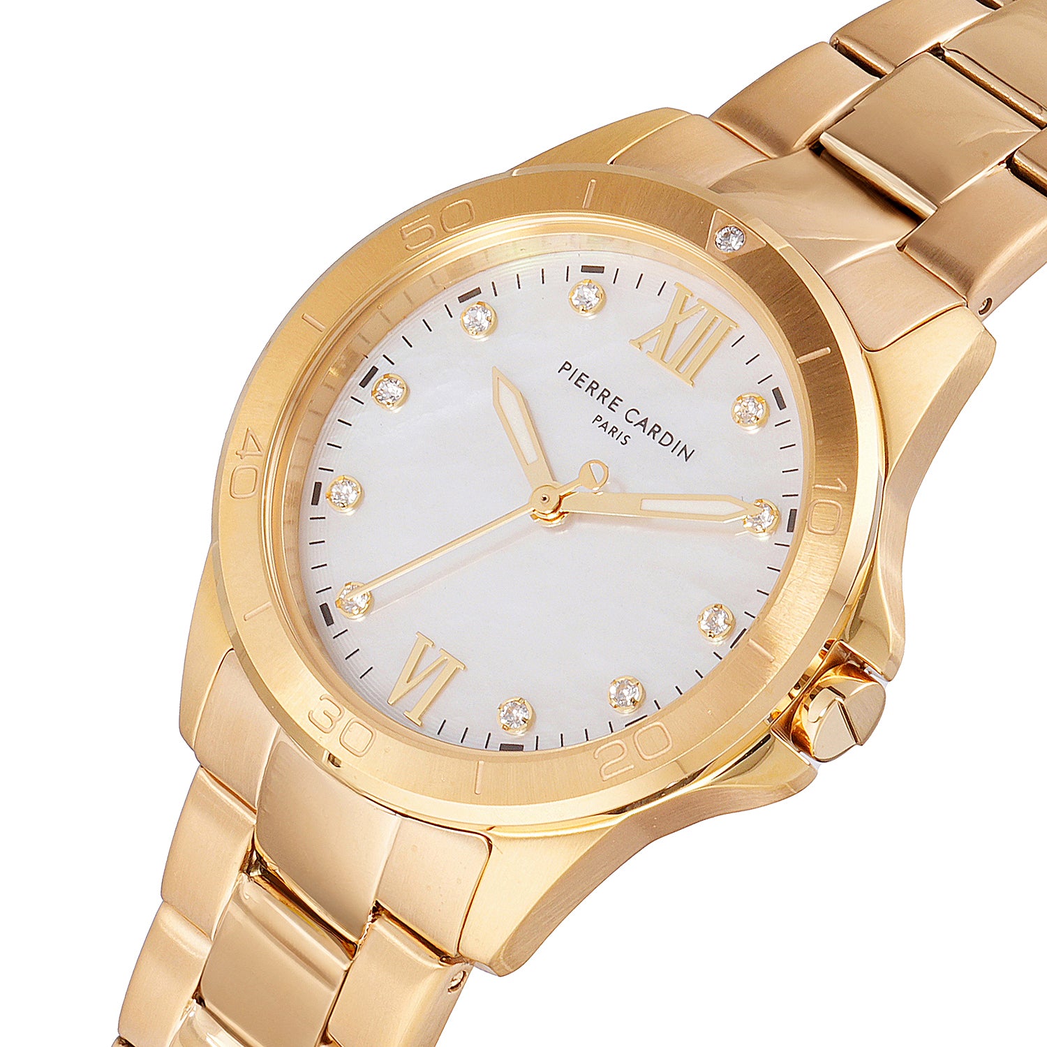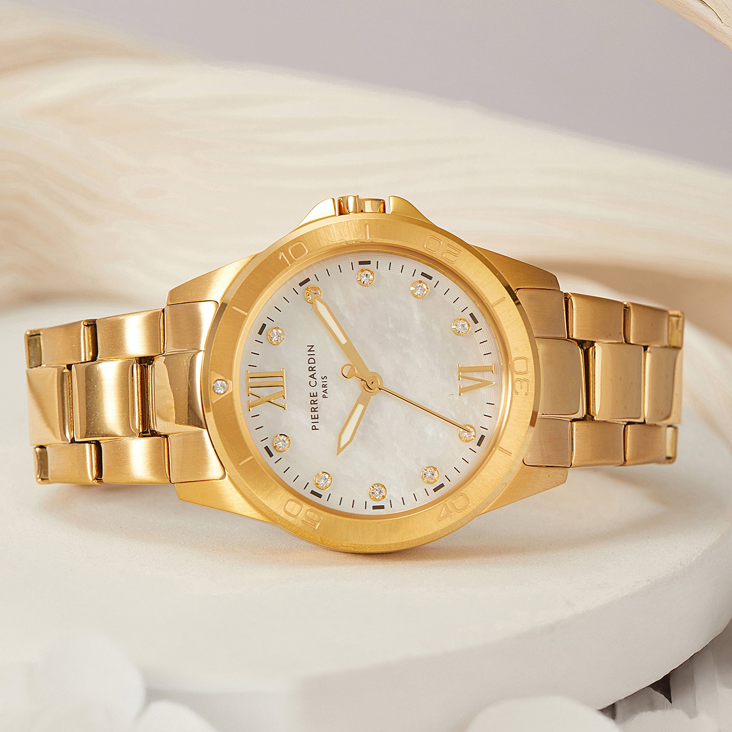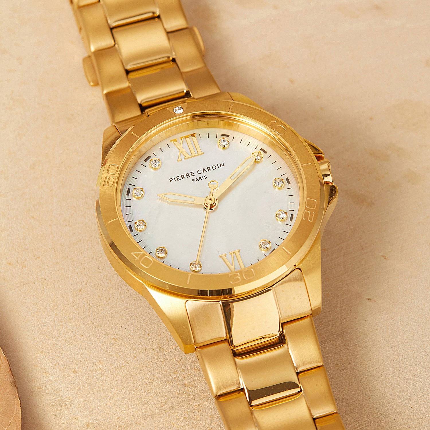 The Observatoire Éclat collection by Pierre Cardin exudes luxury and sophistication with its sporty yet elegant design. This stunning timepiece features a radiant gold case and a luminous white mother of pearl dial, beautifully accented with sparkling crystals as indexes. Designed for the modern woman, the Observatoire Éclat watch is a versatile accessory, perfect for both casual outings and formal occasions. With its timeless design and exquisite craftsmanship, this watch reflects the Parisian elegance synonymous with Pierre Cardin.