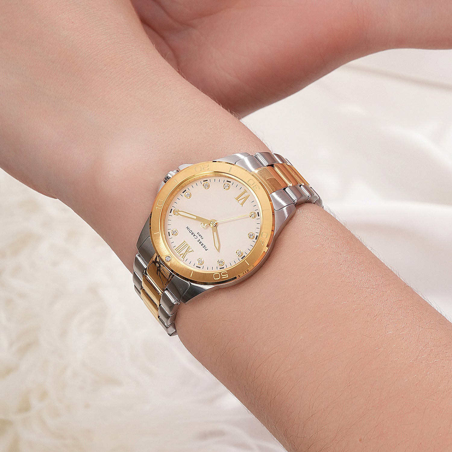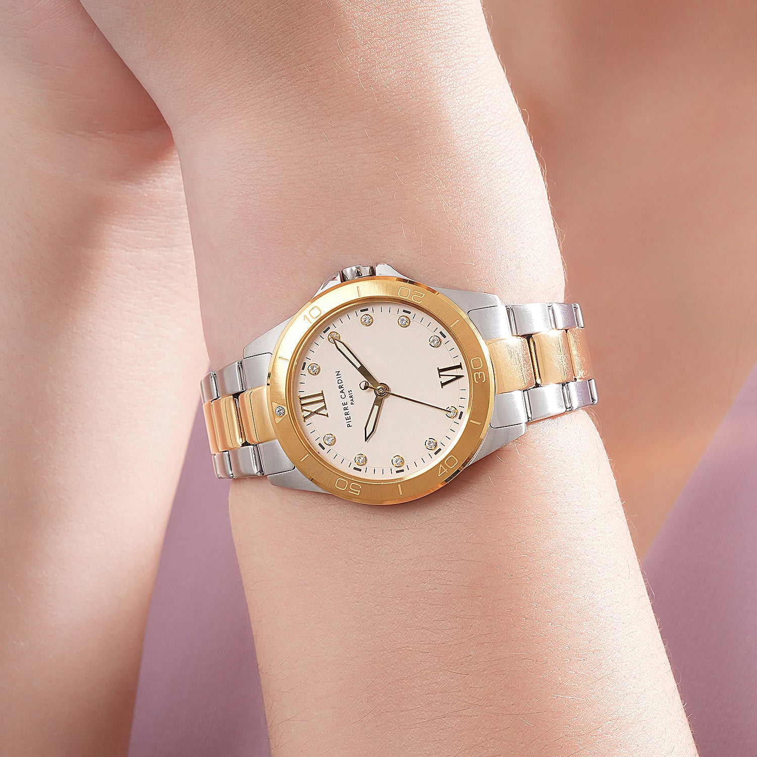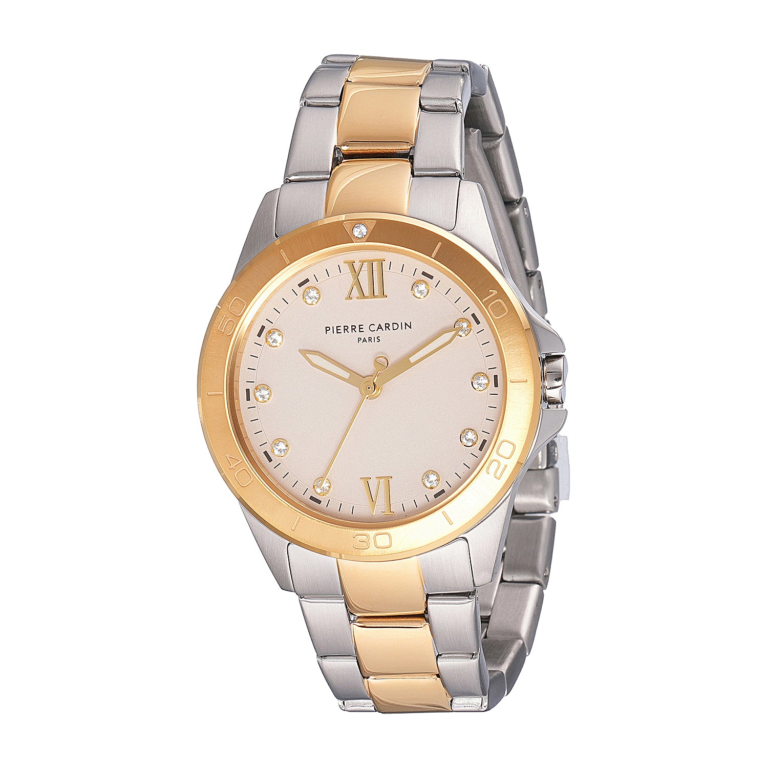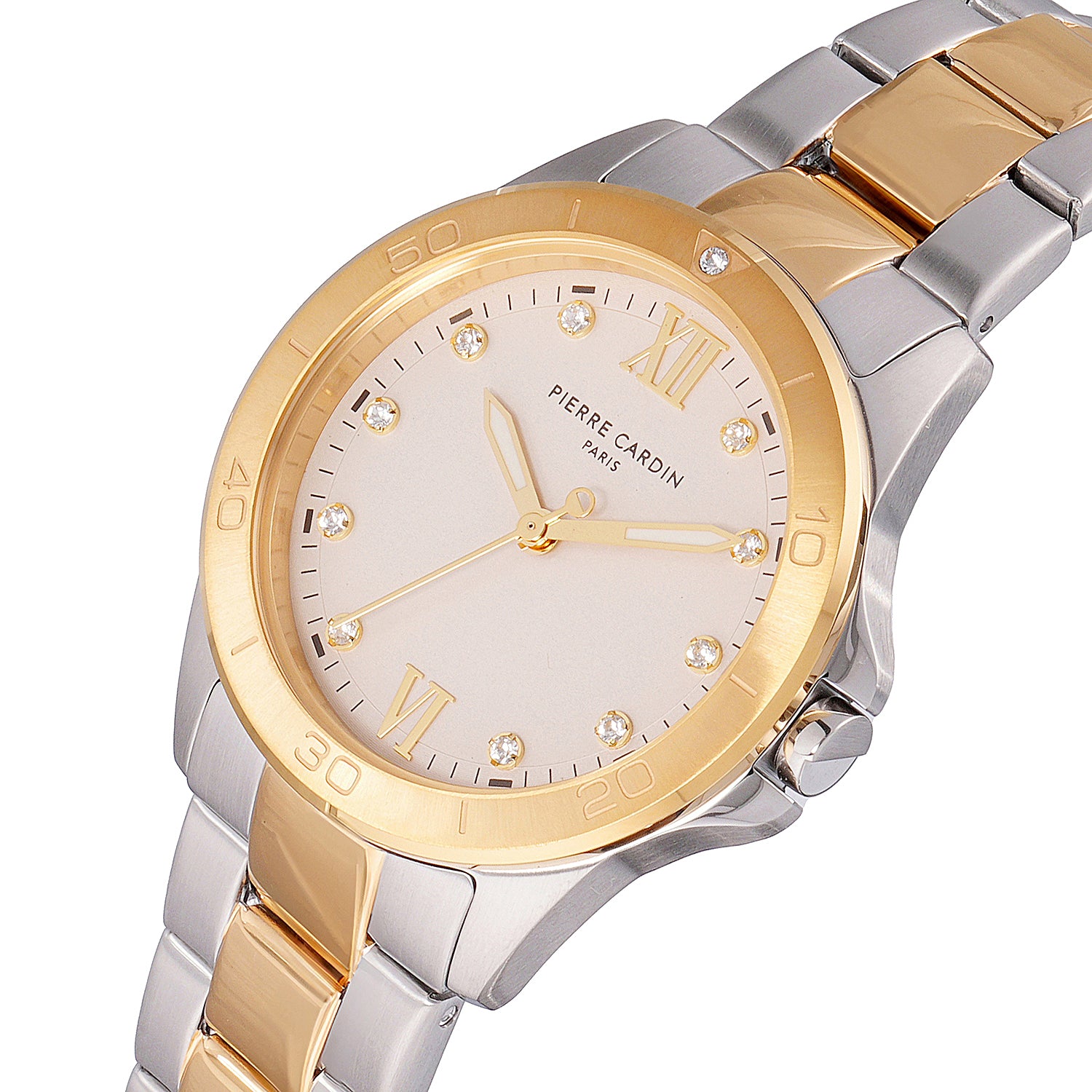 The Observatoire Éclat collection by Pierre Cardin combines sporty charm with elegant sophistication. This striking timepiece features a radiant gold case and a champagne dial adorned with sparkling crystals in place of traditional indexes, adding a touch of glamour. Perfectly blending functionality and style, the Observatoire Éclat watch is designed for the modern woman who values versatility and refined craftsmanship. Ideal for both casual outings and special occasions, this watch captures the timeless elegance and Parisian flair that define Pierre Cardin.