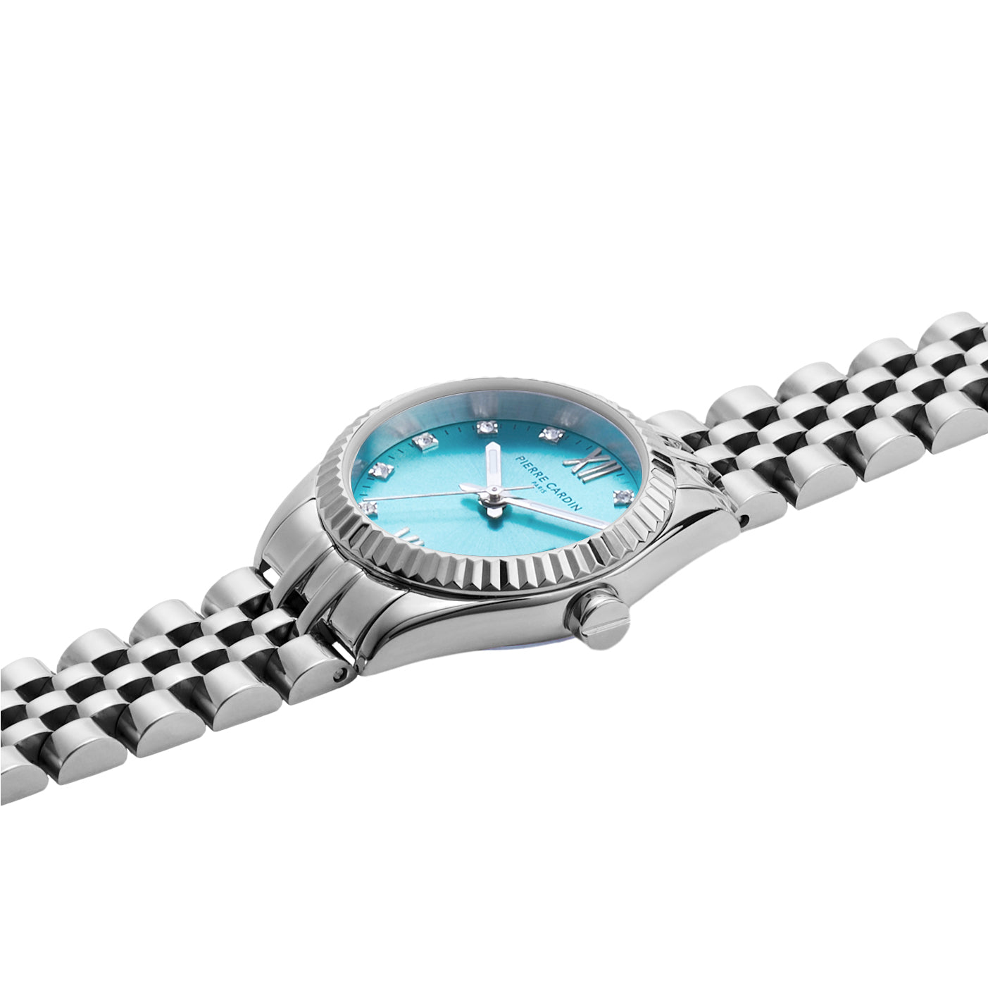Just like the elegant Opera region of Paris which is known for its theaters, this Pierre Cardin watch is elegant and mesmerising. The fluted bezel adds a touch of luxury, this beautiful watch is made in stainless steel with white Tiffany blue dial and Crystals on indexes. The watch also features a date function. The flawless stainless steel watch case lends a delicate and matching stainless steel metal link watch strap adds an additional hint of classic luxury.